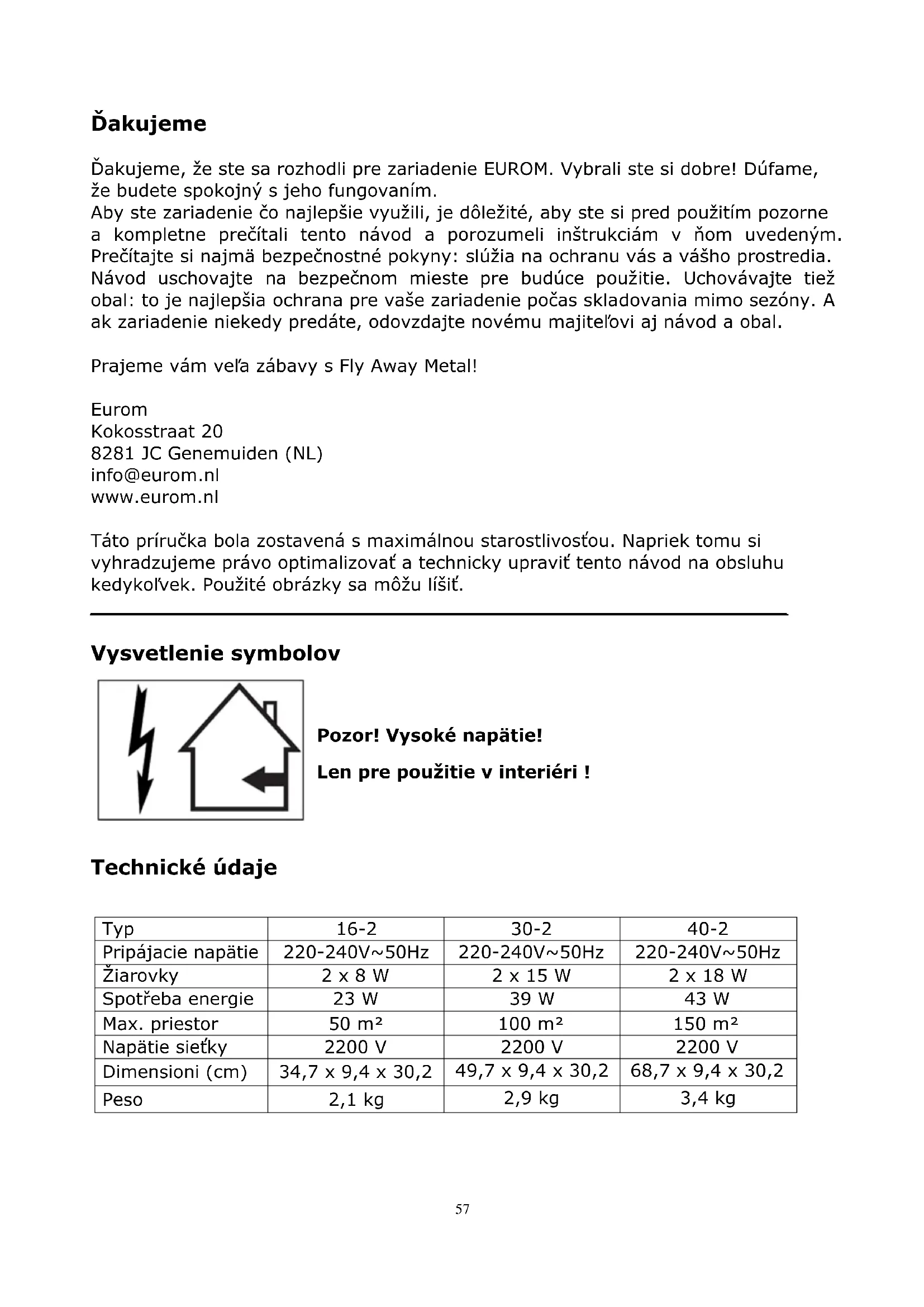 Ďakujeme Ďakujeme, že ste sa rozhodli pre zariadenie EUROM. Vybrali ste si dobre! Dúfame, že budete spokojný s jeho fungovaním. Aby ste zariadenie čo najlepšie využili, je dôležité, aby ste si pred použitím pozorne a kompletne prečítali tento návod a porozumeli inštrukciám v ňom uvedeným. Prečítajte si najmä bezpečnostné pokyny: slúžia na ochranu vás a vášho prostredia. Návod uschovajte na bezpečnom mieste pre budúce použitie. Uchovávajte tiež obal: to je najlepšia ochrana pre vaše zariadenie počas skladovania mimo sezóny. A ak zariadenie niekedy predáte, odovzdajte novému majiteľovi aj návod a obal. Prajeme vám veľa zábavy s Fly Away Metal! Eurom Kokosstraat 20 8281 JC Genemuiden (NL) info@eurom.nl www.eurom.nl Táto príručka bola zostavená s maximálnou starostlivosťou. Napriek tomu si vyhradzujeme právo optimalizovať a technicky upraviť tento návod na obsluhu kedykoľvek. Použité obrázky sa môžu líšiť.