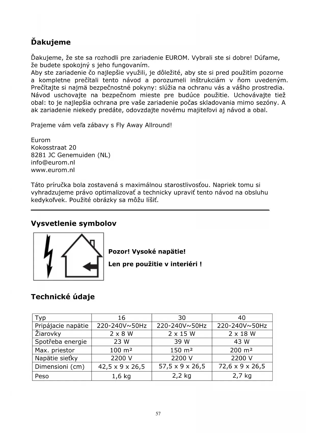 Ďakujeme Ďakujeme, že ste sa rozhodli pre zariadenie EUROM. Vybrali ste si dobre! Dúfame, že budete spokojný s jeho fungovaním. Aby ste zariadenie čo najlepšie využili, je dôležité, aby ste si pred použitím pozorne a kompletne prečítali tento návod a porozumeli inštrukciám v ňom uvedeným. Prečítajte si najmä bezpečnostné pokyny: slúžia na ochranu vás a vášho prostredia. Návod uschovajte na bezpečnom mieste pre budúce použitie. Uchovávajte tiež obal: to je najlepšia ochrana pre vaše zariadenie počas skladovania mimo sezóny. A ak zariadenie niekedy predáte, odovzdajte novému majiteľovi aj návod a obal. Prajeme vám veľa zábavy s Fly Away Allround! Eurom Kokosstraat 20 8281 JC Genemuiden (NL) info@eurom.nl www.eurom.nl Táto príručka bola zostavená s maximálnou starostlivosťou. Napriek tomu si vyhradzujeme právo optimalizovať a technicky upraviť tento návod na obsluhu kedykoľvek. Použité obrázky sa môžu líšiť.