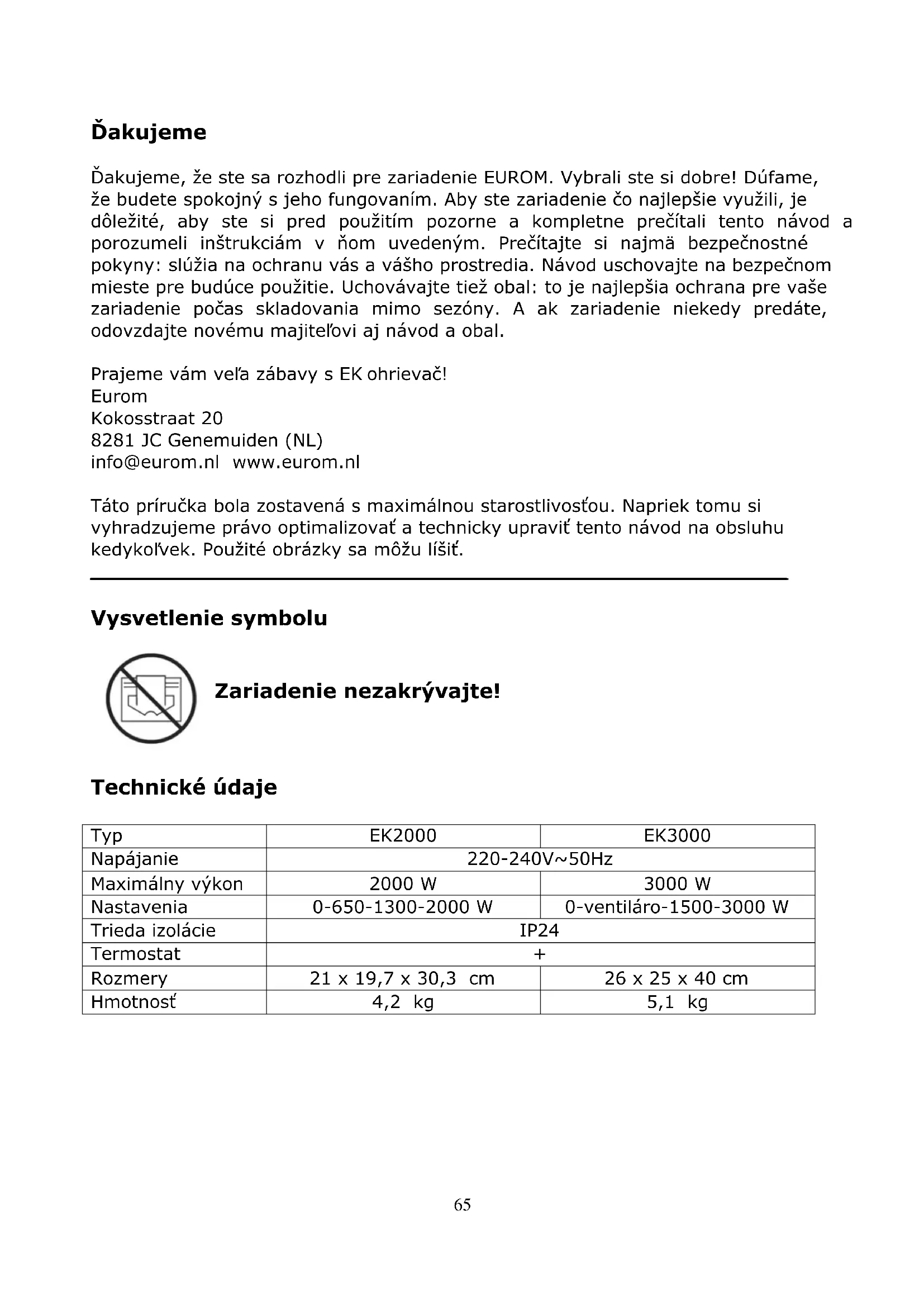 Na ľavej strane sa nachádza volič režimu so 4 polohami. Zhora dole: - O alebo vypnuté - iba ventilátor - výkon 1500 W - výkon 3000 W Na pravej strane sa nachádza plynule nastaviteľný termostat. Umiestnenie a pripojenie Odstráňte všetok obalový materiál a udržujte mimo dosahu detí. Po odstránení balenia skontrolujte zariadenie na poškodenie a ostatné znaky, ktoré by mohli indikovať poruchu/chybu/zlyhanie. V prípade pochybností zariadenie nepoužívajte, ale kontaktujte svojho predajcu, aby zariadenie skontroloval alebo vymenil.72 Vyberte vhodné miesto pre zariadenie s prihliadnutím na všetky vyššie uvedené upozornenia v tomto návode. Uistite sa, že je prístroj vypnutý (nastavený v polohe O), potom ho pripojte k správne fungujúcej 230 V – 50 Hz zásuvke. Ohrievač pripájajte iba k uzemnenej zásuvke! Nastavenie a prevádzka Pri prvom použití ohrievača (alebo ak chcete znovu nastaviť požadovanú teplotu), otočte termostat do maximálnej polohy (čo najďalej proti smeru hodinových ručičiek). Pomocou prepínača režimov nastavte prístroj podľa vlastných požiadaviek. Hneď, ako teplota v priestore dosiahne požadovanú úroveň, pomaly otáčajte termostatom proti smeru hodinových ručičiek. Ohrievač bude automaticky udržiavať teplotu na tejto úrovni. Teplota sa udržuje zapínaním a vypínaním vykurovacích telies, keď teplota príliš stúpne alebo klesne. Poznámka! Keď termostat vypne vykurovacie telesá, ventilátor stále pracuje. Takýmto spôsobom sa vzduch neustále udržiava v pohybe, čo prístroju umožňuje prísne merať ochladenie priestoru. Termostat je plynule nastaviteľný. Vyššiu teplotu nastavíte otáčaním v smere hodinových ručičiek, nižšiu teplotu otáčaním proti smeru hodinových ručičiek. Bezpečnostné prvky Ochrana proti prehriatiu V prípade interného prehriatia sa ohrievač vypne: ochrana proti prehriatiu. V prípade, že sa vykurovanie vypne z dôvodu prehriatia, okamžite prepnite prepínač do polohy O, odpojte a nechajte ohrievač chladnúť najmenej 10 minút. Teoreticky je teraz možné pokračovať v normálnej prevádzke. Prehrievanie zariadenia však má obvyklú príčinu: ohrievač nemôže dostatočne uvoľňovať svoje teplo alebo nasávať čerstvý vzduch (pretože je prístroj zakrytý, sú zablokované výstupy, ohrievač sa nachádza blízko steny atď.). Pred ďalším použitím ohrievača odstráňte príčinu prehrievania. Ak nemôžete nájsť príčinu a prehriatie sa opakuje, prestaňte prístroj používať a kontaktujte svojho predajcu/certifikovaného elektrotechnika a požiadajte o kontrolu/opravu. Prehriatie predstavuje vážne riziko požiaru! Čistenie a údržba Ohrievač udržujte v čistote. Čiastočky prachu a špiny v zariadení sú bežnou príčinou prehriatia, preto by ste ich mali pravidelne odstraňovať. Pred čistením alebo pred údržbou vypnite ohrievač, odpojte zástrčku zo zásuvky a ohrievač nechajte vychladnúť. Vonkajšok ohrievača pravidelne utierajte suchou alebo mierne navlhčenou látkou. Nepoužívajte agresívne mydlá, spreje, čistiace prostriedky ani abrazívne vosky, leštidlá alebo chemické roztoky!73 Pomocou vysávača opatrne odstráňte všetku špinu a prach z mriežok a uistite sa, že otvory vstupu a výstupu vzduchu sú čisté. Dávajte pozor, aby ste sa počas čistenia nedotkli alebo nepoškodili žiadne vnútorné časti! Ohrievač neobsahuje žiadne ďalšie časti, ktoré si vyžadujú údržbu. Ak je to možné, na konci sezóny uskladnite ohrievač v originálnom balení. Uskladňujte ho vo vzpriamenej polohe na chladnom, suchom a bezprašnom mieste. Likvidácia V rámci EÚ daný symbol znamená, že tento výrobok sa nesmie likvidovať s bežným komunálnym odpadom. Použité zariadenia obsahujú cenné materiály, vhodné na opätovné využitie. Je potrebné ich recyklovať, aby sa zabránilo poškodeniu životného prostredia a zdravia v dôsledku neregulovanej likvidácie odpadu. Použité zariadenie preto odneste na zberné miesto, ktoré je na to určené, alebo kontaktujte pôvodného dodávateľa, u ktorého ste zariadenie kúpili. Môže zabezpečiť, aby sa mohlo čo najviac súčiastok zariadenia recyklovať. CE stanovisko Pozri stánku 83.74 Mulţumim Vă mulţumim pentru că aţi ales un dispozitiv EUROM. Aţi făcut o alegere bună! Sperăm că va funcţiona spre deplina dvs. satisfacţie. Pentru a profita la maxim de dispoziti, înainte de a-l utiliza asiguraţi-vă că parcurgeţi cu atenţie şi înţelegeţi aceste instrucţiuni. Acordaţi atenţie specială instrucţiunilor de siguranţă; acestea sunt destinate a vă proteja pe dvs. personal şi mediul în care trăiţi! Păstraţi instrucţiunile pentru a le putea reciti la nevoie. Păstrați de asemenea ambalajul: aceasta este cea mai bună protecție a dispozitivului în timpul stocării în afara sezonului. Dacă daţi şi altcuiva aparatul, nu uitaţi să-i daţi şi instrucţiunile şi ambalajul. Vă dorim multă distracție cu EK încălzitor! Eurom Kokosstraat 20 8281 JC Genemuiden info@eurom.nl www.eurom.nl Acest manual a fost compilat cu maximă atenție. Cu toate acestea, ne rezervăm dreptul de a optimiza și de a modifica din punct de vedere tehnic aceste instrucțiuni de utilizare în orice moment. Imaginile folosite pot diferi.