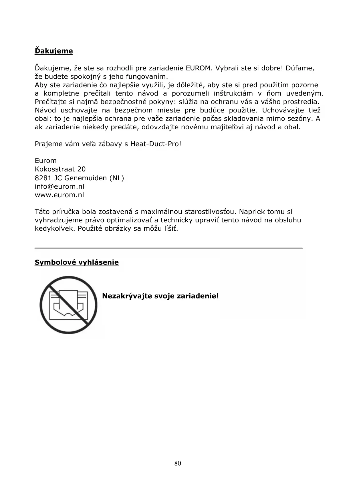 popísané v tomto návode na používanie. Nedodržanie pokynov 23, 24 a 25 môže viesť k poškodeniu, požiaru a/alebo poraneniu osôb. Nedodržanie týchto pokynov tiež ruší platnosť záruky a zodpovednosť predajcu, dovozcu a/alebo výrobcu za akékoľvek následky! Popis Ohrievače EUROM HEAT-DUCT-PRO sú skutočné radiátory s výkonným ventilátorom, ktorým prechádza veľké množstvo vzduchu. Studený vzduch je nasávaný zozadu, ohreje sa a potom je vyfukovaný ako horúci vzduch. Vzhľadom na to, že sa nasáva relatívne veľké množstvo vzduchu a vyfukuje sa von, nie je vyfukovaný vzduch príliš horúci. Ohrievaním a vyfukovaním veľkého množstva vzduchu sa však postupne vyhreje celý priestor (a nie iba vzduch okolo vykurovacieho telesa). Na výstupný otvor ohrievača Heat-Duct-Pro možno pripojiť hadicu (max. 5 m) s cieľom viesť fúkaný horúci vzduch na iné miesto. Preto má ohrievač aj silný ventilátor a silný vzduchový prúd. Ohrievač je vybavený termostatom a ochranou proti prehriatiu. Heat-Duct-Pro 3+9