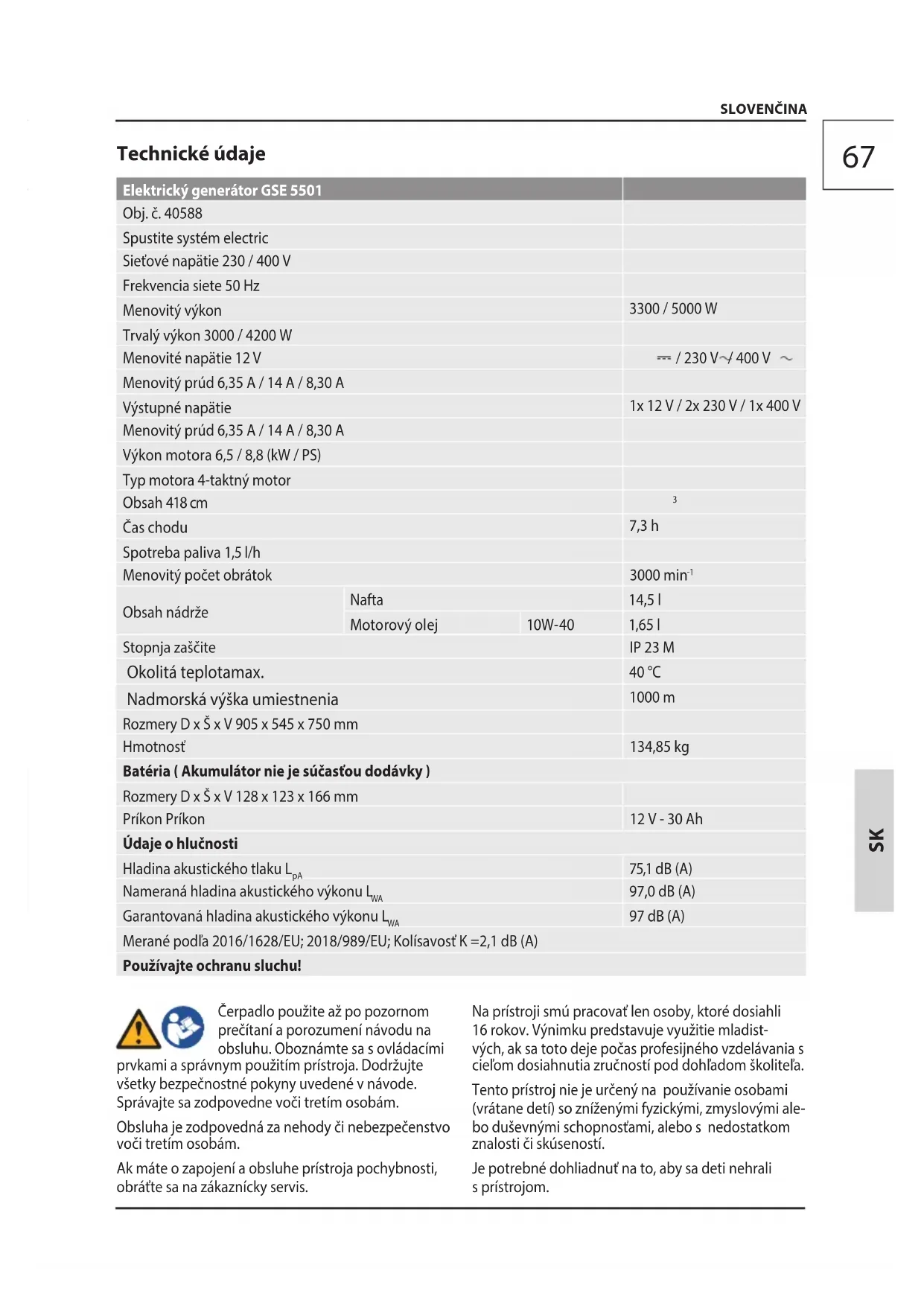 97 dB (A) Merané podľa 2016/1628/EU; 2018/989/EU; Kolísavosť K =2,1 dB (A) Používajte ochranu sluchu! Čerpadlo použite až po pozornom prečítaní a porozumení návodu na obsluhu. Oboznámte sa s ovládacími prvkami a správnym použitím prístroja. Dodržujte všetky bezpečnostné pokyny uvedené v návode. Správajte sa zodpovedne voči tretím osobám. Obsluha je zodpovedná za nehody či nebezpečenstvo voči tretím osobám. Ak máte o zapojení a obsluhe prístroja pochybnosti, obráťte sa na zákaznícky servis. Na prístroji smú pracovať len osoby, ktorédosiahli 16 rokov. Výnimku predstavuje využitie mladist