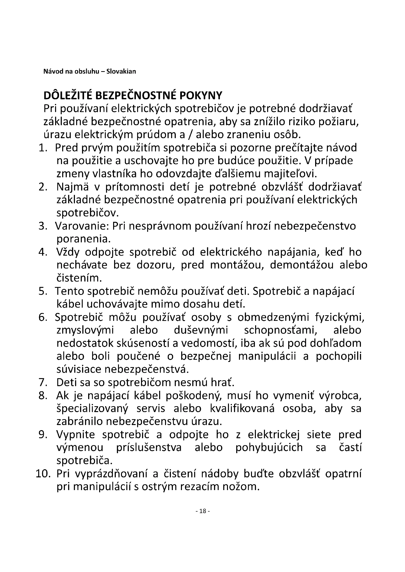 1. Pred prvým použitím spotrebiča si pozorne prečítajte návod