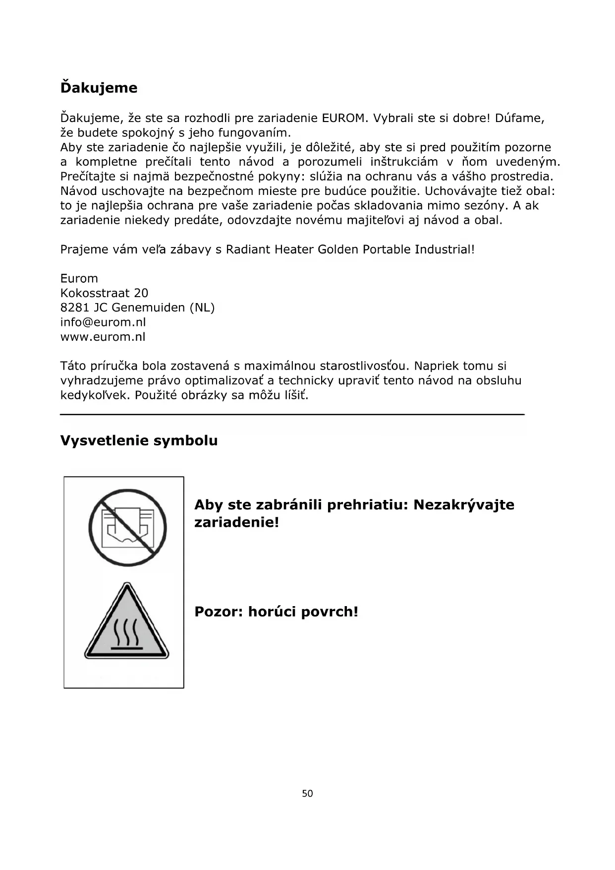 CE-prohlášení Vis strana 59.50 Ďakujeme Ďakujeme, že ste sa rozhodli pre zariadenie EUROM. Vybrali ste si dobre! Dúfame, že budete spokojný s jeho fungovaním. Aby ste zariadenie čo najlepšie využili, je dôležité, aby ste si pred použitím pozorne a kompletne prečítali tento návod a porozumeli inštrukciám v ňom uvedeným. Prečítajte si najmä bezpečnostné pokyny: slúžia na ochranu vás a vášho prostredia. Návod uschovajte na bezpečnom mieste pre budúce použitie. Uchovávajte tiež obal: to je najlepšia ochrana pre vaše zariadenie počas skladovania mimo sezóny. A ak zariadenie niekedy predáte, odovzdajte novému majiteľovi aj návod a obal. Prajeme vám veľa zábavy s Radiant Heater Golden Portable Industrial! Eurom Kokosstraat 20 8281 JC Genemuiden (NL) info@eurom.nl www.eurom.nl Táto príručka bola zostavená s maximálnou starostlivosťou. Napriek tomu si vyhradzujeme právo optimalizovať a technicky upraviť tento návod na obsluhu kedykoľvek. Použité obrázky sa môžu líšiť.