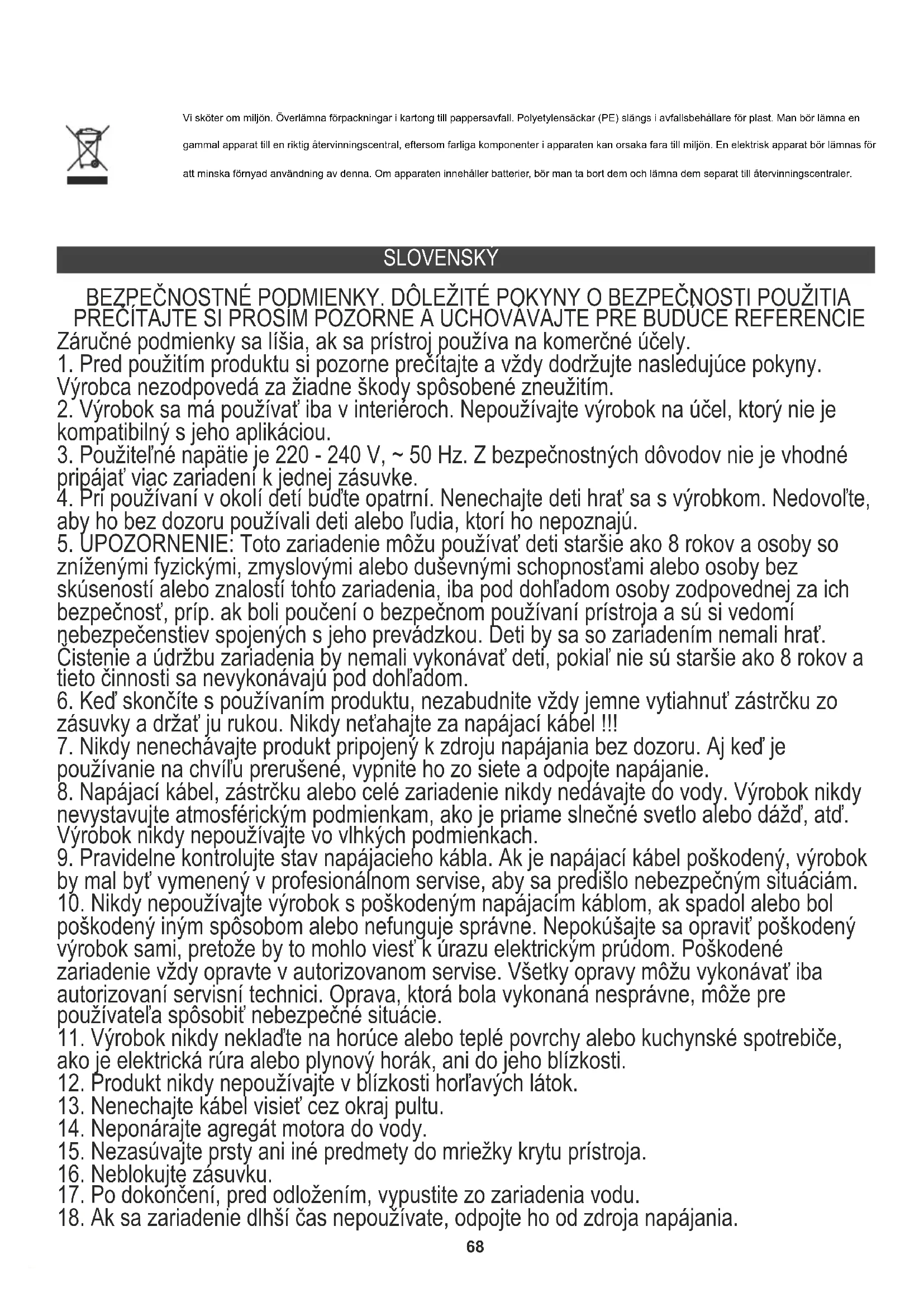 zníženými fyzickými, zmyslovými alebo duševnými schopnosťami alebo osoby bez skúseností alebo znalostí tohto zariadenia, iba pod dohľadom osoby zodpovednej za ich bezpečnosť, príp. ak boli poučení o bezpečnom používaní prístroja a sú si vedomí nebezpečenstiev spojených s jeho prevádzkou. Deti by sa so zariadením nemali hrať. Čistenie a údržbu zariadenia by nemali vykonávať deti, pokiaľ nie sú staršie ako 8 rokov a tieto činnosti sa nevykonávajú pod dohľadom.