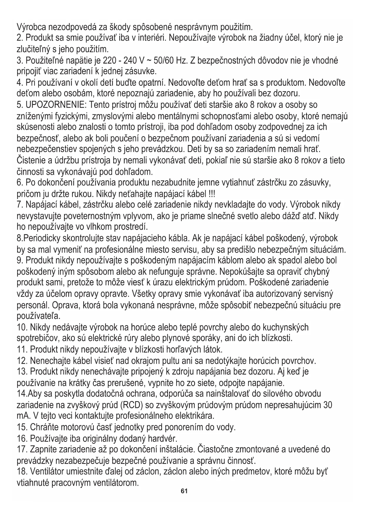 19. Do krytu ventilátora nevkladajte žiadne predmety. V opačnom prípade môže dôjsť k