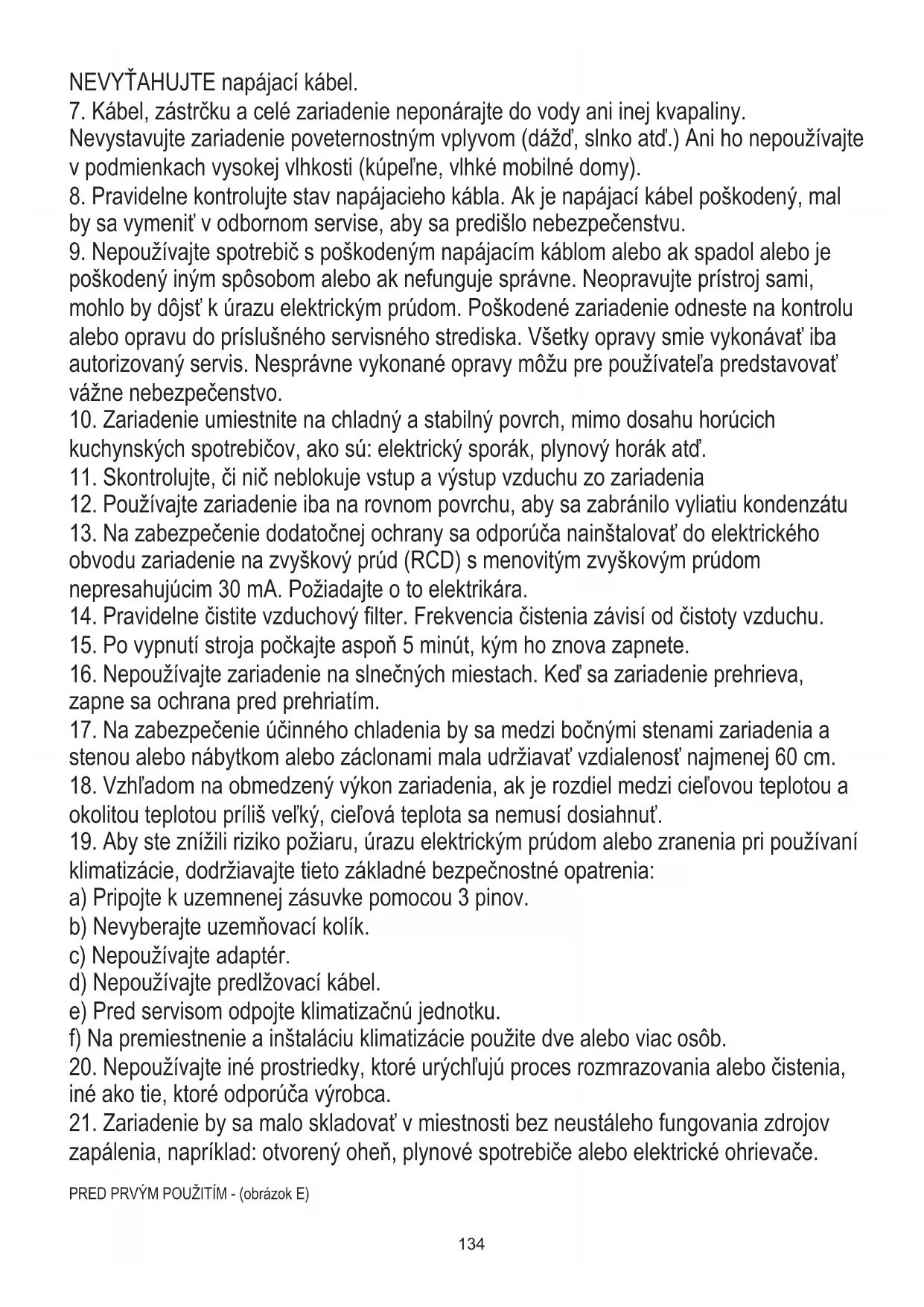 klimatizácie, dodržiavajte tieto základné bezpečnostné opatrenia: a) Pripojte k uzemnenej zásuvke pomocou 3 pinov. b) Nevyberajte uzemňovací kolík. c) Nepoužívajte adaptér. d) Nepoužívajte predlžovací kábel. e) Pred servisom odpojte klimatizačnú jednotku. f) Na premiestnenie a inštaláciu klimatizácie použite dve alebo viac osôb.