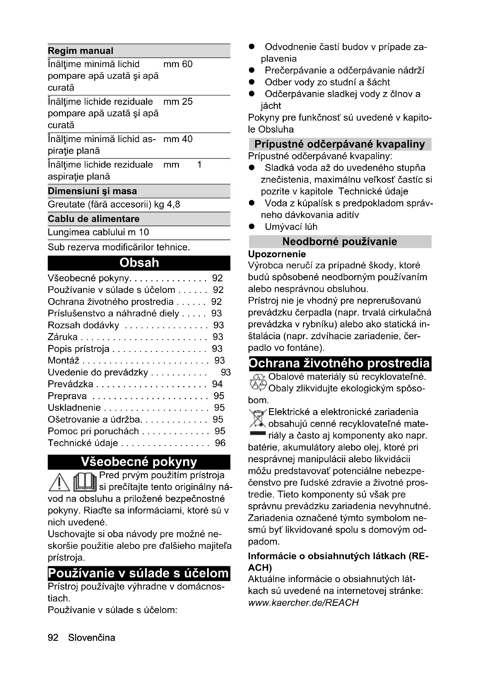 - Înălţime de oprire comuta- tor cu flotor (blocarea în poziţia inferioară) mm 40-12092 Slovenčina Sub rezerva modificărilor tehnice. Obsah Všeobecné pokyny Pred prvým použitím prístroja si prečítajte tento originálny ná- vod na obsluhu a priložené bezpečnostné pokyny. Riaďte sa informáciami, ktoré sú v nich uvedené. Uschovajte si oba návody pre možné ne- skoršie použitie alebo pre ďalšieho majiteľa prístroja. Používanie v súlade s účelom Prístroj používajte výhradne v domácnos- tiach. Používanie v súlade s účelom: Odvodnenie častí budov v prípade za- plavenia Prečerpávanie a odčerpávanie nádrží Odber vody zo studní a šácht Odčerpávanie sladkej vody z člnov a jácht Pokyny pre funkčnosť sú uvedené v kapito- le Obsluha Prípustné odčerpávané kvapaliny Prípustné odčerpávané kvapaliny: Sladká voda až do uvedeného stupňa znečistenia, maximálnu veľkosť častíc si pozrite v kapitole Technické údaje Voda z kúpalísk s predpokladom správ- neho dávkovania aditív Umývací lúh Neodborné používanie Upozornenie Výrobca neručí za prípadné škody, ktoré budú spôsobené neodborným používaním alebo nesprávnou obsluhou. Prístroj nie je vhodný pre neprerušovanú prevádzku čerpadla (napr. trvalá cirkulačná prevádzka v rybníku) alebo ako statická in- štalácia (napr. zdvíhacie zariadenie, čer- padlo vo fontáne). Ochrana životného prostredia Obalové materiály sú recyklovateľné. Obaly zlikvidujte ekologickým spôso- bom. Elektrické a elektronické zariadenia obsahujú cenné recyklovateľné mate- riály a často aj komponenty ako napr. batérie, akumulátory alebo olej, ktoré pri nesprávnej manipulácii alebo likvidácii môžu predstavovať potenciálne nebezpe- čenstvo pre ľudské zdravie a životné pros- tredie. Tieto komponenty sú však pre správnu prevádzku zariadenia nevyhnutné. Zariadenia označené týmto symbolom ne- smú byť likvidované spolu s domovým od- padom. Informácie o obsiahnutých látkach (RE- ACH) Aktuálne informácie o obsiahnutých lát- kach sú uvedené na internetovej stránke: www.kaercher.de/REACH Regim manual Înălţime minimă lichid pompare apă uzată şi apă curată mm 60 Înălţime lichide reziduale pompare apă uzată şi apă curată mm 25 Înălţime minimă lichid as- piraţie plană mm 40 Înălţime lichide reziduale aspiraţie plană mm 1 Dimensiuni şi masa Greutate (fără accesorii) kg 4,8 Cablu de alimentare Lungimea cablului m 10 Všeobecné pokyny p. 92