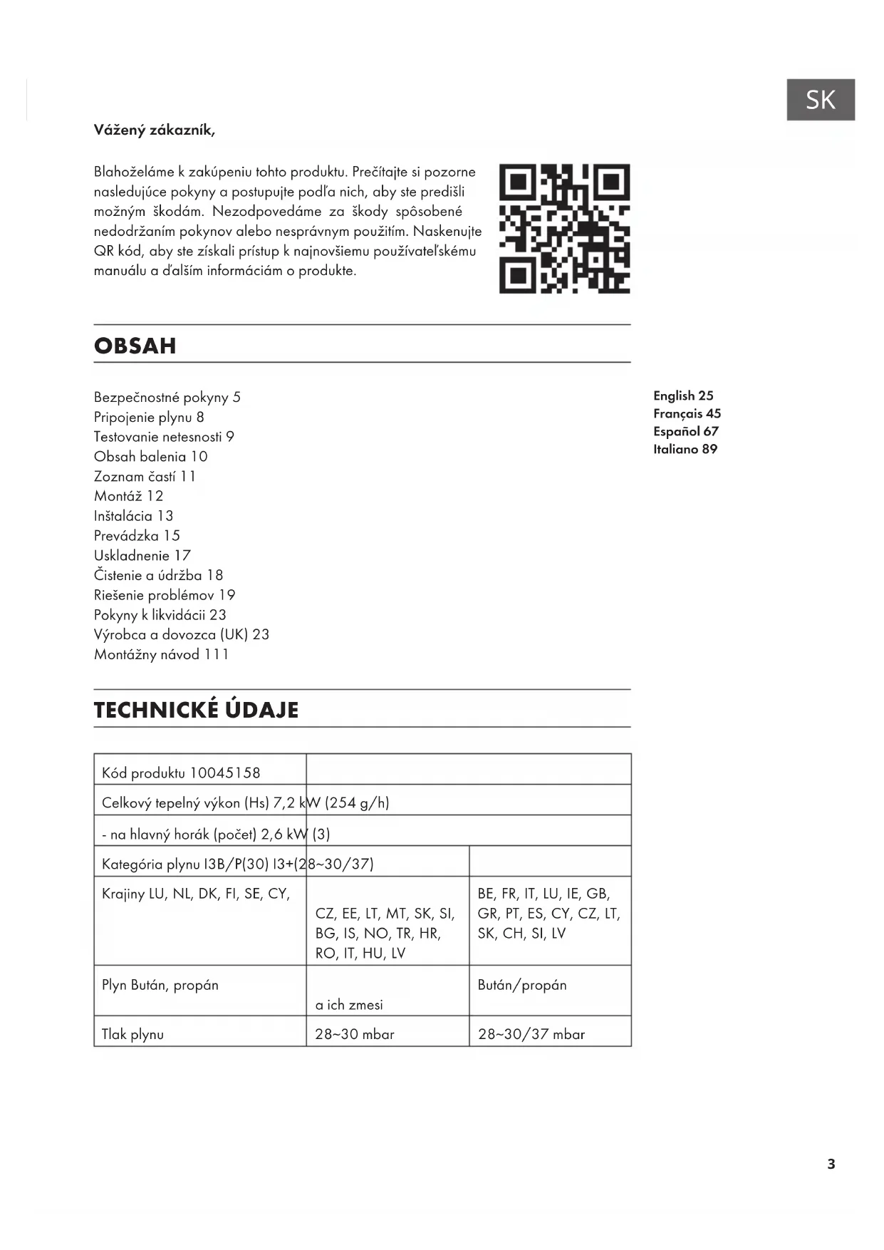 Vážený zákazník, Blahoželáme k zakúpeniu tohto produktu. Prečítajte si pozorne nasledujúce pokyny a postupujte podľa nich, aby ste predišli možným škodám. Nezodpovedáme za škody spôsobené nedodržaním pokynov alebo nesprávnym použitím. Naskenujte QR kód, aby ste získali prístup k najnovšiemu používateľskému manuálu a ďalším informáciám o produkte. OBSAH Bezpečnostné pokyny5 Pripojenie plynu8 Testovanie netesnosti9 Obsah balenia10 Zoznam častí11 Montáž12 Inštalácia13 Prevádzka15 Uskladnenie17 Čistenie a údržba18 Riešenie problémov19 Pokyny k likvidácii23 Výrobca a dovozca (UK)23 Montážny návod111 TECHNICKÉ ÚDAJE Kód produktu 10045158 Celkový tepelný výkon (Hs) 7,2 kW (254g/h) - na hlavný horák (počet) 2,6 kW (3) Kategória plynu I3B/P(30) I3+(28~30/37) Krajiny LU, NL, DK, FI, SE, CY, CZ, EE, LT, MT, SK, SI, BG, IS, NO, TR, HR, RO, IT, HU, LV BE, FR, IT, LU, IE, GB, GR, PT, ES, CY, CZ, LT, SK, CH, SI, LV Plyn Bután, propán a ich zmesi Bután/propán Tlak plynu 28~30 mbar 28~30/37 mbar English 25 Français 45 Español 67 Italiano 894