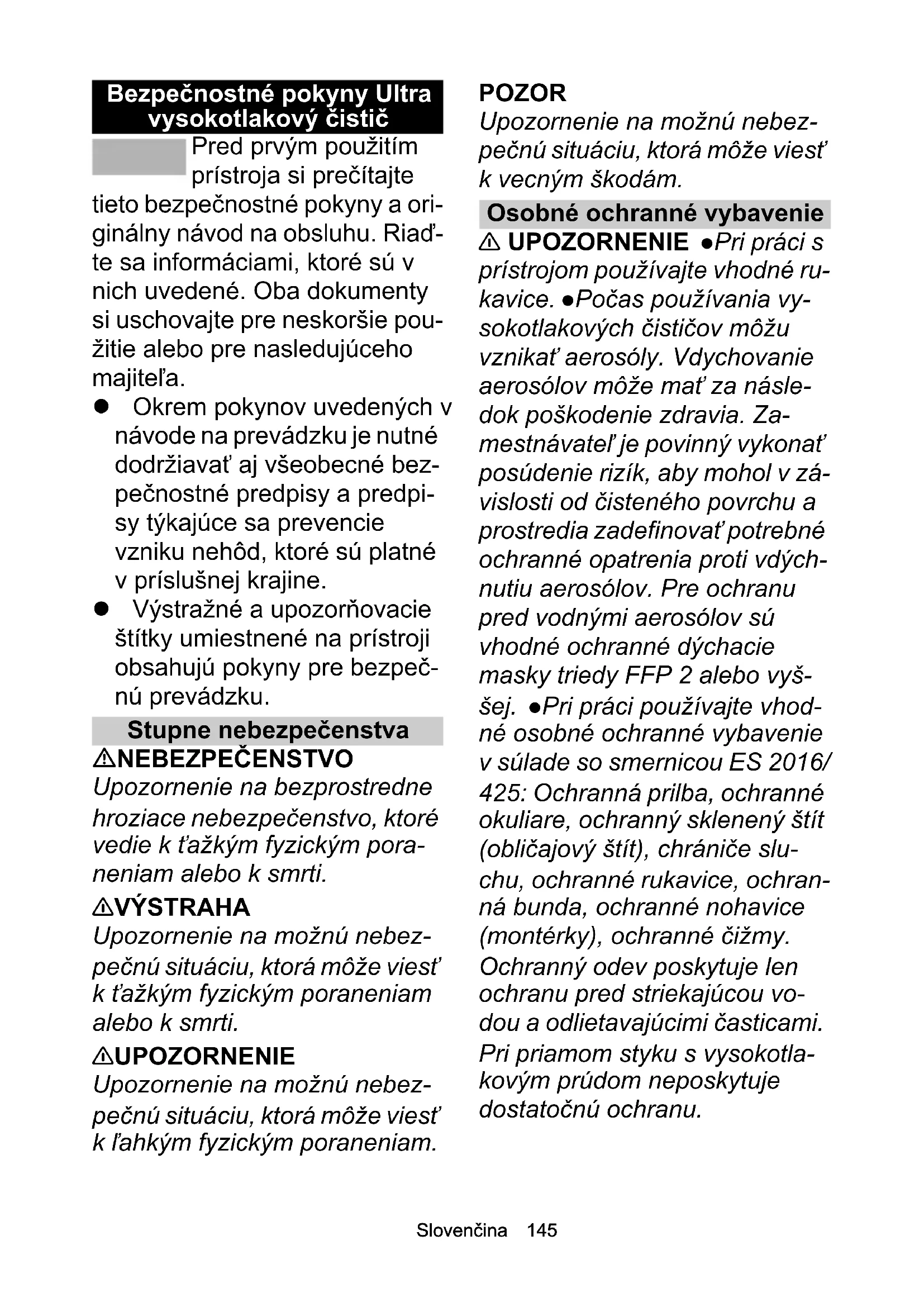Nu închideţi niciodată orificiile de evacuare. Asiguraţi-vă că în apropierea orificiilor de admisie a aerului nu apar emisii de gaze de ardere. Respectaţi instrucţi- unile de siguranţă referitoare la aparatele pe benzină din In- strucţiunile de funcţionare. Îngrijirea şi întreţinerea 몇 AVERTIZARE Înainte de curăţarea, întreţinerea şi înlocu- irea pieselor, trebuie să opriţi aparatul şi să scoateţi fișa din priză. Înainte de orice lucrare la aparat şi accesorii, depresurizaţi sistemul de înaltă presiune. 몇 PRECAUŢIE Reparaţiile trebuie efectuate doar de către unităţi de service autorizate sau de personal calificat în acest do- meniu, care sunt familiarizaţi cu toate reglementările relevante referitoare la siguranţă. Puneţi din nou în funcţiune aparatul doar după eliminarea tuturor perturbaţiilor. ATENŢIE Respectaţi verifica- rea de siguranţă pentru aparate- le comerciale utilizate la nivel local, în conformitate cu regle- mentările locale Scurtcircuite sau alte deteriorări. Nu curăţaţi aparatul cu jet de apă prin furtun sau jet de apă de înaltă presiu- ne. Nu utilizaţi acetonă, acizi nediluaţi sau diluanţi, deoarece pot deteriora materialele folosite la fabricarea aparatului. Accesorii şi piese de schimb 몇 PRECAUŢIE Folosiţi doar accesorii şi piese de schimb sunt recomandate de producă- tor. Accesoriile originale şi pie- sele de schimb originale asigură funcţionarea în siguranţă şi fără avarii a aparatului. Reparaţiile şi montarea pieselor de schimb trebuie efectuate doar de către personal de service autorizat, iar astfel dvs. evitaţi pericolele. Transport 몇 PRECAUŢIE Opriţi aparatul înainte de transport. Fixaţi apa- ratul ţinând cont de greutate, vezi capitolul Date tehnice din Instrucţiunile de funcţionare. Pericol de accidente şi răniri. Respectaţi greutatea aparatului în caz de transport şi depozitare, vezi capitolul Date tehnice din Instrucţiunile de funcţionare. În timpul transportului pe drumuri publice, respectaţi dispoziţiile le- gale din ţara respectivă. Utili- zaţi cabluri, lanţuri, echipamente de tracţiune şi mijloace de anco- rare a sarcinilor dotate cu sigu- ranţe, care corespund prevederilor aplicabile.Slovenčina 145 Bezpečnostné pokyny Ultra vysokotlakový čistič Pred prvým použitím prístroja si prečítajte tieto bezpečnostné pokyny a ori- ginálny návod na obsluhu. Riaď- te sa informáciami, ktoré sú v nich uvedené. Oba dokumenty si uschovajte pre neskoršie pou- žitie alebo pre nasledujúceho majiteľa. Okrem pokynov uvedených v návode na prevádzku je nutné dodržiavať aj všeobecné bez- pečnostné predpisy a predpi- sy týkajúce sa prevencie vzniku nehôd, ktoré sú platné v príslušnej krajine. Výstražné a upozorňovacie štítky umiestnené na prístroji obsahujú pokyny pre bezpeč- nú prevádzku. Stupne nebezpečenstva NEBEZPEČENSTVO Upozornenie na bezprostredne hroziace nebezpečenstvo, ktoré vedie k ťažkým fyzickým pora- neniam alebo k smrti. 몇 VÝSTRAHA Upozornenie na možnú nebez- pečnú situáciu, ktorá môže viesť k ťažkým fyzickým poraneniam alebo k smrti. 몇 UPOZORNENIE Upozornenie na možnú nebez- pečnú situáciu, ktorá môže viesť k ľahkým fyzickým poraneniam. POZOR Upozornenie na možnú nebez- pečnú situáciu, ktorá môže viesť k vecným škodám. Osobné ochranné vybavenie 몇 UPOZORNENIE Pri práci s prístrojom používajte vhodné ru- kavice. Počas používania vy- sokotlakových čističov môžu vznikať aerosóly. Vdychovanie aerosólov môže mať za násle- dok poškodenie zdravia. Za- mestnávateľ je povinný vykonať posúdenie rizík, aby mohol v zá- vislosti od čisteného povrchu a prostredia zadefinovať potrebné ochranné opatrenia proti vdých- nutiu aerosólov. Pre ochranu pred vodnými aerosólov sú vhodné ochranné dýchacie masky triedy FFP 2 alebo vyš- šej. Pri práci používajte vhod- né osobné ochranné vybavenie v súlade so smernicou ES 2016/ 425: Ochranná prilba, ochranné okuliare, ochranný sklenený štít (obličajový štít), chrániče slu- chu, ochranné rukavice, ochran- ná bunda, ochranné nohavice (montérky), ochranné čižmy. Ochranný odev poskytuje len ochranu pred striekajúcou vo- dou a odlietavajúcimi časticami. Pri priamom styku s vysokotla- kovým prúdom neposkytuje dostatočnú ochranu.146 Slovenčina Všeobecné bezpečnostné pokyny NEBEZPEČENSTVO Ne- bezpečenstvo zadusenia. Oba- lové fólie uchovávajte mimo dosahu detí. 몇 VÝSTRAHA Prístroj použí- vajte len v súlade s účelom. Zohľadnite miestne danosti a pri práci s prístrojom dávajte pozor na tretie osoby, obzvlášť na deti. l Tento prístroj nesmú použí- vať deti a osoby s obmedzenými telesnými, zmyslovými alebo duševnými schopnosťami alebo s nedostatkom skúseností a/ale- bo vedomostí. Prístroj smú používať len osoby, ktoré boli poučené o manipulácii s prístro- jom alebo preukázali schopnosti na obsluhu a boli výslovne pove- rené touto činnosťou. Dozeraj- te na deti, aby sa nemohli hrať so zariadením. Deti a mladiství nesmú používať tento prístroj. 몇 UPOZORNENIE Bezpeč- nostné zariadenia slúžia na Vašu ochranu. Nikdy nemeňte ani neobchádzajte bezpečnost- né zariadenia. Nebezpečenstvo zasiahnutia elektrickým prúdom NEBEZPEČENSTVO Prí- stroje s triedou ochrany I sa smú pripojiť len do správne uzemne- ných zásuviek. Napätie uvede- né na typovom štítku sa musí zhodovať s napätím zdroja prú- du. Dodržiavajte minimálne is- tenie zásuvky, pozrite si kapitolu Technické údaje v návode na prevádzku. Prístroj používajte len s ochranným vypínačom proti chybnému prúdu (maximál- ne 30 mA). Prístroj pomocou zástrčky spojte s elektrickou sie- ťou. Neoddeliteľné spojenie s elektrickou sieťou je zakázané. Zástrčka slúži na oddelenie od siete. Sieťovej zást