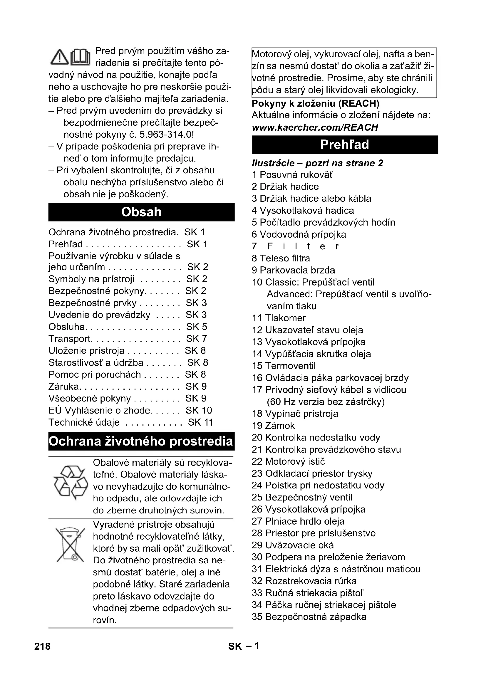 dB(A) 101 Motivul excepției conform Regulamentului (UE) 2019/1781 anexa I secțiunea 2 punctul (12): j) 217RO– 1 Pred prvým použitím vášho za- riadenia si prečítajte tento pô- vodný návod na použitie, konajte podľa neho a uschovajte ho pre neskoršie použi- tie alebo pre ďalšieho majiteľa zariadenia. – Pred prvým uvedením do prevádzky si bezpodmienečne prečítajte bezpeč- nostné pokyny č. 5.963-314.0! – V prípade poškodenia pri preprave ih- neď o tom informujte predajcu. – Pri vybalení skontrolujte, či z obsahu obalu nechýba príslušenstvo alebo či obsah nie je poškodený. Pokyny k zloženiu (REACH) Aktuálne informácie o zložení nájdete na: www.kaercher.com/REACH Ilustrácie – pozri na strane 2 1 Posuvná rukoväť 2 Držiak hadice 3 Držiak hadice alebo kábla 4 Vysokotlaková hadica 5 Počítadlo prevádzkových hodín 6 Vodovodná prípojka 7Filter 8 Teleso filtra 9 Parkovacia brzda 10 Classic: Prepúšťací ventil Advanced: Prepúšťací ventil s uvoľňo- vaním tlaku 11 Tlakomer 12 Ukazovateľ stavu oleja 13 Vysokotlaková prípojka 14 Vypúšťacia skrutka oleja 15 Termoventil 16 Ovládacia páka parkovacej brzdy 17 Prívodný sieťový kábel s vidlicou (60 Hz verzia bez zástrčky) 18 Vypínač prístroja 19 Zámok 20 Kontrolka nedostatku vody 21 Kontrolka prevádzkového stavu 22 Motorový istič 23 Odkladací priestor trysky 24 Poistka pri nedostatku vody 25 Bezpečnostný ventil 26 Vysokotlaková prípojka 27 Plniace hrdlo oleja 28 Priestor pre príslušenstvo 29 Uväzovacie oká 30 Podpera na preloženie žeriavom 31 Elektrická dýza s nástrčnou maticou 32 Rozstrekovacia rúrka 33 Ručná striekacia pištoľ 34 Páčka ručnej striekacej pištole 35 Bezpečnostná západka Obsah Ochrana životného prostredia. SK 1 Prehľad . . . . . . . . . . . . . . . . . . SK 1 Používanie výrobku v súlade s jeho určením . . . . . . . . . . . . . . SK 2 Symboly na prístroji . . . . . . . . SK 2 Bezpečnostné pokyny. . . . . . . SK 2 Bezpečnostné prvky . . . . . . . . SK 3 Uvedenie do prevádzky . . . . . SK 3 Obsluha. . . . . . . . . . . . . . . . . . SK 5 Transport. . . . . . . . . . . . . . . . . SK 7 Uloženie prístroja . . . . . . . . . . SK 8 Starostlivosť a údržba . . . . . . . SK 8 Pomoc pri poruchách . . . . . . . SK 8 Záruka. . . . . . . . . . . . . . . . . . . SK 9 Všeobecné pokyny . . . . . . . . . SK 9 EÚ Vyhlásenie o zhode. . . . . . SK 10 Technické údaje . . . . . . . . . . . SK 11 Ochrana životného prostredia Obalové materiály sú recyklova- teľné. Obalové materiály láska- vo nevyhadzujte do komunálne- ho odpadu, ale odovzdajte ich do zberne druhotných surovín. Vyradené prístroje obsahujú hodnotné recyklovateľné látky, ktoré by sa mali opät' zužitkovat'. Do životného prostredia sa ne- smú dostat' batérie, olej a iné podobné látky. Staré zariadenia preto láskavo odovzdajte do vhodnej zberne odpadových su- rovín. Motorový olej, vykurovací olej, nafta a ben- zín sa nesmú dostat' do okolia a zat'ažit' ži- votné prostredie. Prosíme, aby ste chránili pôdu a starý olej likvidovali ekologicky. Prehľad 218 SK– 2 – Ovládacie prvky pre čistiaci proces sú žlté. – Ovládacie prvky pre údržbu a servis sú svetlosivé. Toto vysokotlakové čistiace zariadenie po- užívajte výhradne: – na čistenie strojov, vozidiel, stavieb, ná- strojov – s príslušenstvom a náhradnými dielmi schválenými firmou Kärcher. 몇 VÝSTRAHA Rešpektujte platné predpisy vodárenského podniku. Podľa platných predpisov sa ne- smie zariadenie prevádzkovať v sieti pitnej vody bez systémového oddeľovacieho zariadenia. Musíte použiť systémové oddeľovacie zariadenie firmy KÄRCHER alebo alternatívne systé- mové oddeľovacie zariadenie podľa EN 12729 typ BA. Voda, ktorá preteká cez systémový odlučo- vač, nie je pitná. 몇 UPOZORNENIE Systémové oddeľovacie zariadenie pripá- jajte vždy na zásobovanie vodou, nikdy nie priamo na prístroj. NEBEZPEČENSTVO Upozornenie na bezprostredne hroziace nebezpečenstvo, ktoré môže spôsobiť váž- ne zranenia alebo smrť. 몇 VÝSTRAHA Upozornenie na možnú nebezpečnú situ- áciu, ktorá by mohla viesť k vážnemu zra- neniu alebo smrti. 몇 UPOZORNENIE Upozornenie na možnú nebezpečnú situáciu, ktorá by mohla viesť k ľahkým zraneniam. POZOR Pozornenie na možnú nebezpečnú situáciu, ktorá by mohla viesť k vecným škodám. NEBEZPEČENSTVO Nebezpečenstvo zranenia! – Používajte len originálne vysokotlakové hadice. – Vysokotlaková hadica a striekacie za- riadenie musia by ť vhodné pre maxi- málny prevádzkový pretlak uvedený v technických údajoch. – Zabráňte kontaktu s chemikáliami. – Kontrolujte denne vysokotlakovú hadicu. Nepoužívajte prelomené hadice. Ak je zjavná vonkajšia poloha drôtu, vy- sokotlakovú hadicu ďalej nepoužívajte. Farebné označenie Používanie výrobku v súlade s jeho určením Symboly na prístroji Vysokotlakový prúd môže byť pri neodbor- nom použití nebezpečný. Prúd sa nesmie nasme- rovať na osoby, zvieratá, elektrické zariadenia pod napätím alebo na samot- né zariadenie. Nebezpečenstvo poškode- nia zamrznutím vody! V zime prístroj uložte do vyku- rovanej miestnosti alebo z neho vypustite vodu. Nebezpečenstvo poškode- nia sluchu. Pri práci s prí- strojom bezpodmienečne používajte vhodnú ochranu sluchu. Nebezpečenstvo zranenia! Noste ochranné okuliare. Nebezpečie popálenia horúcim povrchom! Výstraha pred nebezpeč- ným elektrickým napä- tím! Bezpečnostné pokyny Stupne nebezpečenstva Vysokotlaková hadica 219SK– 3 – Nepoužívajte vysokotlakovú hadicu s poškodeným závitom. – Vysokotlakovú hadicu položte tak, aby ju nebolo možné prejsť. – Nepoužívajte hadicu namáhanú prejde- ním, prelomením, rázmi ani vtedy, ak nie sú zjavné žiadne poškodenia. – Vysokotlakovú hadic