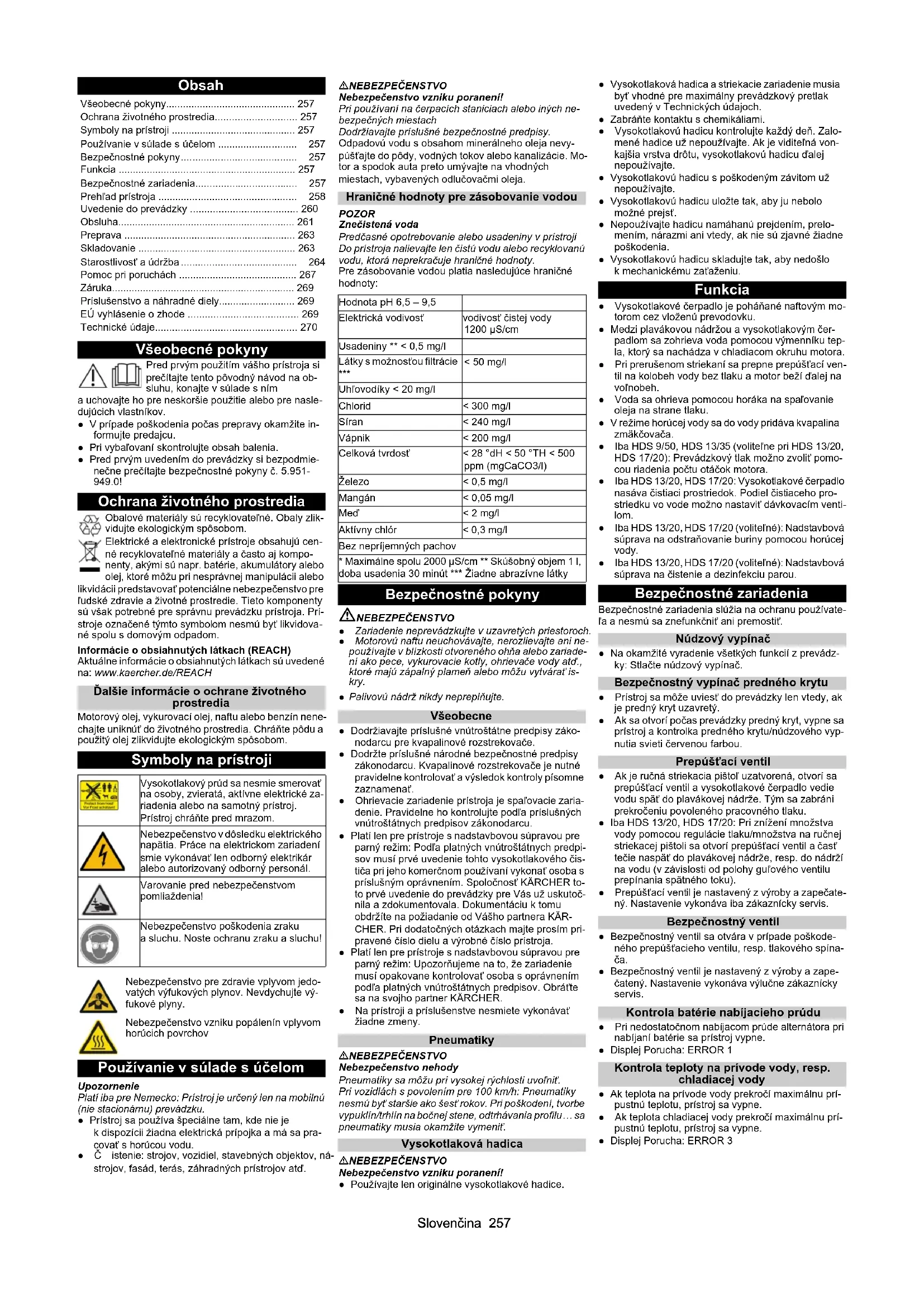- Technické údaje Vysokotlakový prúd sa nesmie smerovať na osoby, zvieratá, aktívne elektrické za- riadenia alebo na samotný prístroj. Prístroj chráňte pred mrazom. Nebezpečenstvo v dôsledku elektrického napätia. Práce na elektrickom zariadení smie vykonávať len odborný elektrikár alebo autorizovaný odborný personál. Varovanie pred nebezpečenstvom pomliaždenia! Nebezpečenstvo poškodenia zraku a sluchu. Noste ochranu zraku a sluchu! Nebezpečenstvo pre zdravie vplyvom jedo- vatých výfukových plynov. Nevdychujte vý- fukové plyny. Nebezpečenstvo vzniku popálenín vplyvom horúcich povrchov Hodnota pH 6,5 – 9,5 Elektrická vodivosť vodivosť čistej vody 1200 μS/cm Usadeniny ** < 0,5 mg/l Látky s možnosťou filtrácie p. 270