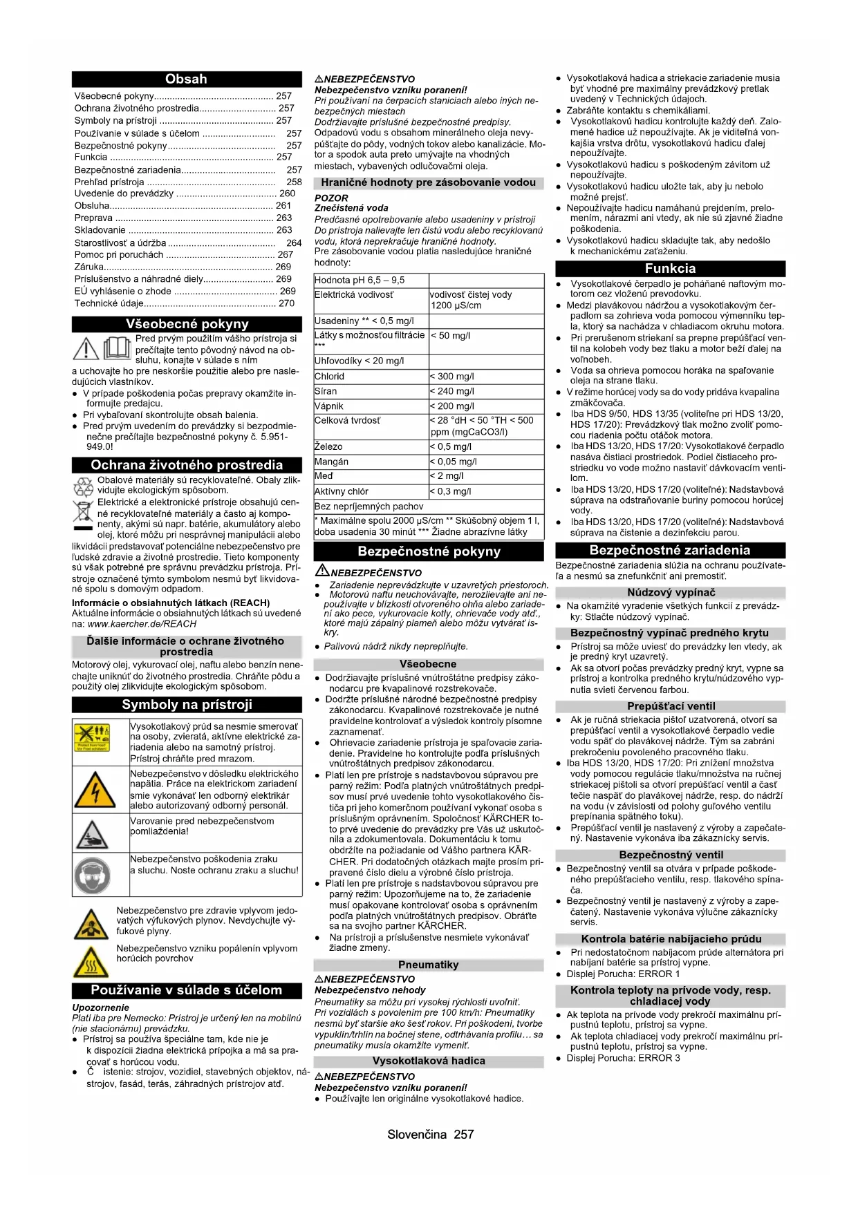 - Technické údaje Vysokotlakový prúd sa nesmie smerovať na osoby, zvieratá, aktívne elektrické za- riadenia alebo na samotný prístroj. Prístroj chráňte pred mrazom. Nebezpečenstvo v dôsledku elektrického napätia. Práce na elektrickom zariadení smie vykonávať len odborný elektrikár alebo autorizovaný odborný personál. Varovanie pred nebezpečenstvom pomliaždenia! Nebezpečenstvo poškodenia zraku a sluchu. Noste ochranu zraku a sluchu! Nebezpečenstvo pre zdravie vplyvom jedo- vatých výfukových plynov. Nevdychujte vý- fukové plyny. Nebezpečenstvo vzniku popálenín vplyvom horúcich povrchov Hodnota pH 6,5 – 9,5 Elektrická vodivosť vodivosť čistej vody 1200 μS/cm Usadeniny ** < 0,5 mg/l Látky s možnosťou filtrácie p. 270