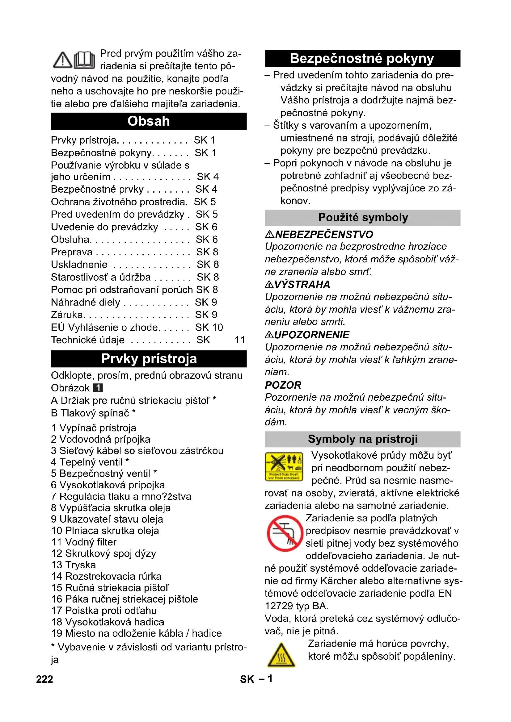 – Pred uvedením tohto zariadenia do pre- vádzky si prečítajte návod na obsluhu Vášho prístroja a dodržujte najmä bez- pečnostné pokyny. – Štítky s varovaním a upozornením, umiestnené na stroji, podávajú dôležité pokyny pre bezpečnú prevádzku. – Popri pokynoch v návode na obsluhu je potrebné zohľadniť aj všeobecné bez- pečnostné predpisy vyplývajúce zo zá- konov. NEBEZPEČENSTVO Upozornenie na bezprostredne hroziace nebezpečenstvo, ktoré môže spôsobiť váž- ne zranenia alebo smrť. 몇 VÝSTRAHA Upozornenie na možnú nebezpečnú situ- áciu, ktorá by mohla viesť k vážnemu zra- neniu alebo smrti. 몇 UPOZORNENIE Upozornenie na možnú nebezpečnú situ- áciu, ktorá by mohla viesť k ľahkým zrane- niam. POZOR Pozornenie na možnú nebezpečnú situ- áciu, ktorá by mohla viesť k vecným ško- dám. Vysokotlakové prúdy môžu byť pri neodbornom použití nebez- pečné. Prúd sa nesmie nasme- rovať na osoby, zvieratá, aktívne elektrické zariadenia alebo na samotné zariadenie. Zariadenie sa podľa platných predpisov nesmie prevádzkovať v sieti pitnej vody bez systémového oddeľovacieho zariadenia. Je nut- né použiť systémové oddeľovacie zariade- nie od firmy Kärcher alebo alternatívne sys- témové oddeľovacie zariadenie podľa EN 12729 typ BA. Voda, ktorá preteká cez systémový odlučo- vač, nie je pitná. Zariadenie má horúce povrchy, ktoré môžu spôsobiť popáleniny. Obsah Prvky prístroja. . . . . . . . . . . . . SK 1 Bezpečnostné pokyny. . . . . . . SK 1 Používanie výrobku v súlade s jeho určením . . . . . . . . . . . . . . SK 4 Bezpečnostné prvky . . . . . . . . SK 4 Ochrana životného prostredia. SK 5 Pred uvedením do prevádzky . SK 5 Uvedenie do prevádzky . . . . . SK 6 Obsluha. . . . . . . . . . . . . . . . . . SK 6 Preprava . . . . . . . . . . . . . . . . . SK 8 Uskladnenie . . . . . . . . . . . . . . SK 8 Starostlivosť a údržba . . . . . . . SK 8 Pomoc pri odstraňovaní porúch SK 8 Náhradné diely . . . . . . . . . . . . SK 9 Záruka. . . . . . . . . . . . . . . . . . . SK 9 EÚ Vyhlásenie o zhode. . . . . . SK 10 Technické údaje . . . . . . . . . . . SK 11 Prvky prístroja Bezpečnostné pokyny Použité symboly Symboly na prístroji 222 SK– 2 Nebezpečenstvo zásahu elektric- kým prúdom. Kryt smie otvárať len odborný personál s kvalifikáciou pre elektroinštalácie. – Napätie uvedené na výrobnom štítku musí súhlasiť s napätím zásuvky. – Minimálne istenie zásuvky (viď technic- ké údaje). – Trieda ochrany I - Prístroje sa smú pripojiť len do správne uzemnených zásuviek. – Odporúča sa toto zariadenie pripojiť len do zásuvky, ktorá je istená ochranným spínačom poruchového prúdu 30 mA. – Nutné je používať výrobcom predpísa- né sieťové prívodné vedenie. To platí aj pri výmene vedenia. Objednávacie čís- lo a typ nájdete v návode na prevádzku. – Pred každým použitím skontrolujte, či nie je poškodený prívodný kábel alebo sieťová vidlica. Poškodený prívodný ká- bel dajte bezodkladne vymeniť autori- zovanej servisnej službe alebo kvalifi- kovanému elektrotechnikovi. – Zariadenie môže byť pripojené iba k elektrickej prípojke, ktorá bola vyhoto- vená elektroinštalatérom podľa požia- daviek normy IEC 60364-1. – Zapínanie spôsobuje krátkodobé pokle- sy napätia. – Pri nepriaznivých podmienkach v sieti môže dôjsť k poškodeniu iných prístrojov. – Nikdy sa nedotýkajte sieťovej zástrčky vlhkými rukami. – Dbajte na to, aby sa prívodný alebo predl- žovací kábel neznehodnotil prejazdom, roztlačením, aby sa nevytrhol ani inak ne- poškodil. Kábel chráňte pred vysokými teplotami, olejom a ostrými hranami. – Predlžovací kábel musí mať prierez uvedený v návode na prevádzku a musí byť chránený proti striekajúcej vode. Spojenie nesmie ležať vo vode. – Sieťová zástr čka a spojka predlžova- cieho kábla musia byť vodotesné a ne- smú ležať vo vode. Spojka nemôže zo- stať ležať na podlahe. Odporúčame po- užívanie bubnov s káblami, ktoré zaru- čujú, že sa budú zásuvky nachádzať minimálne 60 mm nad podlahou. – Nevhodné elektrické predlžovacie ve- denia môžu byť nebezpečné. Vo von- kajšom prostredí používajte výhradne schválené a patrične označené elektric- ké predlžovacie káble s dostatočným prierezom vodiča. – Sieťovú prípojku musíte pravidelne kon- trolovať kvôli možnému poškodeniu, na- pr. na tvorenie prasklín a opotrebenie. Ak sa zistí poškodenie, musí sa rozvod pred ďalším používaním vymeniť. – Pri nahrádzaní prípojok sieťovej šnúry alebo predlžovacích káblov sa musí za- ručiť ochrana pred striekajúcou vodou a mechanická pevnosť materiálu. – Čistenie prístroja sa nesmie robiť prú- dom vody z hadice alebo vodou pod vy- sokým tlakom (nebezpečenstvo skratu alebo iného poškodenia). – Zariadenie neprevádzkujte pri teplotách pod 0 °C. – Rešpektujte predpisy vodárenskej spo- ločnosti. – Skrutkova prechodka všetkých pripojo- vacích hadíc musí byť utesnená. – Vysokotlaková hadica sa nesmie po- škodiť. Poškodená vysokotlaková hadi- ca sa musí bezodkladne vymeniť. Môžu sa používať len hadice a spojenia odpo-