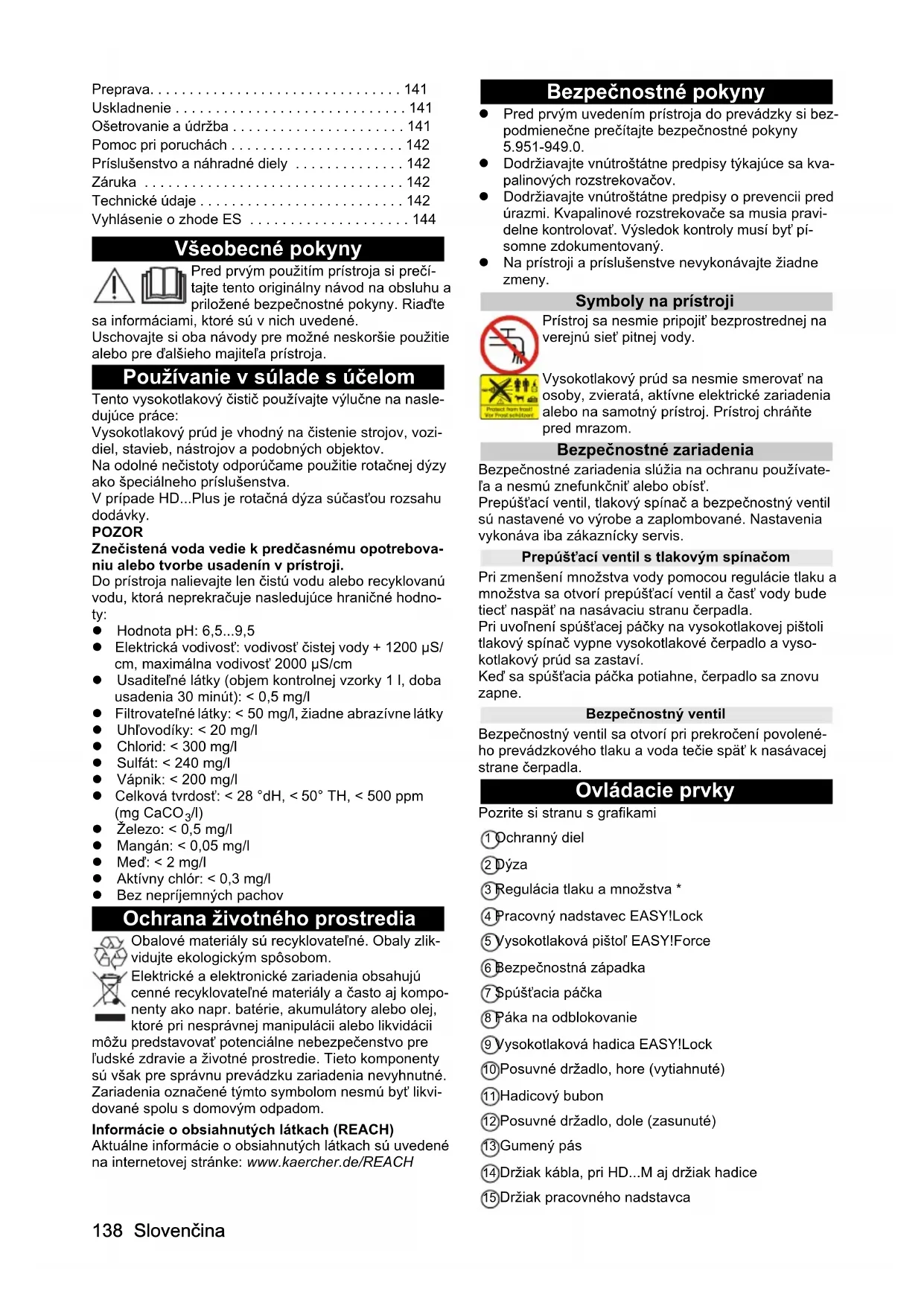 - /l) Železo: < 0,5 mg/l Mangán: < 0,05 mg/l Meď: < 2 mg/l Aktívny chlór: < 0,3 mg/l Bez nepríjemných pachov Ochrana životného prostredia Obalové materiály sú recyklovateľné. Obaly zlik- vidujte ekologickým spôsobom. Elektrické a elektronické zariadenia obsahujú cenné recyklovateľné materiály a často aj kompo- nenty ako napr. batérie, akumulátory alebo olej, ktoré pri nesprávnej manipulácii alebo likvidácii môžu predstavovať potenciálne nebezpečenstvo pre ľudské zdravie a životné prostredie. Tieto komponenty sú však pre správnu prevádzku zariadenia nevyhnutné. Zariadenia označené týmto symbolom nesmú byť likvi- dované spolu s domovým odpadom. Informácie o obsiahnutých látkach (REACH) Aktuálne informácie o obsiahnutých látkach sú uvedené na internetovej stránke: www.kaercher.de/REACH Bezpečnostné pokyny Pred prvým uvedením prístroja do prevádzky si bez- podmienečne prečítajte bezpečnostné pokyny 5.951-949.0. Dodržiavajte vnútroštátne predpisy týkajúce sa kva- palinových rozstrekovačov. Dodržiavajte vnútroštátne predpisy o prevencii pred úrazmi. Kvapalinové rozstrekovače sa musia pravi- delne kontrolovať. Výsledok kontroly musí byť pí- somne zdokumentovaný. Na prístroji a príslušenstve nevykonávajte žiadne zmeny. Symboly na prístroji Prístroj sa nesmie pripojiť bezprostrednej na verejnú sieť pitnej vody. Vysokotlakový prúd sa nesmie smerovať na osoby, zvieratá, aktívne elektrické zariadenia alebo na samotný prístroj. Prístroj chráňte pred mrazom. Bezpečnostné zariadenia Bezpečnostné zariadenia slúžia na ochranu používate- ľa a nesmú znefunkčniť alebo obísť. Prepúšťací ventil, tlakový spínač a bezpečnostný ventil sú nastavené vo výrobe a zaplombované. Nastavenia vykonáva iba zákaznícky servis. Prepúšťací ventil s tlakovým spínačom Pri zmenšení množstva vody pomocou regulácie tlaku a množstva sa otvorí prepúšťací ventil a časť vody bude tiecť naspäť na nasávaciu stranu čerpadla. Pri uvoľnení spúšťacej páčky na vysokotlakovej pištoli tlakový spínač vypne vysokotlakové čerpadlo a vyso- kotlakový prúd sa zastaví. Keď sa spúšťacia páčka potiahne, čerpadlo sa znovu zapne. Bezpečnostný ventil Bezpečnostný ventil sa otvorí pri prekročení povolené- ho prevádzkového tlaku a voda tečie späť k nasávacej strane čerpadla. Ovládacie prvky Pozrite si stranu s grafikami 1 Ochranný diel 2 Dýza 3 Regulácia tlaku a množstva * 4 Pracovný nadstavec EASY!Lock 5 Vysokotlaková pištoľ EASY!Force 6 Bezpečnostná západka 7 Spúšťacia páčka 8 Páka na odblokovanie 9 Vysokotlaková hadica EASY!Lock 10 Posuvné držadlo, hore (vytiahnuté) 11 Hadicový bubon 12 Posuvné držadlo, dole (zasunuté) 13 Gumený pás 14 Držiak kábla, pri HD