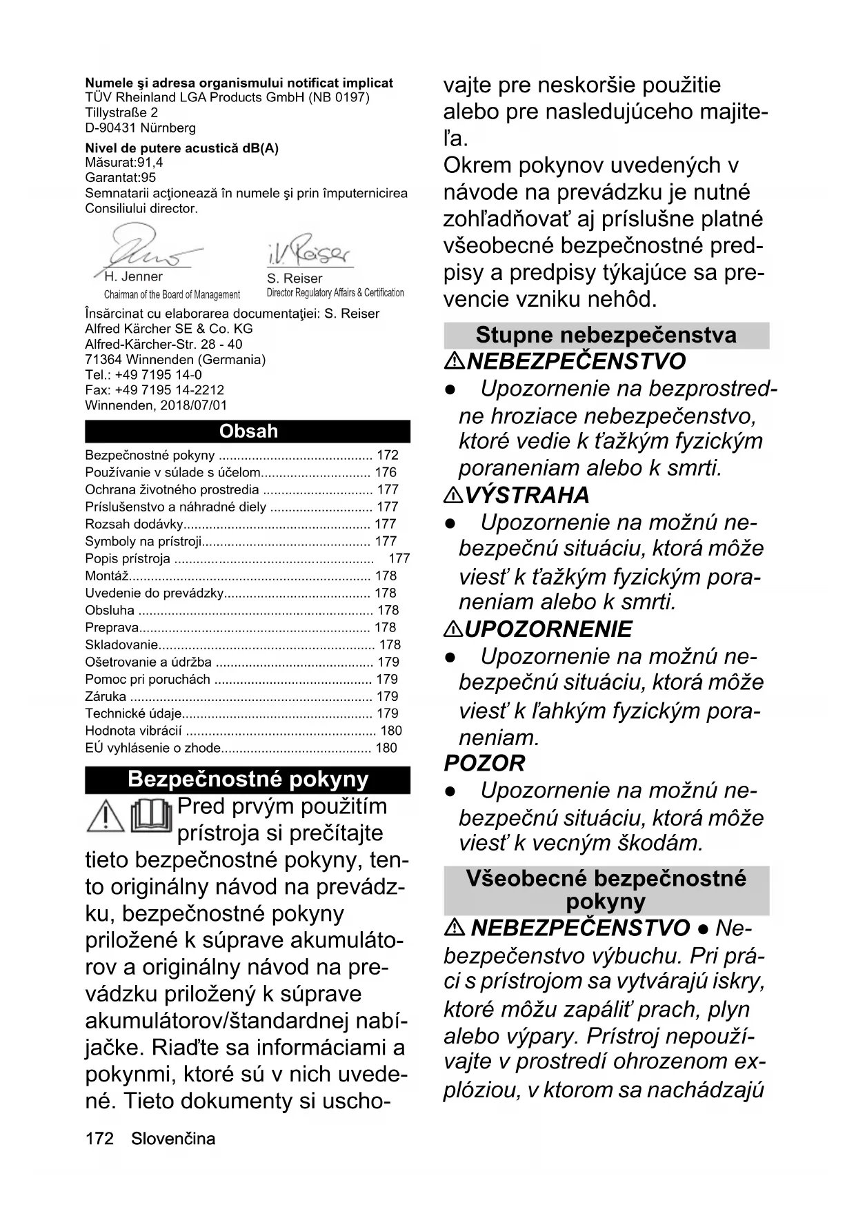 • 3,3 Incertitudine K dB(A) 1,5 Dimensiuni şi greutăţi Lungime x Lăţime x Înălţime mm 1474 x 3 46 x 511 Greutate (fără set de acumulatori) kg 2,8172 Slovenčina Numele şi adresa organismului notificat implicat TÜV Rheinland LGA Products GmbH (NB 0197) Tillystraße 2 D-90431 Nürnberg Nivel de putere acustică dB(A) Măsurat:91,4 Garantat:95 Semnatarii acţionează în numele şi prin împuternicirea Consiliului director. Însărcinat cu elaborarea documentaţiei: S. Reiser Alfred Kärcher SE & Co. KG Alfred-Kärcher-Str. 28 - 40 71364 Winnenden (Germania) Tel.: +49 7195 14-0 Fax: +49 7195 14-2212 Winnenden, 2018/07/01 Obsah Bezpečnostné pokyny Pred prvým použitím prístroja si prečítajte tieto bezpečnostné pokyny, ten- to originálny návod na prevádz- ku, bezpečnostné pokyny priložené k súprave akumuláto- rov a originálny návod na pre- vádzku priložený k súprave akumulátorov/štandardnej nabí- jačke. Riaďte sa informáciami a pokynmi, ktoré sú v nich uvede- né. Tieto dokumenty si uscho- vajte pre neskoršie použitie alebo pre nasledujúceho majite- ľa. Okrem pokynov uvedených v návode na prevádzku je nutné zohľadňovať aj príslušne platné všeobecné bezpečnostné pred- pisy a predpisy týkajúce sa pre- vencie vzniku nehôd. Stupne nebezpečenstva NEBEZPEČENSTVO ● Upozornenie na bezprostred- ne hroziace nebezpečenstvo, ktoré vedie k ťažkým fyzickým poraneniam alebo k smrti. 몇 VÝSTRAHA ● Upozornenie na možnú ne- bezpečnú situáciu, ktorá môže viesť k ťažkým fyzickým pora- neniam alebo k smrti. 몇 UPOZORNENIE ● Upozornenie na možnú ne- bezpečnú situáciu, ktorá môže viesť k ľahkým fyzickým pora- neniam. POZOR ● Upozornenie na možnú ne- bezpečnú situáciu, ktorá môže viesť k vecným škodám. Všeobecné bezpečnostné pokyny NEBEZPEČENSTVO ● Ne- bezpečenstvo výbuchu. Pri prá- ci s prístrojom sa vytvárajú iskry, ktoré môžu zapáliť prach, plyn alebo výpary. Prístroj nepouží- vajte v prostredí ohrozenom ex- plóziou, v ktorom sa nachádzajú Bezpečnostné pokyny p. 172