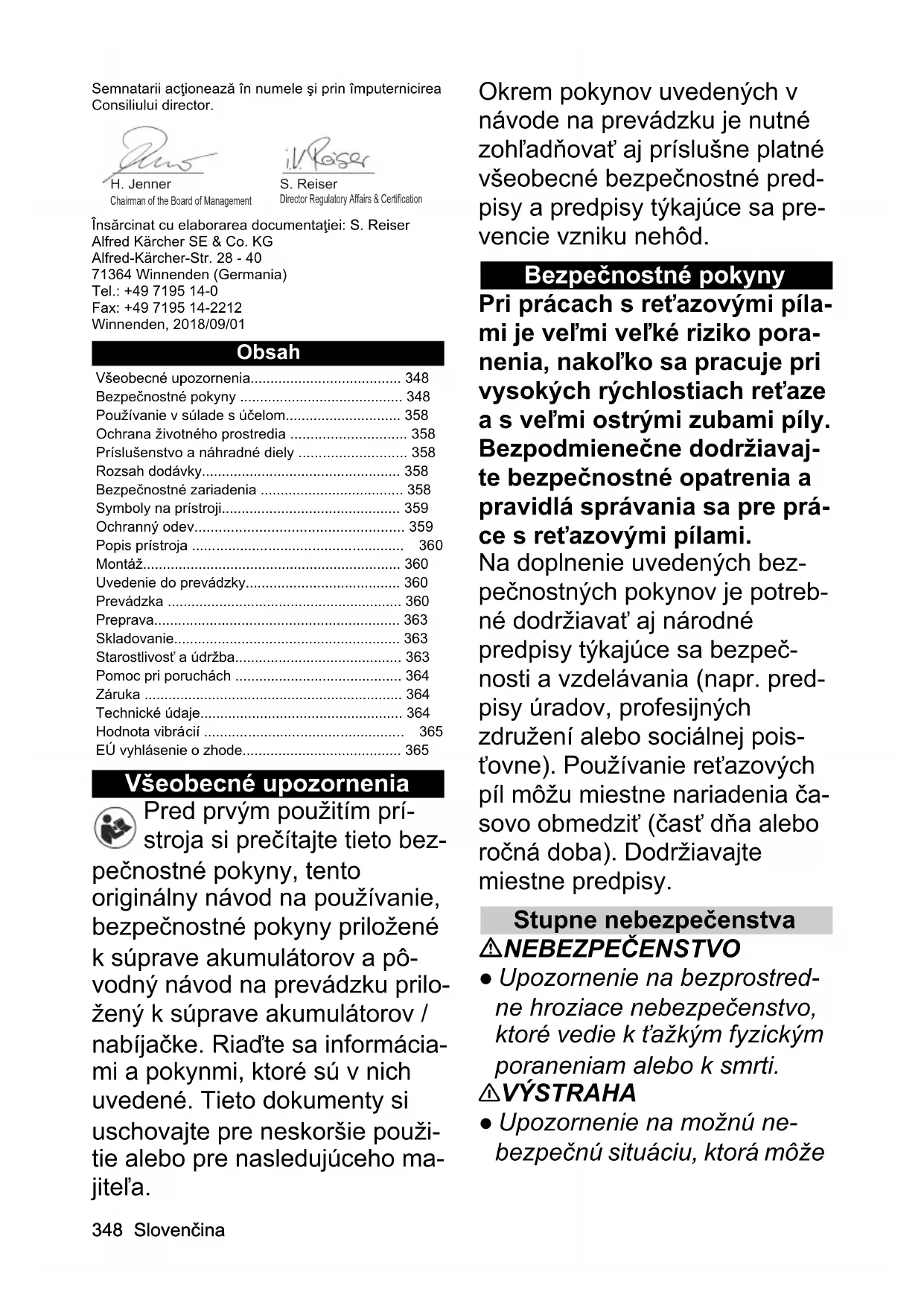 • Lungimea șinei de ghidare mm 300 Lungimea de tăiere mm 250 Pas lanț in (mm) 0,375 (9,525) Greutate (fără set de acumulatori) kg 3,2348 Slovenčina Semnatarii acţionează în numele şi prin împuternicirea Consiliului director. Însărcinat cu elaborarea documentaţiei: S. Reiser Alfred Kärcher SE & Co. KG Alfred-Kärcher-Str. 28 - 40 71364 Winnenden (Germania) Tel.: +49 7195 14-0 Fax: +49 7195 14-2212 Winnenden, 2018/09/01 Obsah Všeobecné upozornenia Pred prvým použitím prí- stroja si prečítajte tieto bez- pečnostné pokyny, tento originálny návod na používanie, bezpečnostné pokyny priložené k súprave akumulátorov a pô- vodný návod na prevádzku prilo- žený k súprave akumulátorov / nabíjačke. Riaďte sa informácia- mi a pokynmi, ktoré sú v nich uvedené. Tieto dokumenty si uschovajte pre neskoršie použi- tie alebo pre nasledujúceho ma- jiteľa. Okrem pokynov uvedených v návode na prevádzku je nutné zohľadňovať aj príslušne platné všeobecné bezpečnostné pred- pisy a predpisy týkajúce sa pre- vencie vzniku nehôd. Bezpečnostné pokyny Pri prácach s reťazovými píla- mi je veľmi veľké riziko pora- nenia, nakoľko sa pracuje pri vysokých rýchlostiach reťaze a s veľmi ostrými zubami píly. Bezpodmienečne dodržiavaj- te bezpečnostné opatrenia a pravidlá správania sa pre prá- ce s reťazovými pílami. Na doplnenie uvedených bez- pečnostných pokynov je potreb- né dodržiavať aj národné predpisy týkajúce sa bezpeč- nosti a vzdelávania (napr. pred- pisy úradov, profesijných združení alebo sociálnej pois- ťovne). Používanie reťazových píl môžu miestne nariadenia ča- sovo obmedziť (časť dňa alebo ročná doba). Dodržiavajte miestne predpisy. Stupne nebezpečenstva NEBEZPEČENSTVO ● Upozornenie na bezprostred- ne hroziace nebezpečenstvo, ktoré vedie k ťažkým fyzickým poraneniam alebo k smrti. 몇 VÝSTRAHA ● Upozornenie na možnú ne- bezpečnú situáciu, ktorá môže Všeobecné upozornenia p. 348
