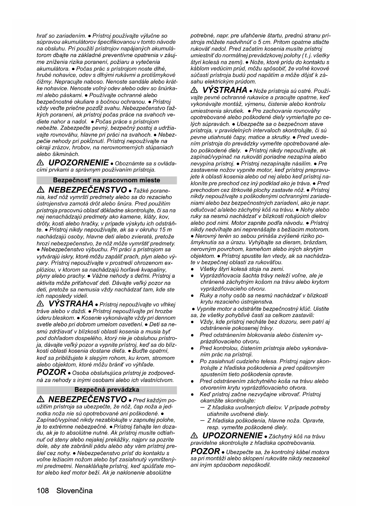 - EÚ vyhlásenie o zhode 08 Slovenčina hrať so zariadením. ● Prístroj používajte výlučne so súpravou akumulátorov špecifikovanou v tomto návode na obsluhu. Pri použití prístrojov napájaných akumulá- torom dbajte na základné preventívne opatrenia v záuj- me zníženia rizika poranení, požiaru a vytečenia akumulátora. ● Počas prác s prístrojom noste dlhé, hrubé nohavice, odev s dlhými rukávmi a protišmykové čižmy. Nepracujte naboso. Nenoste sandále alebo krát- ke nohavice. Nenoste voľný odev alebo odev so šnúrka- mi alebo páskami. ● Používajte ochranné alebo bezpečnostné okuliare s bočnou ochranou. ● Prístroj vždy veďte priečne pozdĺž svahu. Nebezpečenstvo ťaž- kých poranení, ak prístroj počas práce na svahoch ve- diete nahor a nadol. ● Počas práce s prístrojom nebežte. Zabezpečte pevný, bezpečný postoj a udržia- vajte rovnováhu, hlavne pri práci na svahoch. ● Nebez- pečie nehody pri pokĺznutí. Prístroj nepoužívajte na okraji zrázov, hrobov, na nerovnomerných stúpaniach alebo šikminách. 몇 UPOZORNENIE ● Oboznámte sa s ovláda- cími prvkami a správnym používaním prístroja. Bezpečnosť na pracovnom mieste NEBEZPEČENSTVO ● Ťažké porane- nia, keď nôž vymrští predmety alebo sa do rezacieho ústrojenstva zamotá drôt alebo šnúra. Pred použitím prístroja pracovnú oblasť dôkladne skontrolujte, či sa na nej nenachádzajú predmety ako kamene, kláty, kov, drôty, kosti alebo hračky, v prípade výskytu ich odstráň- te. ● Prístroj nikdy nepoužívajte, ak sa v okruhu 15 m nachádzajú osoby, hlavne deti alebo zvieratá, pretože hrozí nebezpečenstvo, že nôž môže vymrštiť predmety. ● Nebezpečenstvo výbuchu. Pri práci s prístrojom sa vytvárajú iskry, ktoré môžu zapáliť prach, plyn alebo vý- pary. Prístroj nepoužívajte v prostredí ohrozenom ex- plóziou, v ktorom sa nachádzajú horľavé kvapaliny, plyny alebo prachy. ● Vážne nehody s deťmi. Prístroj a aktivita môže priťahovať deti. Dávajte veľký pozor na deti, pretože sa nemusia vždy nachádzať tam, kde ste ich naposledy videli. 몇 VÝSTRAHA ● Prístroj nepoužívajte vo vlhkej tráve alebo v daždi. ● Prístroj nepoužívajte pri hrozbe úderu bleskom. ● Kosenie vykonávajte vždy pri dennom svetle alebo pri dobrom umelom osvetlení. ● Deti sa ne- smú zdržiavať v blízkosti oblasti kosenia a musia byť pod dohľadom dospelého, ktorý nie je obsluhou prístro- ja, dávajte veľký pozor a vypnite prístroj, keď sa do blíz- kosti oblasti kosenia dostane dieťa. ● Buďte opatrní, keď sa približujete k slepým rohom, ku krom, stromom alebo objektom, ktoré môžu brániť vo výhľade. POZOR ● Osoba obsluhujúca prístroj je zodpoved- ná za nehody s inými osobami alebo ich vlastníctvom. Bezpečná prevádzka NEBEZPEČENSTVO ● Pred každým po- užitím prístroja sa ubezpečte, že nôž, čap noža a jed- notka noža nie sú opotrebované ani poškodené. ● Zapínač/vypínač nikdy nezablokujte v zapnutej polohe, je to extrémne nebezpečné. ● Prístroj ťahajte len doza- du, ak je to absolútne nutné. Ak prístroj musíte odtiah- nuť od steny alebo nejakej prekážky, najprv sa pozrite dole, aby ste zabránili pádu alebo aby vám prístroj pre- šiel cez nohy. ● Nebezpečenstvo prísť do kontaktu s voľne ležiacim nožom alebo byť zasiahnutý vymrštený- mi predmetmi. Nenakláňajte prístroj, keď spúšťate mo- tor alebo keď motor beží. Ak je naklonenie absolútne potrebné, napr. pre uľahčenie štartu, prednú stranu prí- stroja môžete nadvihnúť o 5 cm. Pritom opatrne stlačte rukoväť nadol. Pred začatím kosenia musíte prístroj umiestniť do normálnej prevádzkovej polohy ( t. j. všetky štyri kolesá na zemi). ● Nože, ktoré prídu do kontaktu s káblom vedúcim prúd, môžu spôsobiť, že voľné kovové súčasti prístroja budú pod napätím a môže dôjsť k zá- sahu elektrickým prúdom. 몇 VÝSTRAHA ● Nože prístroja sú ostré. Použí- vajte pevné ochranné rukavice a pracujte opatrne, keď vykonávajte montáž, výmenu, čistenie alebo kontrolu umiestnenia skrutiek. ● Pre zachovanie rovnováhy opotrebované alebo poškodené diely vymieňajte po ce- lých súpravách. ● Ubezpečte sa o bezpečnom stave prístroja, v pravidelných intervaloch skontrolujte, či sú pevne utiahnuté čapy, matice a skrutky. ● Pred uvede- ním prístroja do prevádzky vymeňte opotrebované ale- bo poškodené diely. ● Prístroj nikdy nepoužívajte, ak zapínač/vypínač na rukoväti poriadne nezapína alebo nevypína prístroj. ● Prístroj nezapínajte násilím. ● Pre zastavenie nožov vypnite motor, keď prístroj prepravu- jete k oblasti kosenia alebo od nej alebo keď prístroj na- kloníte pre prechod cez iný podklad ako je tráva. ● Pred prechodom cez štrkovité plochy zastavte nôž. ● Prístroj nikdy nepoužívajte s poškodenými ochrannými zariade- niami alebo bez bezpečnostných zariadení, ako je napr. odlučovač a/alebo záchytný kôš na trávu. ● Nohy alebo ruky sa nesmú nachádzať v blízkosti rotujúcich dielov alebo pod nimi. Motor zapnite podľa návodu. ● Prístroj nikdy nedvíhajte ani neprenášajte s bežiacim motorom. ● Nerovný terén so sebou prináša zvýšené riziko po- šmyknutia sa a úrazu. Vyhýbajte sa dieram, brázdam, nerovným povrchom, kameňom alebo iných skrytým objektom. ● Prístroj spustite len vtedy, ak sa nachádza- te v bezpeč nej oblasti za rukoväťou. ● Všetky štyri kolesá stoja na zemi. ● Vyprázdňovacia šachta trávy neleží voľne, ale je chránená záchytným košom na trávu alebo krytom vyprázdňovacieho otvoru. ● Ruky a nohy osôb sa nesmú nachádzať v blízkosti krytu rezacieho ústrojenstva. ● Vypnite motor a odstráňte bezpečnostný kľúč. Uistite sa, že všetky pohyblivé časti sa celkom z