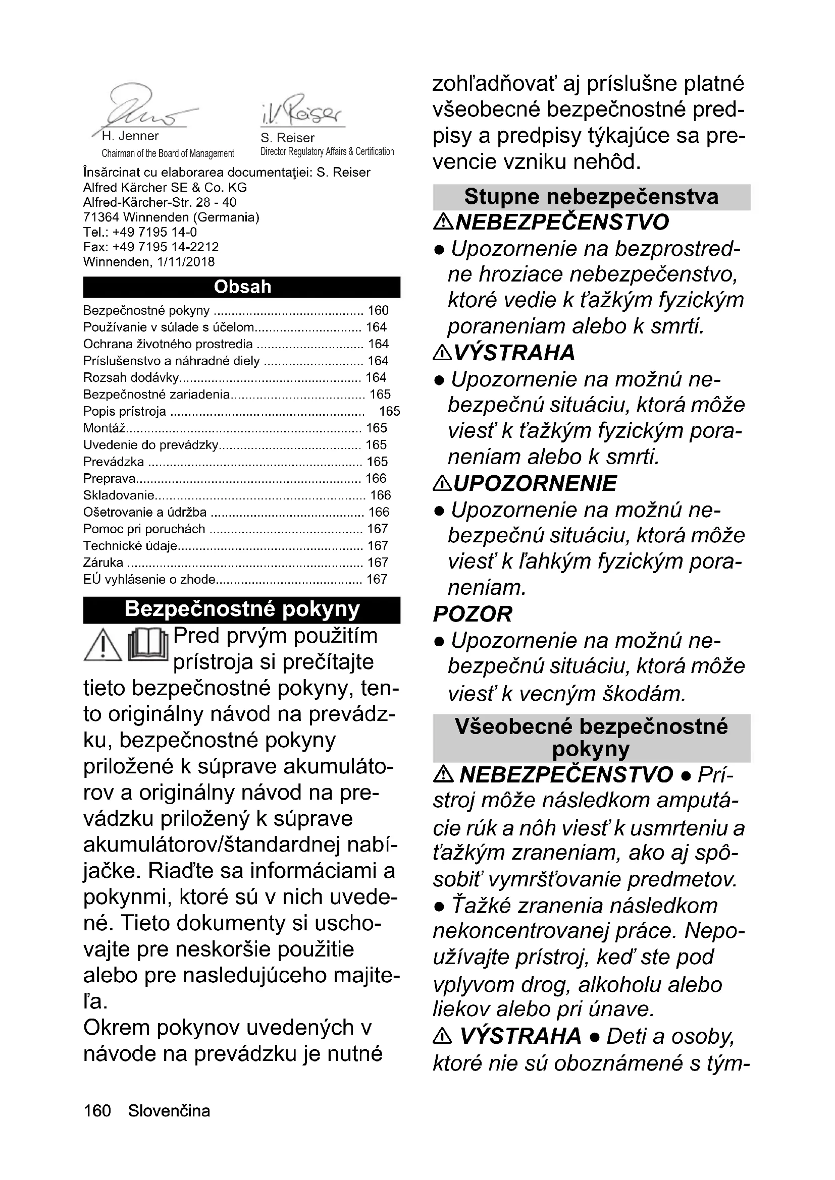 • Greutate (fără set de acumulatori) kg 13,4160 Slovenčina Însărcinat cu elaborarea documentaţiei: S. Reiser Alfred Kärcher SE & Co. KG Alfred-Kärcher-Str. 28 - 40 71364 Winnenden (Germania) Tel.: +49 7195 14-0 Fax: +49 7195 14-2212 Winnenden, 1/11/2018 Obsah Bezpečnostné pokyny Pred prvým použitím prístroja si prečítajte tieto bezpečnostné pokyny, ten- to originálny návod na prevádz- ku, bezpečnostné pokyny priložené k súprave akumuláto- rov a originálny návod na pre- vádzku priložený k súprave akumulátorov/štandardnej nabí- jačke. Riaďte sa informáciami a pokynmi, ktoré sú v nich uvede- né. Tieto dokumenty si uscho- vajte pre neskoršie použitie alebo pre nasledujúceho majite- ľa. Okrem pokynov uvedených v návode na prevádzku je nutné zohľadňovať aj príslušne platné všeobecné bezpečnostné pred- pisy a predpisy týkajúce sa pre- vencie vzniku nehôd. Stupne nebezpečenstva NEBEZPEČENSTVO ● Upozornenie na bezprostred- ne hroziace nebezpečenstvo, ktoré vedie k ťažkým fyzickým poraneniam alebo k smrti. 몇 VÝSTRAHA ● Upozornenie na možnú ne- bezpečnú situáciu, ktorá môže viesť k ťažkým fyzickým pora- neniam alebo k smrti. 몇 UPOZORNENIE ● Upozornenie na možnú ne- bezpečnú situáciu, ktorá môže viesť k ľahkým fyzickým pora- neniam. POZOR ● Upozornenie na možnú ne- bezpečnú situáciu, ktorá môže viesť k vecným škodám. Všeobecné bezpečnostné pokyny NEBEZPEČENSTVO ● Prí- stroj môže následkom amputá- cie rúk a nôh viesť k usmrteniu a ťažkým zraneniam, ako aj spô- sobiť vymršťovanie predmetov. ● Ťažké zranenia následkom nekoncentrovanej práce. Nepo- užívajte prístroj, keď ste pod vplyvom drog, alkoholu alebo liekov alebo pri únave. 몇 VÝSTRAHA ● Deti a osoby, ktoré nie sú oboznámené s tým- Bezpečnostné pokyny p. 160
