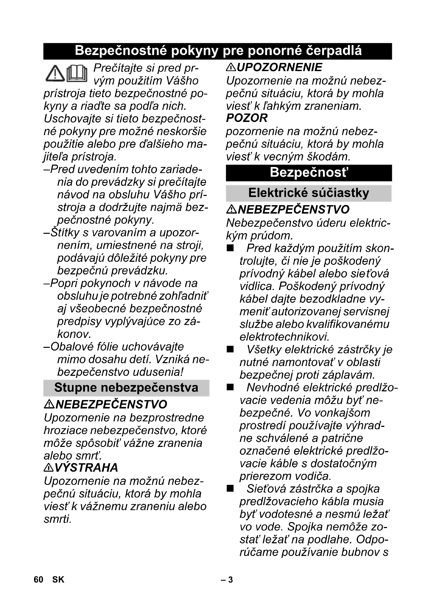ătămările corporale în timpul transportului ţineţi cont de greutatea aparatului (vezi da- tele tehnice). Pentru a evita accidentele şi vătămările corporale, la ale- gerea locului de depozitare ţi- neţi cont de greutatea apara- tului (vezi datele tehnice). PERICOL Pericol de explozie Nu pompaţi lichide corozive, uşor inflamabile sau explozi- ve (de ex. motorină, benzină, acizi sau nitrodiluaţi). Nu utilizaţi aparatul în medii cu pericol de incendii şi explo- zii. 몇 PRECAUŢIE Apa pompată cu ajutorul acestui aparat nu este potabi- lă! ATENŢIE Aparatul poate fi deteriorat. Nu pompaţi unsori, uleiuri şi apă sărată. Nu pompaţi apă reziduală din grupuri sanitare şi apă înno- roiată, a cărei capacitate de fluidizare este mai mic ă decât ceea a apei. Nu pompaţi apă a cărei tem- peratură este peste 35 C. Alte pericole 59RO– 3 Prečítajte si pred pr- vým použitím Vášho prístroja tieto bezpečnostné po- kyny a riaďte sa podľa nich. Uschovajte si tieto bezpečnost- né pokyny pre možné neskoršie použitie alebo pre ďalšieho ma- jiteľa prístroja. – Pred uvedením tohto zariade- nia do prevádzky si prečítajte návod na obsluhu Vášho prí- stroja a dodržujte najmä bez- pečnostné pokyny. – Štítky s varovaním a upozor- nením, umiestnené na stroji, podávajú dôležité pokyny pre bezpečnú prevádzku. – Popri pokynoch v návode na obsluhu je potrebné zohľadniť aj všeobecné bezpečnostné predpisy vyplývajúce zo zá- konov. – Obalové fólie uchovávajte mimo dosahu detí. Vzniká ne- bezpečenstvo udusenia! NEBEZPEČENSTVO Upozornenie na bezprostredne hroziace nebezpečenstvo, ktoré môže spôsobiť vážne zranenia alebo smrť. 몇 VÝSTRAHA Upozornenie na možnú nebez- pečnú situáciu, ktorá by mohla viesť k vážnemu zraneniu alebo smrti. 몇 UPOZORNENIE Upozornenie na možnú nebez- pečnú situáciu, ktorá by mohla viesť k ľahkým zraneniam. POZOR pozornenie na možnú nebez- pečnú situáciu, ktorá by mohla viesť k vecným škodám. NEBEZPEČENSTVO Nebezpečenstvo úderu elektric- kým prúdom. Pred každým použitím skon- trolujte, či nie je poškodený prívodný kábel alebo sie ťová vidlica. Poškodený prívodný kábel dajte bezodkladne vy- meniť autorizovanej servisnej službe alebo kvalifikovanému elektrotechnikovi. Všetky elektrické zástrčky je nutné namontovať v oblasti bezpečnej proti záplavám. Nevhodné elektrické predlžo- vacie vedenia môžu byť ne- bezpečné. Vo vonkajšom prostredí používajte výhrad- ne schválené a patrične označené elektrické predlžo- vacie káble s dostatočným prierezom vodiča. Sieťová zástrčka a spojka predlžovacieho kábla musia byť vodotesné a nesmú ležať vo vode. Spojka nemôže zo- stať ležať na podlahe. Odpo- rúčame používanie bubnov s Bezpečnostné pokyny pre ponorné čerpadlá Stupne nebezpečenstva Bezpečnosť Elektrické súčiastky 60 SK– 4 káblami, ktoré zaručujú, že sa budú zásuvky nachádzať mi- nimálne 60 mm nad podla- hou. Elektrický sieťový pripojovací kábel nepoužívajte na pre- pravu alebo upevnenie prí- stroja. Pri odpájaní prístroja od elek- trickej siete net'ahajte za pri- pojovací kábel, ale za zástrč- ku. Kábel pripojenia k sieti neťa- hajte cez ostré hrany a neprikvačte ho. Napätie uvedené na výrob- nom štítku musí súhlasiť s na- pätím zásuvky. Aby sa zabránilo vzniku ne- bezpečných situácií, môže opravy a výmenu náhradných dielov prístroja vykonávať len autorizované servisné stre- disko. Prevádzkujte čerpadlá iba v zásuvkách s ochranným vypí- načom proti chybnému prúdu s menovitým chybným prú- dom max. 30 mA a ochran- ným kontaktom (uzemnenie). Ochranný vypínač proti chyb- nému prúdu a ochranný kon- takt (uzemnenie) pravidelne kontrolujte na funkčnosť. Neprevádzkujte čerpadlá v žiadnom prípade, ak sa v ba- zéne alebo záhradnom jazier- ku nachádzajú osoby. Nedotýkajte sa počas pre- vádzky prepravovanej kvapa- liny, lana upevneného na transportnej rukoväti a pred- metov, ktoré sa dostávajú do kontaktu s prepravovanou kvapalinou (napr. do vody vy- čnievajúce potrubia, zábrad- lia a pod.). V Rakúsku musia byť čer- padlá pri použití v plaveckých bazénoch a záhradných ryb- níkoch, ktoré sú vybavené pevnými prípojkami, napája- né podľa ÖVE B/EN 60555 časť 1 až 3 z oddeľovacieho (izolačného) transformátora, preskúšaného ÖVE, pričom nesmie byť prekročené se- kundárne menovité napätie 230V. Elektrické zapojenie môže vykonať len odborný elektri- kár. Preto je bezpodmieneč- ne nutné dodržať národné predpisy! 몇 VÝSTRAHA Tento prístroj nie je určený nato, aby ho používali osoby s obmedzenými fyzickými, senzorickými alebo duševný- mi schopnosťami alebo ne- dostatkom skúseností a/ale- bo nedostatočnými vedomos- ťami, môžu ho použiť iba v tom prípade, ak sú kvôli vlastnej bezpečnosti pod do- zorom spoľahlivej osoby ale- bo od nej dostali pokyny, ako sa má prístroj používať a po- chopili nebezpečenstvá vy- chádzajúce z prístroja. Bezpečná manipulácia 61SK– 5 Deti môžu používať prístroj iba vtedy, ak sú staršie než 8 rokov a ak sú kvôli vlastnej bezpečnosti pod dozorom spoľahlivej osoby, alebo od nej dostali pokyny, ako sa má prístroj používať, a pochopili nebezpečenstvá vychádzajú- ce z prístroja. Deti sa nesmú hrať s prístro- jom. Deti by mali byť pod dozorom, aby sa zabezpečilo, že sa s prístrojom nebudú hrať. Deti nemôžu vykonávať čiste- nie a užívateľskú údržbu bez dohľadu dospelej osoby. Pred každým ošetrením a údržbou prístroj vypnite a vy- tiahnite zástrčku. 몇 UPOZORNENIE Pred všetkými činnosťami s prístrojom alebo na prístroji vytvorte stabilitu, aby sa za- bránilo vzniku nehôd alebo poškodeniu spôsobenému pádom prístroja. Aby sa pri pre