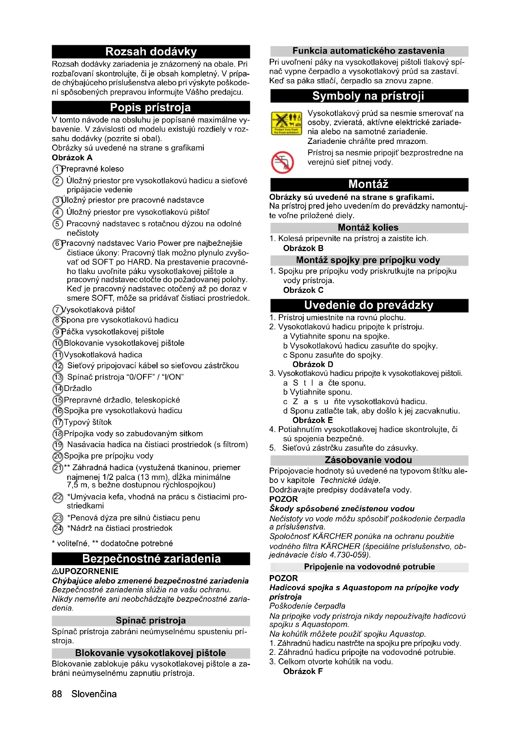 • EÚ vyhlásenie o zhode Slovenčina Rozsah dodávky Rozsah dodávky zariadenia je znázornený na obale. Pri rozbaľovaní skontrolujte, či je obsah kompletný. V prípa- de chýbajúceho príslušenstva alebo pri výskyte poškode- ní spôsobených prepravou informujte Vášho predajcu. Popis prístroja V tomto návode na obsluhu je popísané maximálne vy- bavenie. V závislosti od modelu existujú rozdiely v roz- sahu dodávky (pozrite si obal). Obrázky sú uvedené na strane s grafikami Obrázok A 1 Prepravné koleso 2 Úložný priestor pre vysokotlakovú hadicu a sieťové pripájacie vedenie 3 Úložný priestor pre pracovné nadstavce 4 Úložný priestor pre vysokotlakovú pištoľ 5 Pracovný nadstavec s rotačnou dýzou na odolné nečistoty 6 Pracovný nadstavec Vario Power pre najbežnejšie čistiace úkony: Pracovný tlak možno plynulo zvyšo- vať od SOFT po HARD. Na prestavenie pracovné- ho tlaku uvoľnite páku vysokotlakovej pištole a pracovný nadstavec otočte do požadovanej polohy. Keď je pracovný nadstavec otočený až po doraz v smere SOFT, môže sa pridávať čistiaci prostriedok. 7 Vysokotlaková pištoľ 8 Spona pre vysokotlakovú hadicu 9 Páčka vysokotlakovej pištole 10 Blokovanie vysokotlakovej pištole 11 Vysokotlaková hadica 12 Sieťový pripojovací kábel so sieťovou zástrčkou 13 Spínač prístroja “0/OFF” / “I/ON” 14 Držadlo 15 Prepravné držadlo, teleskopické 16 Spojka pre vysokotlakovú hadicu 17 Typový štítok 18 Prípojka vody so zabudovaným sitkom 19 Nasávacia hadica na čistiaci prostriedok (s filtrom) 20 Spojka pre prípojku vody 21 ** Záhradná hadica (vystužená tkaninou, priemer najmenej 1/2 palca (13 mm), dĺžka minimálne 7,5 m, s bežne dostupnou rýchlospojkou) 22 *Umývacia kefa, vhodná na prácu s čistiacimi pro- striedkami 23 *Penová dýza pre silnú čistiacu penu 24 *Nádrž na čistiaci prostriedok p. 9188