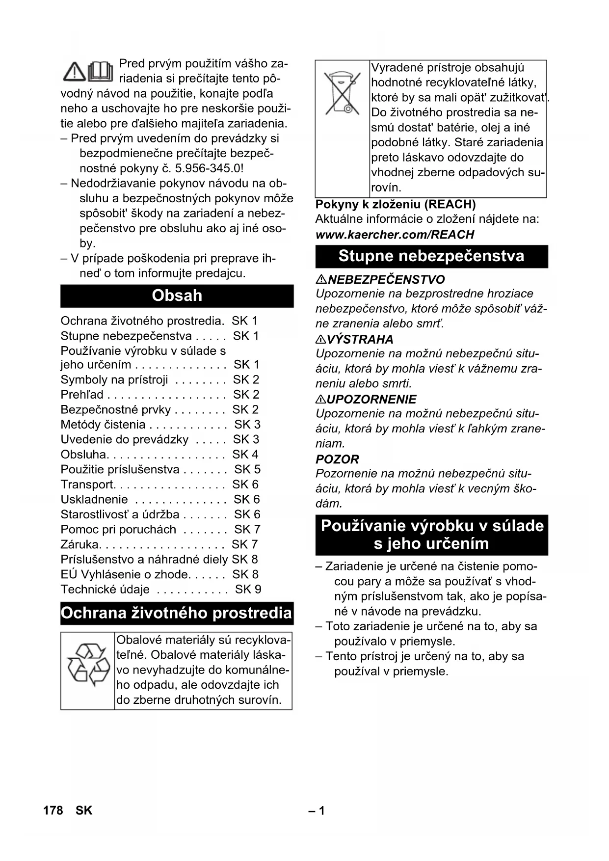 Nr. piesă Lungimea cablului CN 6.650-597.0 7,5 m 177RO– 1 Pred prvým použitím vášho za- riadenia si prečítajte tento pô- vodný návod na použitie, konajte podľa neho a uschovajte ho pre neskoršie použi- tie alebo pre ďalšieho majiteľa zariadenia. – Pred prvým uvedením do prevádzky si bezpodmienečne prečítajte bezpeč- nostné pokyny č. 5.956-345.0! – Nedodržiavanie pokynov návodu na ob- sluhu a bezpečnostných pokynov môže spôsobit' škody na zariadení a nebez- pečenstvo pre obsluhu ako aj iné oso- by. – V prípade poškodenia pri preprave ih- neď o tom informujte predajcu. Pokyny k zloženiu (REACH) Aktuálne informácie o zložení nájdete na: www.kaercher.com/REACH NEBEZPEČENSTVO Upozornenie na bezprostredne hroziace nebezpečenstvo, ktoré môže spôsobiť váž- ne zranenia alebo smrť. 몇 VÝSTRAHA Upozornenie na možnú nebezpečnú situ- áciu, ktorá by mohla viesť k vážnemu zra- neniu alebo smrti. 몇 UPOZORNENIE Upozornenie na možnú nebezpečnú situ- áciu, ktorá by mohla viesť k ľahkým zrane- niam. POZOR Pozornenie na možnú nebezpečnú situ- áciu, ktorá by mohla viesť k vecným ško- dám. – Zariadenie je určené na čistenie pomo- cou pary a môže sa používať s vhod- ným príslušenstvom tak, ako je popísa- né v návode na prevádzku. – Toto zariadenie je určené na to, aby sa používalo v priemysle. – Tento prístroj je určený na to, aby sa používal v priemysle. Obsah Ochrana životného prostredia. SK 1 Stupne nebezpečenstva . . . . . SK 1 Používanie výrobku v súlade s jeho určením . . . . . . . . . . . . . . SK 1 Symboly na prístroji . . . . . . . . SK 2 Prehľad . . . . . . . . . . . . . . . . . . SK 2 Bezpečnostné prvky . . . . . . . . SK 2 Metódy čistenia . . . . . . . . . . . . SK 3 Uvedenie do prevádzky . . . . . SK 3 Obsluha. . . . . . . . . . . . . . . . . . SK 4 Použitie príslušenstva . . . . . . . SK 5 Transport. . . . . . . . . . . . . . . . . SK 6 Uskladnenie . . . . . . . . . . . . . . SK 6 Starostlivosť a údržba . . . . . . . SK 6 Pomoc pri poruchách . . . . . . . SK 7 Záruka. . . . . . . . . . . . . . . . . . . SK 7 Príslušenstvo a náhradné diely SK 8 EÚ Vyhlásenie o zhode. . . . . . SK 8 Technické údaje . . . . . . . . . . . SK 9 Ochrana životného prostredia Obalové materiály sú recyklova- teľné. Obalové materiály láska- vo nevyhadzujte do komunálne- ho odpadu, ale odovzdajte ich do zberne druhotných surovín. Vyradené prístroje obsahujú hodnotné recyklovateľné látky, ktoré by sa mali opät' zužitkovat'. Do životného prostredia sa ne- smú dostat' batérie, olej a iné podobné látky. Staré zariadenia preto láskavo odovzdajte do vhodnej zberne odpadových su- rovín. Stupne nebezpečenstva Používanie výrobku v súlade s jeho určením 178 SK– 2 Para POZOR - nebezpečenstvo obarenia Obrázok 1 Bezpečnostný uzáver (parný kotol) 2 Ovládací panel 3 Parná hadica 4 Tlačidlo reset - Odstránenie vodného kameňa 5 Vypínač pary 6 Priestor pre príslušenstvo 7 Kryt zásuvky prístroja 8 Parná zástrčka 9 Rukovät' na prenášanie 10 Hák na kábel 11 Kryt 12 Uzáver nádoby (nádrž na čerstvú vodu) 13 Froté pot'ah 14 Plniaci lievik 15 Ručná hubica 16 Tryska na okná (špeciálne príslušen- stvo) 17 Siet'ový kábel 18 Upínacia spona 19 Podlahová hubica so štetinami 20 Handra na podlahu (podlahová dýza so štetinami) 21 Okrúhla kefa 22 Tlaková tryska (červená) 23 Predĺženie 24 Podlahová hubica s lamelami 25 Bodová dýza (120 mm) 26 Bodová dýza (180 mm) 27 Handra na podlahu (podlahová dýza s lamelami) 28 Blokovacia hlava 29 Predlžovacia trubica 30 Blokovanie (detská poistka) 31 Parná pištoľ Obrázok 1 Vypínač - čerpadlo nádrže na čerstvú vodu 2 Kontrolka - ohrev (žltá) 3 Kontrolka - Nedostatok vody v parnom kotle (červená) 4 Ukazovateľ teploty 5 Otočný gombík na reguláciu VAPO- HYDRO 6 Otočný gombík na reguláciu množstva pary 7 Rozsah pracovnej teploty 8 Kontrolka - Odstránenie vodného ka- meňa (biela) 9 Kontrolná lampa - nedostatok vody v nádrže na čerstvú vodu (červená) 10 Vypínač - ohrev (Zap./Vyp.) – Ovládacie prvky pre čistiaci proces sú žlté. – Ovládacie prvky pre údržbu a servis sú svetlosivé. Bezpečnostné zariadenia slúžia na ochra- nu užívateľa a nesmie sa vyradiť z prevádz- ky alebo obchádzať jeho funkcie. Regulátor tlaku udržiava počas prevádzky podľa možnosti konštantný tlak v kotle. Ohrev sa pri dosiahnutí maximálneho pre- vádzkového tlaku v kotle vypne a pri pokle- se tlaku v kotle v dôsledku odberu pary sa opäť zapne. Ak sa voda v kotle minie, stúpne teplota ohrevu. Termostat nedostatku vody vypne ohrev a rozsvieti sa červená kontrolka „Ne- dostatok vody“. Opätovnému zapnutiu ohrevu je bránené dovtedy, pokiaľ sa kotol neochladí alebo znovu nenaplní. Symboly na prístroji Nebezpečie popálenia horúcim povrchom! Prehľad Prvky prístroja Ovládací panel Farebné označenie Bezpečnostné prvky Regulátor tlaku Termostat nedostatku vody 179SK– 3 – Ak sa termostat nedostatku vody vypne a zariadenie sa prehreje, tak bezpeč- nostný termostat zariadenie vypne. – Za účelom spätného prestavenia bez- pečnostného termostatu sa obráťte na príslušný zákaznícky servis firmy KÄR- CHER. – Bezpečnostný uzáver uzatvára kotol proti vznikajúcemu tlaku pary. Pokiaľ by bol regulátor tlaku chybný a v kotle by vznikol pretlak, v bezpečnostnom uzá- vere sa otvorí pretlakový ventil a para bude vystupovať cez uzáver do voľné- ho priestranstva. – Za účelom opätovného uvedenia zaria- denia do prevádzky sa obráťte na prí- slušný zákaznícky servis firmy KÄR- CHER. Pred začatím prác s prístrojom si na zakry- tom mieste vždy preverte, či príslušné tex- tílie odolávajú pôsobeniu čističa: Najprv sil- ne naparte, potom nechajte vyschnúť a ná- sled