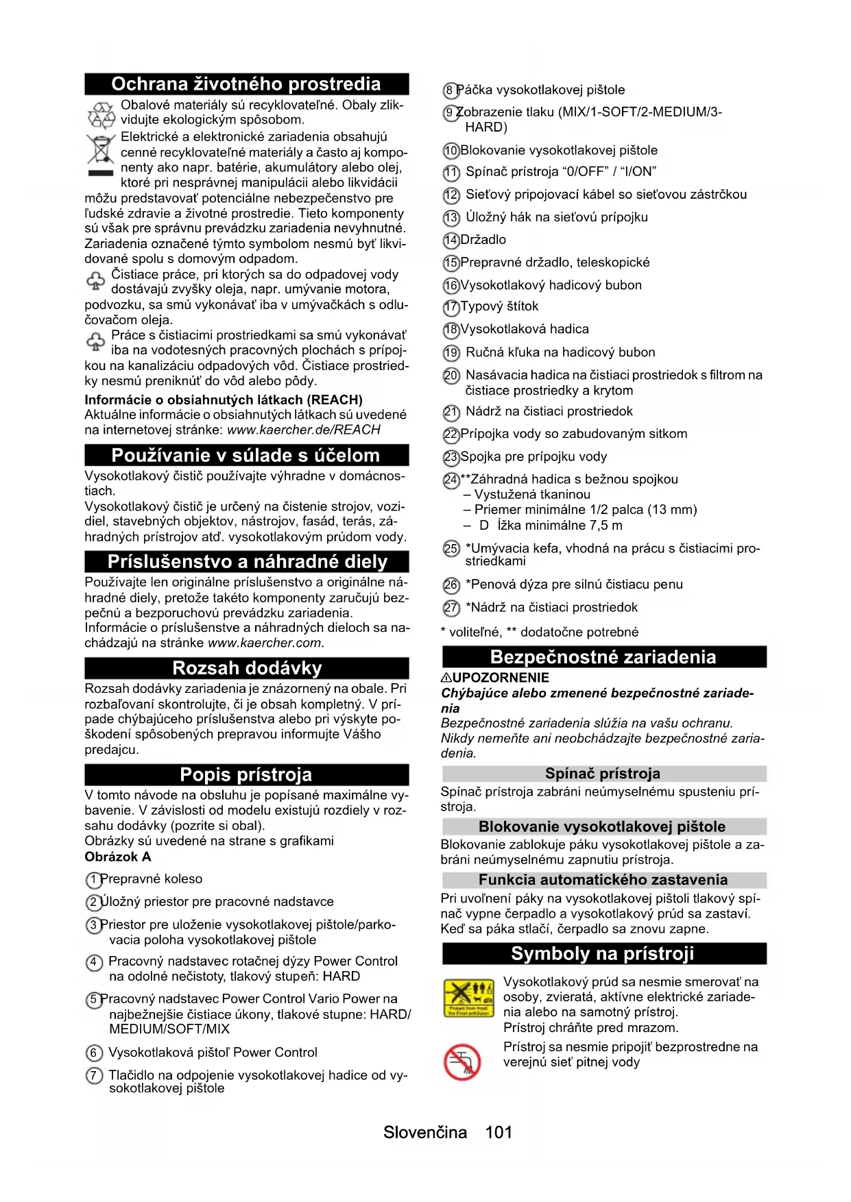 - EÚ vyhlásenie o zhode Slovenčina 101 Ochrana životného prostredia Obalové materiály sú recyklovateľné. Obaly zlik- vidujte ekologickým spôsobom. Elektrické a elektronické zariadenia obsahujú cenné recyklovateľné materiály a často aj kompo- nenty ako napr. batérie, akumulátory alebo olej, ktoré pri nesprávnej manipulácii alebo likvidácii môžu predstavovať potenciálne nebezpečenstvo pre ľudské zdravie a životné prostredie. Tieto komponenty sú však pre správnu prevádzku zariadenia nevyhnutné. Zariadenia označené týmto symbolom nesmú byť likvi- dované spolu s domovým odpadom. Čistiace práce, pri ktorých sa do odpadovej vody dostávajú zvyšky oleja, napr. umývanie motora, podvozku, sa smú vykonávať iba v umývačkách s odlu- čovačom oleja. Práce s čistiacimi prostriedkami sa smú vykonávať iba na vodotesných pracovných plochách s prípoj- kou na kanalizáciu odpadových vôd. Čistiace prostried- ky nesmú preniknúť do vôd alebo pôdy. Informácie o obsiahnutých látkach (REACH) Aktuálne informácie o obsiahnutých látkach sú uvedené na internetovej stránke: www.kaercher.de/REACH Používanie v súlade s účelom Vysokotlakový čistič používajte výhradne v domácnos- tiach. Vysokotlakový čistič je určený na čistenie strojov, vozi- diel, stavebných objektov, nástrojov, fasád, terás, zá- hradných prístrojov atď. vysokotlakovým prúdom vody. Príslušenstvo a náhradné diely Používajte len originálne príslušenstvo a originálne ná- hradné diely, pretože takéto komponenty zaručujú bez- pečnú a bezporuchovú prevádzku zariadenia. Informácie o príslušenstve a náhradných dieloch sa na- chádzajú na stránke www.kaercher.com. Rozsah dodávky Rozsah dodávky zariadenia je znázornený na obale. Pri rozbaľovaní skontrolujte, či je obsah kompletný. V prí- pade chýbajúceho príslušenstva alebo pri výskyte po- škodení spôsobených prepravou informujte Vášho predajcu. Popis prístroja V tomto návode na obsluhu je popísané maximálne vy- bavenie. V závislosti od modelu existujú rozdiely v roz- sahu dodávky (pozrite si obal). Obrázky sú uvedené na strane s grafikami Obrázok A 1 Prepravné koleso 2 Úložný priestor pre pracovné nadstavce 3 Priestor pre uloženie vysokotlakovej pištole/parko- vacia poloha vysokotlakovej pištole 4 Pracovný nadstavec rotačnej dýzy Power Control na odolné nečistoty, tlakový stupeň: HARD 5 Pracovný nadstavec Power Control Vario Power na najbežnejšie čistiace úkony, tlakové stupne: HARD/ p. 105