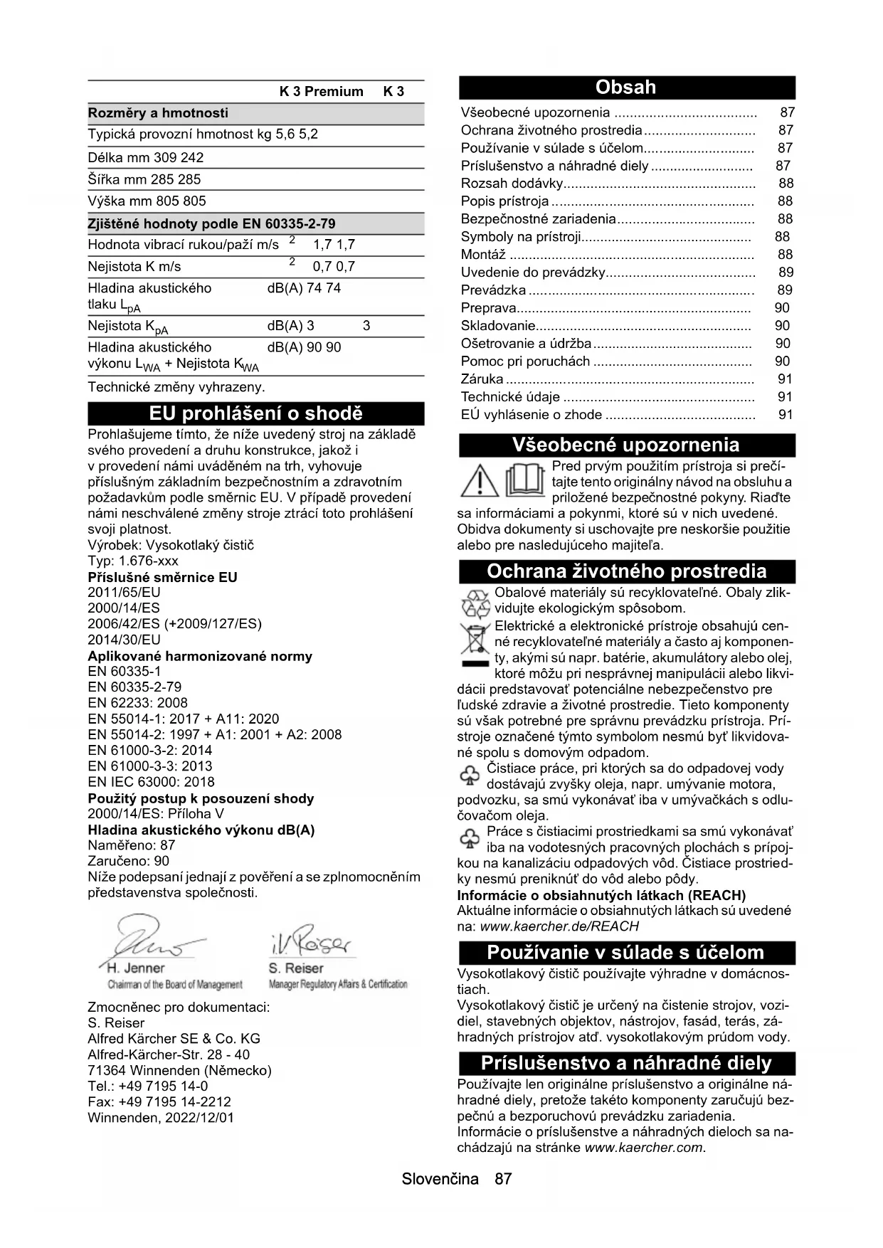 prostriedok zalomená. Záruka V každej krajine platia záručné podmienky vydané na- šou príslušnou distribučnou spoločnosťou. Prípadné poruchy Vášho zariadenia odstránime v rámci záručnej doby zadarmo, pokiaľ ich príčinou boli materiálové ale- bo výrobné chyby. Pri uplatňovaní záruky sa spolu s do- kladom o kúpe obráťte na Vášho predajcu alebo na najbližšie autorizované servisné stredisko. (adresa je uvedená na zadnej strane) Technické údaje Technické zmeny vyhradené. EÚ vyhlásenie o zhode Týmto prehlasujeme, že nižšie označený stroj zodpove- dá na základe svojej koncepcie a konštrukčného vyho- tovenia, ako aj od vyhotovení, ktoré sme uviedli do prevádzky, príslušným základným bezpečnostným a zdravotným požiadavkám smerníc ES. V prípade zme- ny, ktorú neschválime, stráca toto prehlásenie platnosť. Výrobok: Vysokotlakový čistič Typ: 1.676-xxx Príslušné smernice EÚ 2011/65/EÚ 2000/14/ES 2006/42/ES (+2009/127/ES) 2014/30/EÚ Aplikované harmonizované normy EN 60335-1 EN 60335-2-79 EN 62233: 2008 EN 55014-1: 2017 + A11: 2020 EN 55014-2: 1997 + A1: 2001 + A2: 2008 EN 61000-3-2: 2014 EN 61000-3-3: 2013 EN IEC 63000: 2018 Uplatňované postupy posudzovania zhody 2000/14/ES: Príloha V Hladina akustického výkonu dB (A) Namerané: 87 Zaručené: 90 Podpísané osoby konajú z poverenia a s plnou mocou vedenia spoločnosti. Osoba zodpovedná za dokumentáciu: S. Reiser Alfred Kärcher SE & Co. KG Alfred-Kärcher-Str. 28 - 40 71364 Winnenden (Germany) Tel.: +49 7195 14-0 Fax: +49 7195 14-2212 Winnenden, 2022/12/01 K 3 Premium K 3 Elektrická prípojka Napätie V 220-240 220-240 Fáza ~ 1 1 Frekvencia Hz 50-60 50-60 Odber prúdu A 6 6 Stupeň ochrany IPX5 IPX5 Trieda ochrany II II Zaistenie siete (zotrvačné) A 10 10 Prípojka vody Prívodný tlak (max.) MPa 1,2 1,2 Teplota vody na prítoku (max.) °C 40 40 Privádzané množstvo (min.) l/min 8 8 Výkonové údaje prístroja Prevádzkový tlak MPa 8,0 8,0 Max. povolený tlak MPa 12,0 12,0 Prietok, voda l/min 5,5 5,5 Maximálny prietok l/min 6,3 6,3 Prietok, čistiace prostriedky l/min 0,3 0,3 Sila spätného nárazu vysokotlakovej pištole N12 12 Rozmery a hmotnosti Typická prevádzková hmotnosť kg 5,6 5,2 Dĺžka mm 309 242 Šírka mm 285 285 Výška mm 805 805 Zistené hodnoty podľa EN 60335-2-79 Hodnota vibrácií ruka- rameno m/s