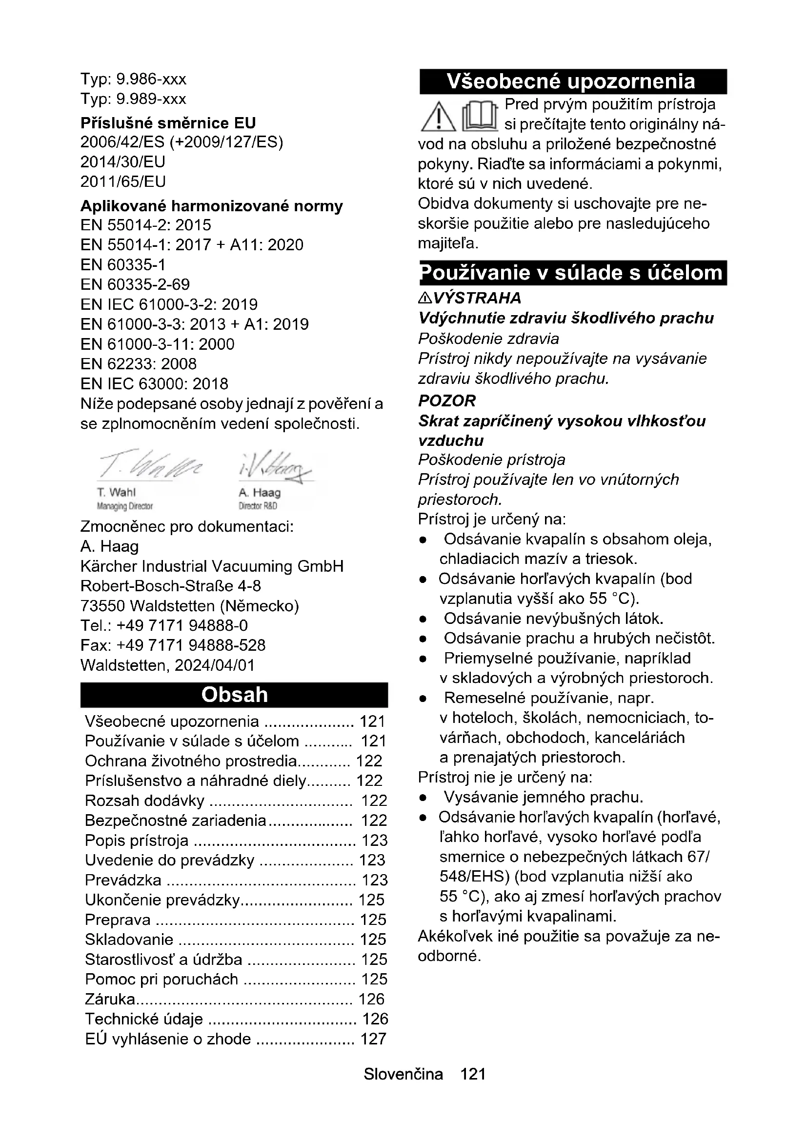 • EN 61000-3-3: 2013 + A1: 2019 EN 61000-3-11: 2000 EN 62233: 2008 EN IEC 63000: 2018 Níže podepsané osoby jednají z pověření a se zplnomocněním vedení společnosti. Zmocněnec pro dokumentaci: A. Haag Kärcher Industrial Vacuuming GmbH Robert-Bosch-Straße 4-8 73550 Waldstetten (Německo) Tel.: +49 7171 94888-0 Fax: +49 7171 94888-528 Waldstetten, 2024/04/01 Obsah Všeobecné upozornenia Pred prvým použitím prístroja si prečítajte tento originálny ná- vod na obsluhu a priložené bezpečnostné pokyny. Riaďte sa informáciami a pokynmi, ktoré sú v nich uvedené. Obidva dokumenty si uschovajte pre ne- skoršie použitie alebo pre nasledujúceho majiteľa. Používanie v súlade s účelom 몇 VÝSTRAHA Vdýchnutie zdraviu škodlivého prachu Poškodenie zdravia Prístroj nikdy nepoužívajte na vysávanie zdraviu škodlivého prachu. POZOR Skrat zapríčinený vysokou vlhkosťou vzduchu Poškodenie prístroja Prístroj používajte len vo vnútorných priestoroch. Prístroj je určený na: ● Odsávanie kvapalín s obsahom oleja, chladiacich mazív a triesok. ● Odsávanie horľavých kvapalín (bod vzplanutia vyšší ako 55 °C). ● Odsávanie nevýbušných látok. ● Odsávanie prachu a hrubých nečistôt. ● Priemyselné používanie, napríklad v skladových a výrobných priestoroch. ● Remeselné používanie, napr. v hoteloch, školách, nemocniciach, to- várňach, obchodoch, kanceláriách a prenajatých priestoroch. Prístroj nie je určený na: ● Vysávanie jemného prachu. ● Odsávanie horľavých kvapalín (horľavé, ľahko horľavé, vysoko horľavé podľa smernice o nebezpečných látkach 67/ 548/EHS) (bod vzplanutia nižší ako 55 °C), ako aj zmesí horľavých prachov s horľavými kvapalinami. Akékoľvek iné použitie sa považuje za ne- odborné. Všeobecné upozornenia p. 121
