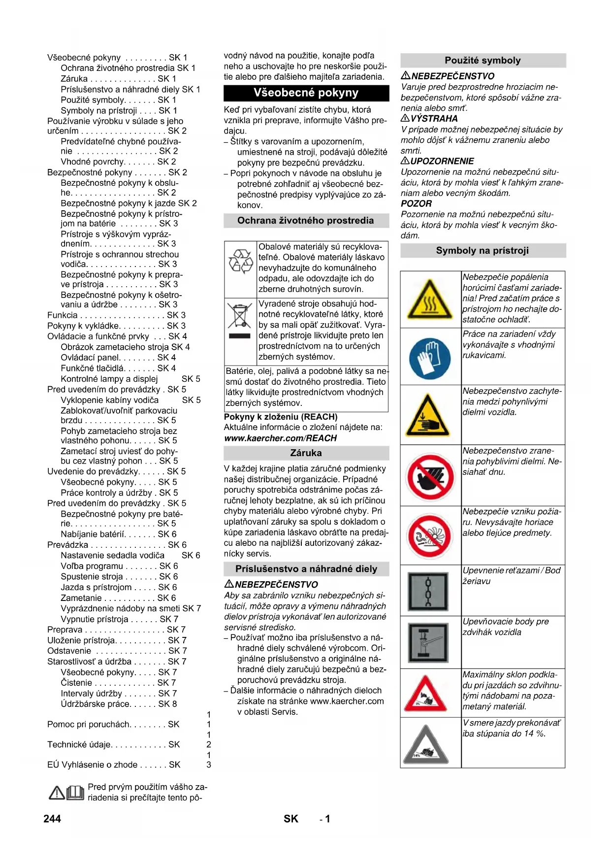 Všeobecné pokyny Ochrana životného prostredia Obalové materiály sú recyklova- teľné. Obalové materiály láskavo nevyhadzujte do komunálneho odpadu, ale odovzdajte ich do zberne druhotných surovín. Vyradené stroje obsahujú hod- notné recyklovateľné látky, ktoré by sa mali opäť zužitkovať. Vyra- dené prístroje likvidujte preto len prostredníctvom na to určených zberných systémov. Batérie, olej, palivá a podobné látky sa ne- smú dostať do životného prostredia. Tieto látky likvidujte prostredníctvom vhodných zberných systémov. Záruka Príslušenstvo a náhradné diely Použité symboly Symboly na prístroji Nebezpečie popálenia horúcimi časťami zariade- nia! Pred začatím práce s prístrojom ho nechajte do- statočne ochladiť. Práce na zariadení vždy vykonávajte s vhodnými rukavicami. Nebezpečenstvo zachyte- nia medzi pohynlivými dielmi vozidla. Nebezpečenstvo zrane- nia pohyblivimi dielmi. Ne- siahať dnu. Nebezpečie vzniku požia- ru. Nevysávajte horiace alebo tlejúce predmety. Upevnenie reťazami / Bod žeriavu Upevňovacie body pre zdvihák vozidla Maximálny sklon podkla- du pri jazdách so zdvihnu- tými nádobami na poza- metaný materiál. V smere jazdy prekonávať iba stúpania do 14 %. 244 SK- 2 Zametací stroj je určený na čistenie podla- hových plôch na podnikateľské účely a napríklad pre nasledujúce oblasti používa- nia: Parkoviská Výrobné zariadenia Logistické oblasti Hotel Maloobchod Sklady Chodníky – Tento zametací stroj je určený na za- metanie znečistených plôch vo vnútor- ných a vonkajších priestoroch. – Pred použitím skontrolujte, či sa prístroj a jeho pracovné vybavenie nachádzajú v riadnom stave a či je zabezpečená ich prevádzková bezpečnosť. Pokiaľ nie je stav v poriadku, nesmie sa použí- vať. – Tento zametací stroj používajte výhrad- ne podľa údajov v tomto návode na pre- vádzku. – Na zariadení sa nesmú vykonat' žiadne zmeny. – Zariadenie je vhodné iba na povrchy uvedené v návode na použitie. – Smie sa jazdiť iba po plochách schvále- ných pre použitie stroja dodávateľom alebo ním poverenými osobami. – Všeobecne platí: Nepribližovať sa s ľahko horľavými látkami do blízkosti stroja (Nebezpečenstvo výbuchu/po- žiaru). Nikdy nevysávajte výbušné kvapaliny, horľavé plyny ako aj neriedené kyseliny a rozpúšťadlá! K tomu patria benzín, rozpúšťadlá farieb alebo vykurovací olej, ktoré vírením s nasávaným vzdu- chom môžu tvoriť výbušné pary alebo zmesi, ďalej acetón, neriedené kyseliny a rozpúšťadlá, pretože porušujú mate- riály použité na prístroji. Nikdy nezametajte/nevysávajte reaktív- ny kovový prach (napr. hliník, magné- zium, zinok), v spojení so silne alkalic- kými alebo kyslými čistiacimi prostried- kami vytvára výbušné plyny. Nenametať alebo nenasávať žiadne horiace alebo tlejúce predmety. Zariadenie nie je vhodné pre vysávanie zdraviu škodlivých látok. Zdržiavať sa v nebezpečnej zóne je za- kázané. Prevádzka v priestoroch ohro- zených výbuchom je zakázaná. Vozenie sprievodných osôb nie je do- volené. Posúvanie alebo prepravovanie pred- metov nie je s týmto prístrojom povole- né. – Asfalt – Priemyselné podlahy – Podlahové krytiny – Betón – Dlažobné kamene Pre dodržanie vzdušných a povrcho- vých vzdialeností sa prístroj nesmie prevádzkovať vo vyššej nadmorskej výške ako 2 000 m n.m. (Platí len pre Fínsko) Ak je prístroj vy- bavený hadicovým vedením z PVC, ne- mal by sa používať pri nízkych teplo- tách okolia (nižších ako 0°C). V prípade otázok týkajúcich sa Vášho prístroja kontaktujte spoločnosť Kärcher. Pred použitím skontrolujte, či sa prístroj a jeho pracovné vybavenie nachádzajú v riadnom stave a či je zabezpečená ich prevádzková bezpečnosť. Pokiaľ nie je stav v poriadku, nesmie sa použí- vať. Pri používaní tohto zariadenia v nebez- pečných oblastiach (napr. čerpacích staniciach pohonných hmôt) dodržia- vajte príslušné bezpečnostné predpisy. Prevádzka v priestoroch ohrozených výbuchom je zakázaná. NEBEZPEČENSTVO Nebezpečenstvo poranenia! Zariadenie sa nemôže používať bez ochrannej strechy proti padajúcim pred- metom v priestoroch, kde existuje mož- nosť, že by obsluhujúca osoba mohla byť zasiahnutá padajúcimi predmetmi. Obsluha musí používať prístroj v súlade s určením. Musí zohľadniť miestne danosti a pri práci s prístrojom dávať pozor na tretie osoby, obzvlášť na deti. Zásadne sa musia dodržiavať predpisy, pravidlá a nariadenia, ktoré platia pre motorové vozidlá Pred začiatkom činností sa musí ob- služný personál ubezpečiť, že sú všetky ochranné zariadenia namontované podľa predpisov a funkčné. Obsluha prístroja je zodpovedná za úrazy spôsobené iným osobám a poš- kodenie ich majetku. Dávajte pozor na priliehavé oblečenie personálu. Noste pevnú obuv a zabráň- te noseniu voľného oblečenia. Pred spustením skontrolujte blízke oko- lie (napr. deti). Dávajte pozor na dosta- točný výhľad! Stroj sa nesmie nikdy ponechať bez do- zoru, kým je motor v činnosti. Obsluha môže prístroj opustiť až po vypnutí mo- tora, po zaistení stroja proti neúmysel- nému pohybu a po vytiahnutí kľúča. Zabráňte používaniu stroja nepovola- nými osobami. Vytiahnite kľúčik. Prístroj smú používať iba osoby, ktoré sú poučené o ovládaní alebo preukázali svoje schopnosti obsluhovať ho a sú výslovne poverené použitím. Tento prístroj nie je určený nato, aby ho používali osoby (vrátane detí) s obmedzenými fyzickými, senzorický- mi alebo duševnými schopnosťami ale- bo s nedostatkom skúseností a/alebo nedostatočnými znalosťami prístroja, môžu ho použiť iba v tom prípade, ak sú kvôli vlastnej bezpečnosti pod dozorom spoľahlivej oso