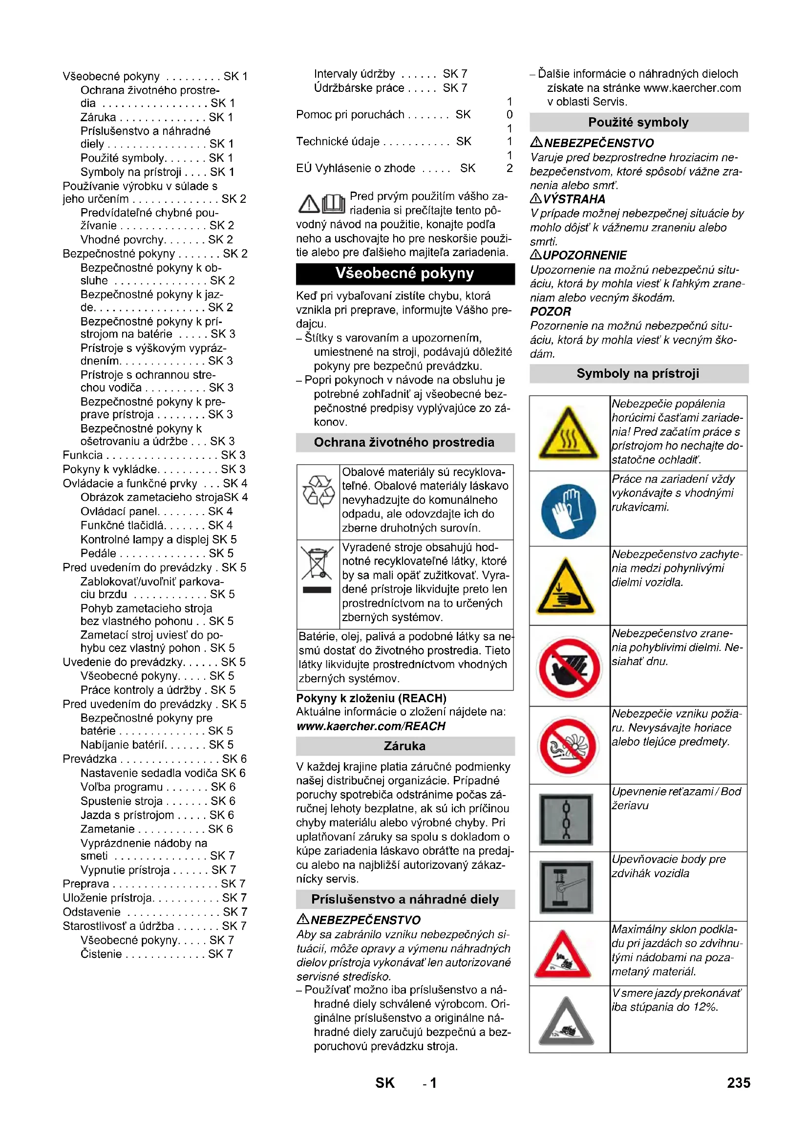 Všeobecné pokyny Ochrana životného prostredia Obalové materiály sú recyklova- teľné. Obalové materiály láskavo nevyhadzujte do komunálneho odpadu, ale odovzdajte ich do zberne druhotných surovín. Vyradené stroje obsahujú hod- notné recyklovateľné látky, ktoré by sa mali opäť zužitkovať. Vyra- dené prístroje likvidujte preto len prostredníctvom na to určených zberných systémov. Batérie, olej, palivá a podobné látky sa ne- smú dostať do životného prostredia. Tieto látky likvidujte prostredníctvom vhodných zberných systémov. Záruka Príslušenstvo a náhradné diely Použité symboly Symboly na prístroji Nebezpečie popálenia horúcimi časťami zariade- nia! Pred začatím práce s prístrojom ho nechajte do- statočne ochladiť. Práce na zariadení vždy vykonávajte s vhodnými rukavicami. Nebezpečenstvo zachyte- nia medzi pohynlivými dielmi vozidla. Nebezpečenstvo zrane- nia pohyblivimi dielmi. Ne- siahať dnu. Nebezpečie vzniku požia- ru. Nevysávajte horiace alebo tlejúce predmety. Upevnenie reťazami / Bod žeriavu Upevňovacie body pre zdvihák vozidla Maximálny sklon podkla- du pri jazdách so zdvihnu- tými nádobami na poza- metaný materiál. V smere jazdy prekonávať iba stúpania do 12%. 235SK- 2 Zametací stroj je určený na čistenie podla- hových plôch na podnikateľské účely a napríklad pre nasledujúce oblasti používa- nia: Parkoviská Výrobné zariadenia Logistické oblasti Hotel Maloobchod Sklady Chodníky – Tento zametací stroj je určený na za- metanie znečistených plôch vo vnútor- ných a vonkajších priestoroch. – Pred použitím skontrolujte, či sa prístroj a jeho pracovné vybavenie nachádzajú v riadnom stave a či je zabezpečená ich prevádzková bezpečnosť. Pokiaľ nie je stav v poriadku, nesmie sa použí- vať. – Tento zametací stroj používajte výhrad- ne podľa údajov v tomto návode na pre- vádzku. – Na zariadení sa nesmú vykonat' žiadne zmeny. – Zariadenie je vhodné iba na povrchy uvedené v návode na použitie. – Smie sa jazdiť iba po plochách schvále- ných pre použitie stroja dodávateľom alebo ním poverenými osobami. – Všeobecne platí: Nepribližovať sa s ľahko horľavými látkami do blízkosti stroja (Nebezpečenstvo výbuchu/po- žiaru). Nikdy nevysávajte výbušné kvapaliny, horľavé plyny ako aj neriedené kyseliny a rozpúšťadlá! K tomu patria benzín, rozpúšťadlá farieb alebo vykurovací olej, ktoré vírením s nasávaným vzdu- chom môžu tvoriť výbušné pary alebo zmesi, ďalej acetón, neriedené kyseliny a rozpúšťadlá, pretože porušujú mate- riály použité na prístroji. Nikdy nezametajte/nevysávajte reaktív- ny kovový prach (napr. hliník, magné- zium, zinok), v spojení so silne alkalic- kými alebo kyslými čistiacimi prostried- kami vytvára výbušné plyny. Nenametať alebo nenasávať žiadne horiace alebo tlejúce predmety. Zariadenie nie je vhodné pre vysávanie zdraviu škodlivých látok. Zdržiavať sa v nebezpečnej zóne je za- kázané. Prevádzka v priestoroch ohro- zených výbuchom je zakázaná. Vozenie sprievodných osôb nie je do- volené. Posúvanie alebo prepravovanie pred- metov nie je s týmto prístrojom povole- né. – Asfalt – Priemyselné podlahy – Podlahové krytiny – Betón – Dlažobné kamene Pre dodržanie vzdušných a povrcho- vých vzdialeností sa prístroj nesmie prevádzkovať vo vyššej nadmorskej výške ako 2 000 m n.m. (Platí len pre Fínsko) Ak je prístroj vy- bavený hadicovým vedením z PVC, ne- mal by sa používať pri nízkych teplo- tách okolia (nižších ako 0°C). V prípade otázok týkajúcich sa Vášho prístroja kontaktujte spoločnosť Kärcher. Pred použitím skontrolujte, či sa prístroj a jeho pracovné vybavenie nachádzajú v riadnom stave a či je zabezpečená ich prevádzková bezpečnosť. Pokiaľ nie je stav v poriadku, nesmie sa použí- vať. Pri používaní tohto zariadenia v nebez- pečných oblastiach (napr. čerpacích staniciach pohonných hmôt) dodržia- vajte príslušné bezpečnostné predpisy. Prevádzka v priestoroch ohrozených výbuchom je zakázaná. NEBEZPEČENSTVO Nebezpečenstvo poranenia! Zariadenie sa nemôže používať bez ochrannej strechy proti padajúcim pred- metom v priestoroch, kde existuje mož- nosť, že by obsluhujúca osoba mohla byť zasiahnutá padajúcimi predmetmi. Obsluha musí používať prístroj v súlade s určením. Musí zohľadniť miestne danosti a pri práci s prístrojom dávať pozor na tretie osoby, obzvlášť na deti. Zásadne sa musia dodržiavať predpisy, pravidlá a nariadenia, ktoré platia pre motorové vozidlá Pred začiatkom činností sa musí ob- služný personál ubezpečiť, že sú všetky ochranné zariadenia namontované podľa predpisov a funkčné. Obsluha prístroja je zodpovedná za úrazy spôsobené iným osobám a poš- kodenie ich majetku. Dávajte pozor na priliehavé oblečenie personálu. Noste pevnú obuv a zabráň- te noseniu voľného oblečenia. Pred spustením skontrolujte blízke oko- lie (napr. deti). Dávajte pozor na dosta- točný výhľad! Stroj sa nesmie nikdy ponechať bez do- zoru, kým je motor v činnosti. Obsluha môže prístroj opustiť až po vypnutí mo- tora, po zaistení stroja proti neúmysel- nému pohybu a po vytiahnutí kľúča. Zabráňte používaniu stroja nepovola- nými osobami. Vytiahnite kľúčik. Prístroj smú používať iba osoby, ktoré sú poučené o ovládaní alebo preukázali svoje schopnosti obsluhovať ho a sú výslovne poverené použitím. Tento prístroj nie je určený nato, aby ho používali osoby (vrátane detí) s obmedzenými fyzickými, senzorický- mi alebo duševnými schopnosťami ale- bo s nedostatkom skúseností a/alebo nedostatočnými znalosťami prístroja, môžu ho použiť iba v tom prípade, ak sú kvôli vlastnej bezpečnosti pod dozorom spoľahlivej osoby