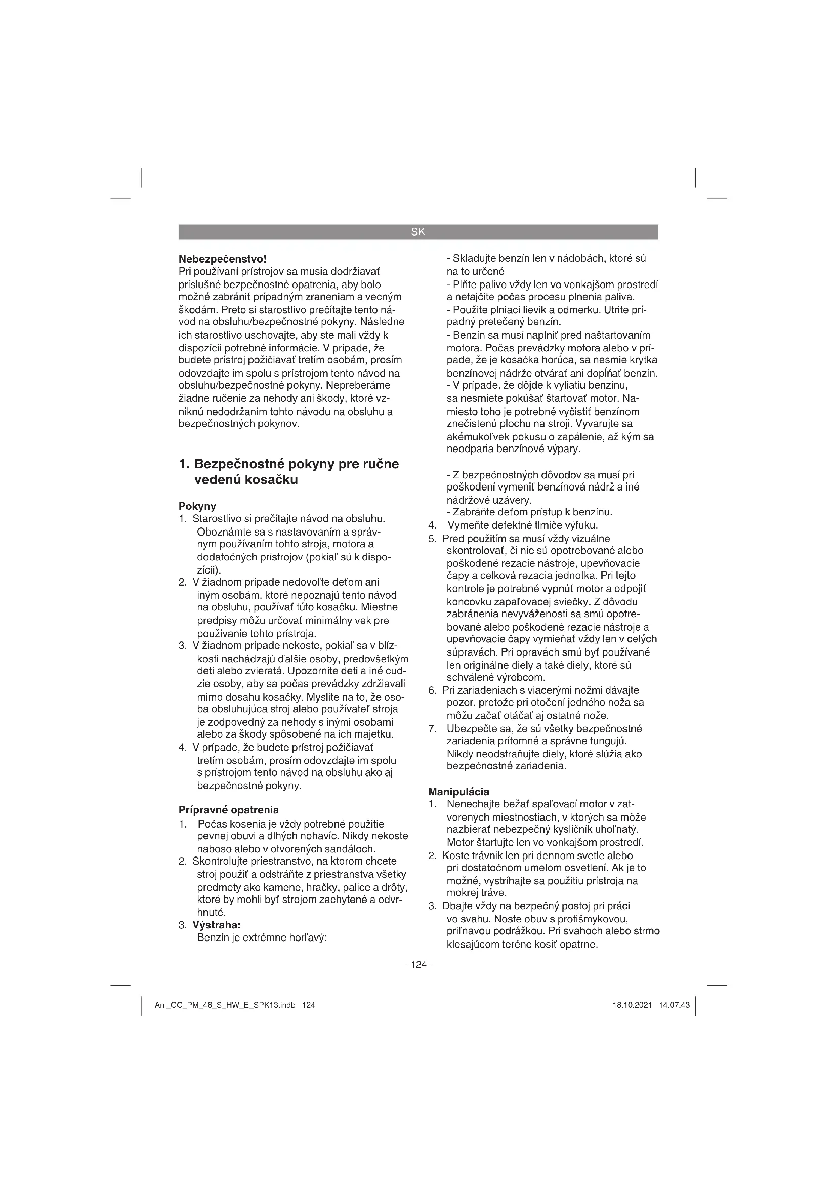 Benzín je extrémne horľavý: - Skladujte benzín len v nádobách, ktoré sú na to určené - Plňte palivo vždy len vo vonkajšom prostredí a nefajčite počas procesu plnenia paliva. - Použite plniaci lievik a odmerku. Utrite prí- padný pretečený benzín. - Benzín sa musí naplniť pred naštartovaním motora. Počas prevádzky motora alebo v prí- pade, že je kosačka horúca, sa nesmie krytka benzínovej nádrže otvárať ani dopĺň ať benzín. - V prípade, že dôjde k vyliatiu benzínu, sa nesmiete pokúšať štartovať motor. Na- miesto toho je potrebné vyčistiť benzínom znečistenú plochu na stroji. Vyvarujte sa akémukoľvek pokusu o zapálenie, až kým sa neodparia benzínové výpary. - Z bezpečnostných dôvodov sa musí pri poškodení vymeniť benzínová nádrž a iné nádržové uzávery. - Zabráňte deťom prístup k benzínu.