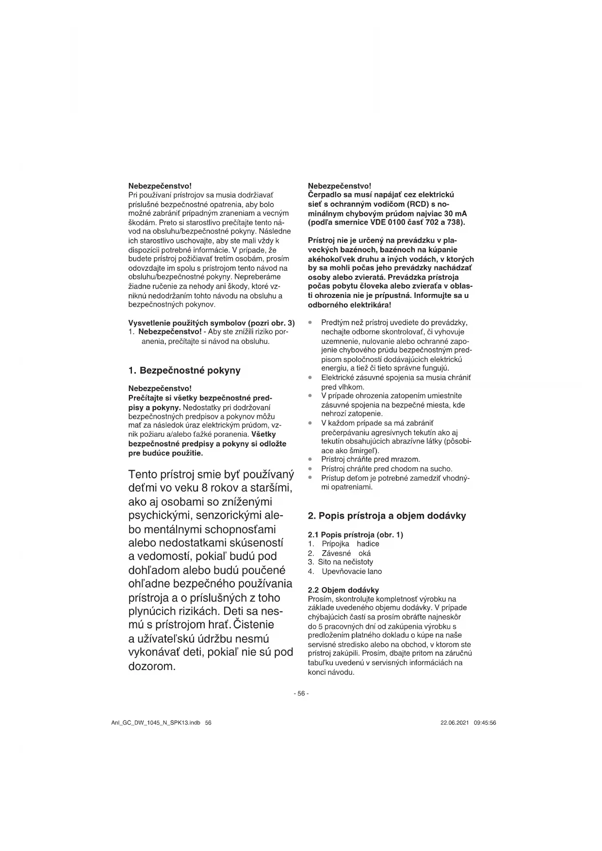 Nebezpečenstvo! Prečítajte si všetky bezpečnostné pred- pisy a pokyny. Nedostatky pri dodržovaní bezpečnostných predpisov a pokynov môžu mať za následok úraz elektrickým prúdom, vz- nik požiaru a/alebo ťažké poranenia. Všetky bezpečnostné predpisy a pokyny si odložte pre budúce použitie. Tento prístroj smie byť používaný deťmi vo veku 8 rokov a staršími, ako aj osobami so zníženými psychickými, senzorickými ale- bo mentálnymi schopnosťami alebo nedostatkami skúseností a vedomostí, pokiaľ budú pod dohľadom alebo budú poučené ohľadne bezpečného používania prístroja a o príslušných z toho plynúcich rizikách. Deti sa nes- mú s prístrojom hrať. Čistenie a užívateľskú údržbu nesmú vykonávať deti, pokiaľ nie sú pod dozorom. Nebezpečenstvo! Čerpadlo sa musí napájať cez elektrickú sieť s ochranným vodičom (RCD) s no- minálnym chybovým prúdom najviac 30 mA (podľa smernice VDE 0100 časť 702 a 738). Prístroj nie je určený na prevádzku v pla- veckých bazénoch, bazénoch na kúpanie akéhokoľvek druhu a iných vodách, v ktorých by sa mohli počas jeho prevádzky nachádzať osoby alebo zvieratá. Prevádzka prístroja počas pobytu človeka alebo zvieraťa v oblas- ti ohrozenia nie je prípustná. Informujte sa u odborného elektrikára!