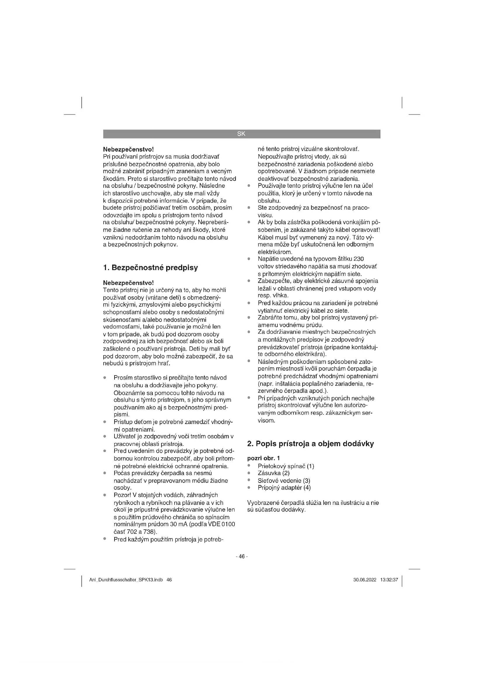 do zásuvky. Po skontrolovaní všetkých vytvor- ených pripojení a vedení sa na tlakové vedenie musí zapojiť spotrebič a je ho potrebné otvoriť, aby pri zač iatku prepravného procesu mohol z tlakového vedenia uniknúť vzduch, ktorý sa tam nachádza. Sieťový kábel (obr. 1/pol. 3) prieto- kového spínača zapojiť na dostatočne poistenú zásuvku 230 V ~ 50 Hz s ochranným kontaktom (min. 10 A). Prietokový spínač je teraz pripravený na prevádzku. Zapnúť čerpadlo v prípade, že je vybavené spínačom, v opačnom prípade sa čerpadlo spustí automaticky a začne prepravovať. Spotrebič sa môže zavrieť, keď začne vytekať prepravná tekutina. Prietokový spínač teraz vypne zásuvku (obr. 1/pol. 2). Demontáž sa uskutoční adekvátne v opačnom poradí. Pri uskladnení dbať na to, aby sa v prietokovom spínači nenachádza- la žiadna prepravná tekutina, aby sa zabránilo škodám spôsobeným mrazom.