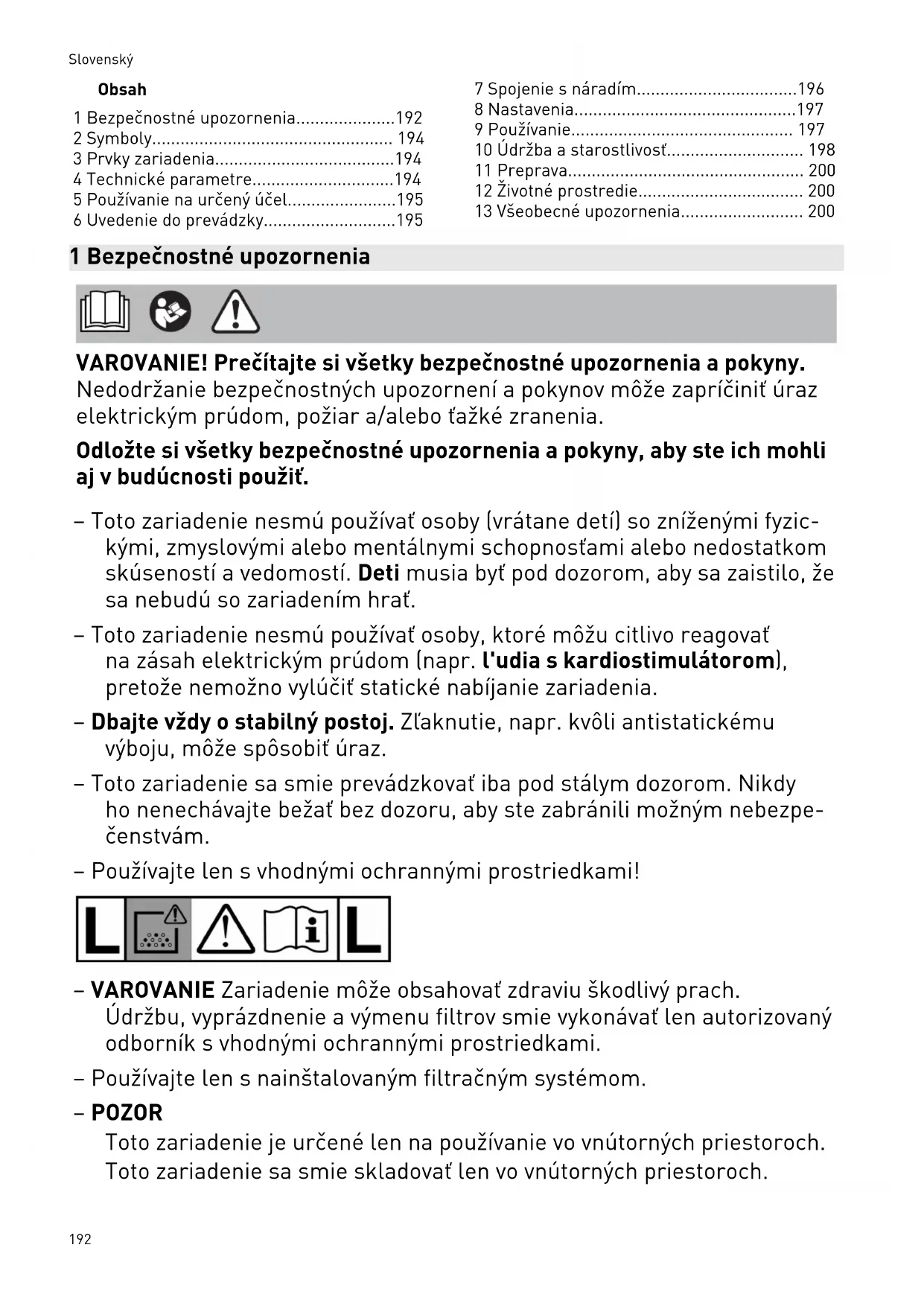 - 13 Všeobecné upozornenia 1 Bezpečnostné upozornenia VAROVANIE! Prečítajte si všetky bezpečnostné upozornenia apokyny. Nedodržanie bezpečnostných upozornení apokynov môže zapríčiniť úraz elektrickým prúdom, požiar a/alebo ťažké zranenia. Odložte si všetky bezpečnostné upozornenia apokyny, aby ste ich mohli aj vbudúcnosti použiť. – Toto zariadenie nesmú používať osoby (vrátane detí) so zníženými fyzic kými, zmyslovými alebo mentálnymi schopnosťami alebo nedostatkom skúseností avedomostí. Deti musia byť pod dozorom, aby sa zaistilo, že sa nebudú sozariadením hrať. – Toto zariadenie nesmú používať osoby, ktoré môžu citlivo reagovať na zásah elektrickým prúdom (napr. l'udia s kardiostimulátorom), pretože nemožno vylúčiť statické nabíjanie zariadenia. – Dbajte vždy ostabilný postoj. Zľaknutie, napr. kvôli antistatickému výboju, môže spôsobiť úraz. – Toto zariadenie sa smie prevádzkovať iba pod stálym dozorom. Nikdy ho nenechávajte bežať bez dozoru, aby ste zabránili možným nebezpe čenstvám. – Používajte len svhodnými ochrannými prostriedkami! – VAROVANIE Zariadenie môže obsahovať zdraviu škodlivý prach. Údržbu, vyprázdnenie avýmenu filtrov smie vykonávať len autorizovaný odborník svhodnými ochrannými prostriedkami. – Používajte len snainštalovaným filtračným systémom. – POZOR Toto zariadenie je určené len na používanie vo vnútorných priestoroch. Toto zariadenie sa smie skladovať len vo vnútorných priestoroch. Slovenský 192– Varovanie Zásuvku na zariadení používajte len na účely stanovené vpokynoch. – VAROVANIE Pri vystupovaní peny alebo kvapaliny stroj ihneď vypnite. – POZOR Zariadenie na obmedzenie stavu (hladiny) vody pravidelne čistite akontrolujte výskyt náznakov poškodenia. – VAROVANIE Obsluhujúci pracovníci musia byť primerane zaškolení opoužívaní tohto zariadenia. – VAROVANIE Pri odsávaní druhov prachu, ktoré prekračujú hraničnú hodnotu alebo pri značnom objeme prachu zdubového alebo bukového dreva odsávajte len jediný zdroj prachu (elektrické alebo pneumatické náradie). – Nebezpečenstvo výbuchu apožiaru! Nevysávajte: – iskry, žeravé čiastočky alebo horúci prach; – horľavé alebo výbušné látky (napr. horčík, hliník, benzín, riedidlá); – agresívne látky (napr. kyseliny, lúhy, rozpúšťadlá); – chemicky reaktívne látky, ktoré vedú kvzniku tepla, kyselín/zásad, plynov atď. (napr. reaktívne dvojzložkové materiály, hliník avoda). – Dodržiavajte národné bezpečnostné predpisy aúdaje výrobcu mate riálov! – Pred čistením alebo údržbou alebo pri výmene opotrebovaných dielov alebo pri prestavbe zariadenia sa musí vždy najskôr vytiahnuť sieťová zástrčka zo zásuvky. – So zariadením pracujte len vtedy, keď zistíte vizuálnou kontrolou, že je neporušené, vsuchom prostredí, po poučení! – Pravidelne kontrolujte zástrčku, zásuvku, kábel afilter, aby ste zabrá nili ohrozeniu. Poškodené elektrické súčasti dajte vymeniť výhradne vautorizovanom zákazníckom servise. – Používajte len originálnu saciu hadicu Festool. – Zohľadnite pracovné prostredie apri preprave alebo práci snáradím dávajte pozor na seba aostatných. Vyvarujete sa tak napr. riziku zakopnutia osaciu hadicu alebo napájací kábel. – Zariadenie prenášajte iba za rukoväť, ktorá je na to určená. – Nezdvíhajte aneprepravujte pomocou háka žeriava alebo zdvíhacieho zariadenia. – Obalovú fóliu uchovávajte mimo dosahu detí. Hrozí nebezpečenstvo udusenia. Slovenský 1932 Symboly Varovanie pred všeobecným nebezpe čenstvom Varovanie pred zásahom elektrickým prúdom Prečítajte si návod na používanie, bezpečnostné upozornenia! Noste prostriedky na ochranu dýcha cích ciest. Tip, upozornenie Varovanie! Zariadenie môže obsahovať zdraviu škodlivý prach! TriedaprachuL (mierne nebezpečen stvo), vhodné na odsávanie prachu slimitnou hodnotou vystavenia vyššou ako 1mg/m p. 200