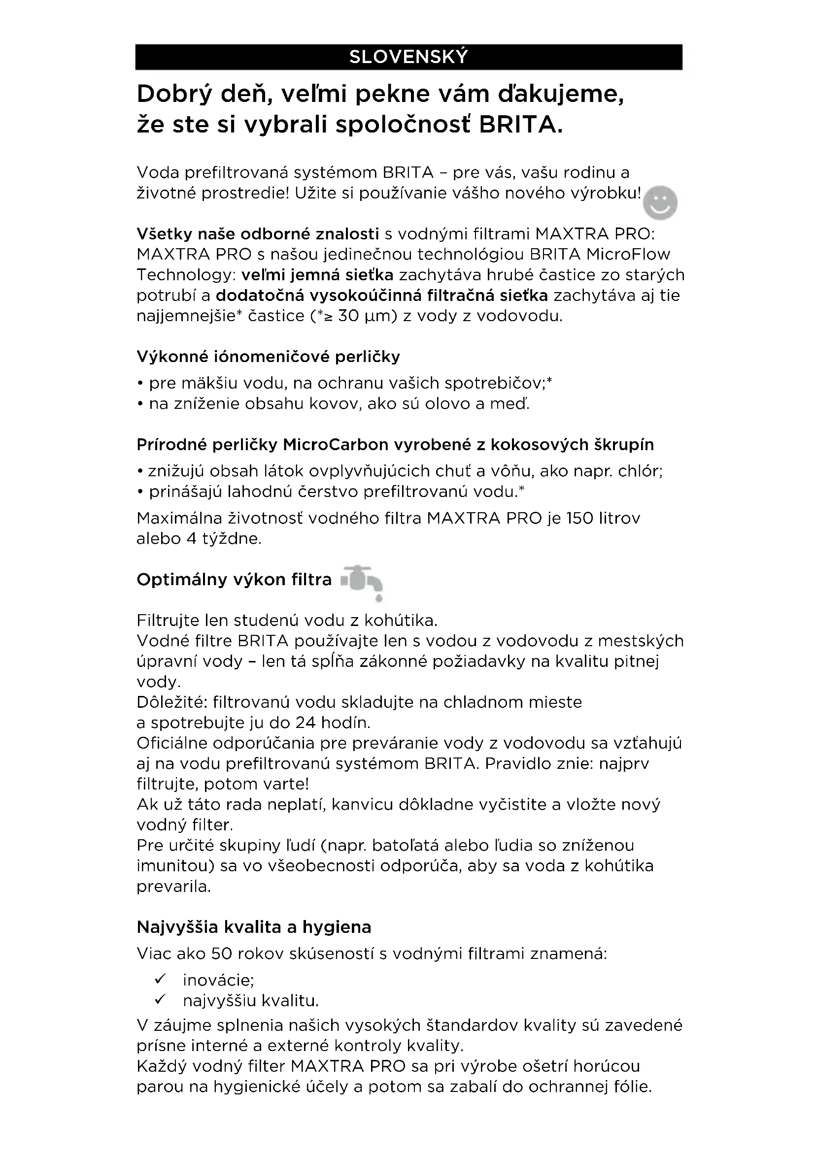- prinášajú lahodnú čerstvo prefiltrovanú vodu.* Maximálna životnosť vodného filtra MAXTRA PRO je 150 litrov alebo 4 týždne. Optimálny výkon filtra Filtrujte len studenú vodu zkohútika. Vodné filtre BRITA používajte len svodou z vodovodu zmestských úpravní vody – len tá spĺňa zákonné požiadavky na kvalitu pitnej vody. Dôležité: filtrovanú vodu skladujte na chladnom mieste aspotrebujte ju do 24hodín. Oficiálne odporúčania pre preváranie vody zvodovodu sa vzťahujú aj na vodu prefiltrovanú systémom BRITA. Pravidlo znie: najprv filtrujte, potom varte! Ak už táto rada neplatí, kanvicu dôkladne vyčistite avložte nový vodný filter. Pre určité skupiny ľudí (napr. batoľatá alebo ľudia so zníženou imunitou) sa vo všeobecnosti odporúča, aby sa voda zkohútika prevarila. Najvyššia kvalita ahygiena Viac ako 50 rokov skúseností svodnými filtrami znamená: 9 inovácie; 9 najvyššiu kvalitu. Vzáujme splnenia našich vysokých štandardov kvality sú zavedené prísne interné aexterné kontroly kvality. Každý vodný filter MAXTRA PRO sa pri výrobe ošetrí horúcou parou na hygienické účely apotom sa zabalí do ochrannej fólie.(Poznámka: vodný filter môže byť vlhký vdôsledku kondenzácie po ošetrení parou.) Filtračný materiál vodného filtra MAXTRA PRO je zhygienických dôvodov špeciálne ošetrený striebrom. Do vody sa môže uvoľniť malé množstvo striebra. Je to vsúlade sodporúčaniami Svetovej zdravotníckej organizácie (WHO). Spoločnosť BRITA odporúča pravidelne vymieňať vodný filter. Dodržiavajte odporúčané postupy čistenia arady týkajúce sa prípravy filtra (kapitoly 1–7). Kanvica by sa mala pravidelne čistiť. Poznámka: Ak sa kanvica dlhší čas nepoužíva, vyberte vodný filter, vyprázdnite kanvicu avodný filter voľne vložte do prázdneho lievika. Pozrite si kapitolu 7 „Výmena vodného filtra MAXTRA PRO“. Obsluha – veľmi jednoduchá