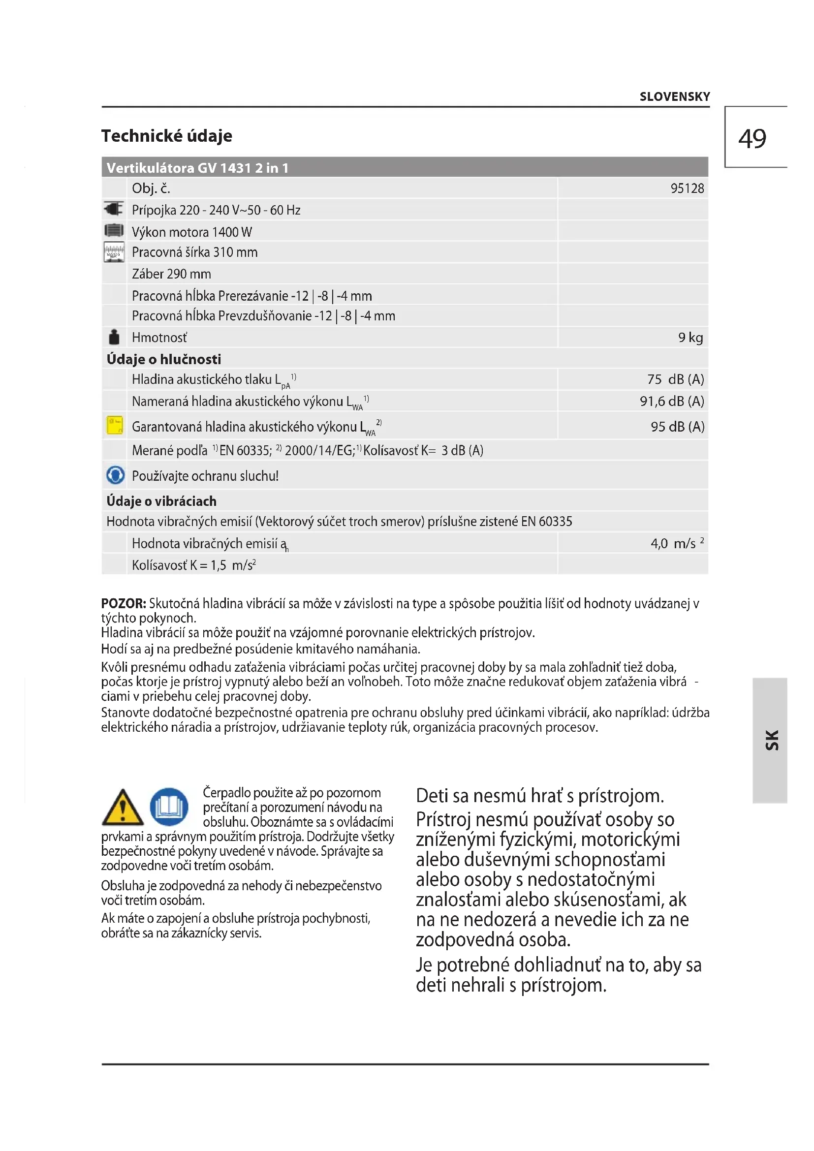 vaný autorizovaný personál, a to len pomocou originálnych náhradných dielov. Tým sa zaistí, že bezpečnosť prístroja zostane zachovaná. Bezpečnostné pokyny pre Vertikulátora Prevádzka je povolená len s ochranným vypínačom proti chybovému prúdu (RCD max. chybový prúd30 mA). Predlžovacie káble musia mať prierez kábla minimálne 1,5 mm². Neodporúča sa použitie predlžovacích káblov s odlišnou dĺžkou a odlišným prierezom, ako ani adaptérov a viacnásobných zástrčiek. Deti a ostatné osoby aj zvieratá držte počas používania prístroja v bezpečnej vzdialenosti. Minimálny bezpečnostný odstup je 5 m. Noste osobné ochranné pomôcky. Noste pevnú obuv a dlhé nohavice. Prístroj nepoužívajte nikdy bosí alebo v ľahkých sandáloch. Ak je to nutné, noste ochranné rukavice. Skontrolujte starostlivo terén, na ktorom sa bude stroj používať a odstráňte všetky predmety, ktoré by stroj mohol zachytiiť a vymrštiť, ako napr. kamene, vetvy, drôty a pod. Ak je to možné, vyhnite sa používaniu výrobku na mokrej tráve. Pred použitím prístroja sa vizuálnou kontrolou ubezpečte, že valce a skrutky nie sú tupé, opotrebené alebo poškodené. Opotrebené alebo poškodené valce a skrutky vymeňte, aby mohlo byť zabezpečené vyváženie prístroja. Ochranné zariadenia, ktoré sa nachádzajú na stroji, je striktne zakázané demontovať, meniť, používať v rozpore s ich určením alebo pripevňovať ochranné zariadenia iných výrobcov. Prístroj sa nesmie používať, ak je poškodený alebo sú chybné bezpečnostné zariadenia. Opotrebené a poškodené diely vymeňte. Motor spustite až vtedy, ak sú vaše nohy v bezpečnej vzdialenosti od rezných nástrojov. Stroj pri spúšťaní nenakláňajte. Stroj nespúšťajte, ak stojíte pred vyhadzovacím otvorom. Choďte! Nebeže! Dbajte na bezpečný postoj, predovšetkým na svahoch. Nepracujte na príliš strmých svahoch. Pri zmene smeru jazdy na svahoch buďte mimoriadne opatrní. Buďte mimoriadne opatrní, keď sa otáčate a prístroj ťaháte smerom k sebe. c) Zabráňte náhodnému uvedeniu do prevádzky. Uistite sa, že je elektrický prístroj vypnutý, skôr ako ho pripojíte k zdroju napájania a/alebo batérii, zdvihnete alebo ponesiete. Ak máte pri nosení elektrického prístroja prst na spínači alebo prístroj zapájate do siete zapnutý, môže to viesť k úrazom. d) Pred zapnutím odstráňte zelektrického prístro
