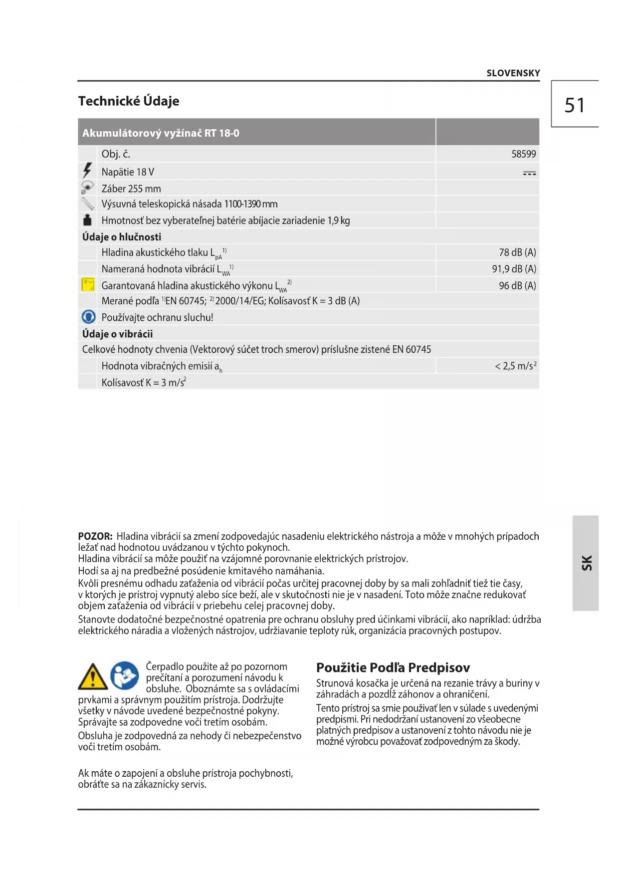 SLOVENSKY Čerpadlo použite až po pozornom prečítaní a porozumení návodu k obsluhe. Oboznámte sa s ovládacími prvkami a správnym použitím prístroja. Dodržujte všetky v návode uvedené bezpečnostné pokyny. Správajte sa zodpovedne voči tretím osobám. Obsluha je zodpovedná za nehody či nebezpečenstvo voči tretím osobám. Ak máte o zapojení a obsluhe prístroja pochybnosti, obráťte sa na zákaznícky servis. Použitie Podľa Predpisov Strunová kosačka je určená na rezanie trávy a buriny v záhradách a pozdĺž záhonov a ohraničení. Tento prístroj sa smie použivať len v súlade s uvedenými predpismi. Pri nedodržaní ustanovení zo všeobecne platných predpisov a ustanovení z tohto návodu nie je možné výrobcu považovať zodpovedným za škody. Technické Údaje Akumulátorový vyžínač RT 18-0 Obj. č.