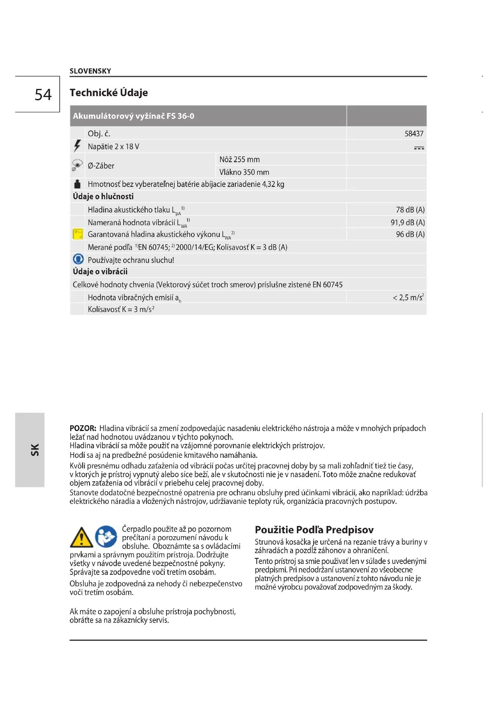 SLOVENSKY Čerpadlo použite až po pozornom prečítaní a porozumení návodu k obsluhe. Oboznámte sa s ovládacími prvkami a správnym použitím prístroja. Dodržujte všetky v návode uvedené bezpečnostné pokyny. Správajte sa zodpovedne voči tretím osobám. Obsluha je zodpovedná za nehody či nebezpečenstvo voči tretím osobám. Ak máte o zapojení a obsluhe prístroja pochybnosti, obráťte sa na zákaznícky servis. Použitie Podľa Predpisov Strunová kosačka je určená na rezanie trávy a buriny v záhradách a pozdĺž záhonov a ohraničení. Tento prístroj sa smie použivať len v súlade s uvedenými predpismi. Pri nedodržaní ustanovení zo všeobecne platných predpisov a ustanovení z tohto návodu nie je možné výrobcu považovať zodpovedným za škody. Technické Údaje Akumulátorový vyžínač FS 36-0 Obj. č.