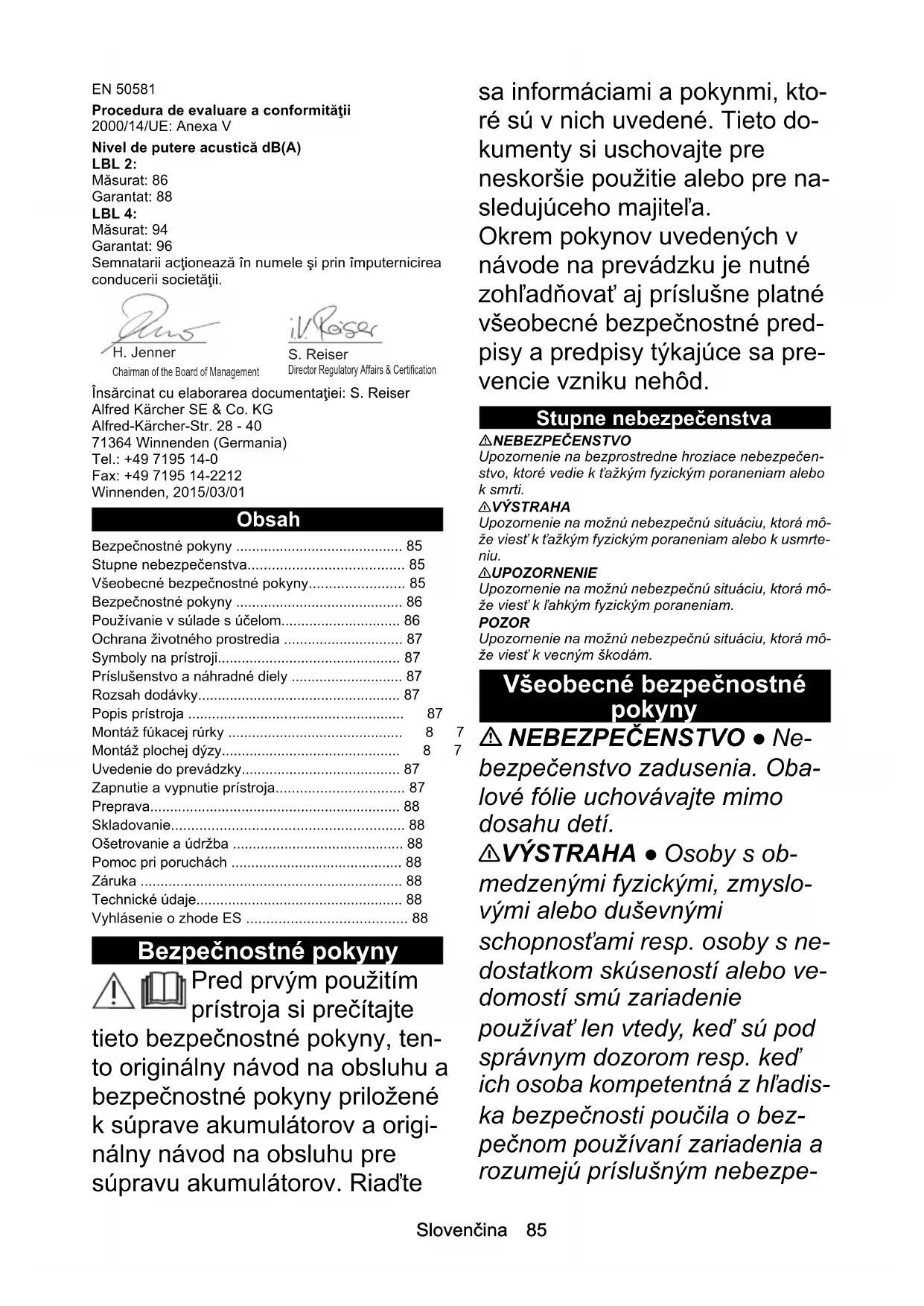 • dB(A)88889696 LBL 2 Battery LBL 2 Battery Set LBL 4 Battery LBL 4 Battery SetSlovenčina 85 EN 50581 Procedura de evaluare a conformităţii 2000/14/UE: Anexa V Nivel de putere acustică dB(A) LBL 2: Măsurat: 86 Garantat: 88 LBL 4: Măsurat: 94 Garantat: 96 Semnatarii acţionează în numele şi prin împuternicirea conducerii societăţii. Însărcinat cu elaborarea documentaţiei: S. Reiser Alfred Kärcher SE & Co. KG Alfred-Kärcher-Str. 28 - 40 71364 Winnenden (Germania) Tel.: +49 7195 14-0 Fax: +49 7195 14-2212 Winnenden, 2015/03/01 Obsah Bezpečnostné pokyny Pred prvým použitím prístroja si prečítajte tieto bezpečnostné pokyny, ten- to originálny návod na obsluhu a bezpečnostné pokyny priložené k súprave akumulátorov a origi- nálny návod na obsluhu pre súpravu akumulátorov. Riaďte sa informáciami a pokynmi, kto- ré sú v nich uvedené. Tieto do- kumenty si uschovajte pre neskoršie použitie alebo pre na- sledujúceho majiteľa. Okrem pokynov uvedených v návode na prevádzku je nutné zohľadňovať aj príslušne platné všeobecné bezpečnostné pred- pisy a predpisy týkajúce sa pre- vencie vzniku nehôd. Stupne nebezpečenstva NEBEZPEČENSTVO Upozornenie na bezprostredne hroziace nebezpečen- stvo, ktoré vedie k ťažkým fyzickým poraneniam alebo k smrti. 몇 VÝSTRAHA Upozornenie na možnú nebezpečnú situáciu, ktorá mô- že viesť k ťažkým fyzickým poraneniam alebo k usmrte- niu. 몇 UPOZORNENIE Upozornenie na možnú nebezpečnú situáciu, ktorá mô- že viesť k ľahkým fyzickým poraneniam. POZOR Upozornenie na možnú nebezpečnú situáciu, ktorá mô- že viesť k vecným škodám. Všeobecné bezpečnostné pokyny NEBEZPEČENSTVO ● Ne- bezpečenstvo zadusenia. Oba- lové fólie uchovávajte mimo dosahu detí. 몇 VÝSTRAHA ● Osoby s ob- medzenými fyzickými, zmyslo- vými alebo duševnými schopnosťami resp. osoby s ne- dostatkom skúseností alebo ve- domostí smú zariadenie používať len vtedy, keď sú pod správnym dozorom resp. keď ich osoba kompetentná z hľadis- ka bezpečnosti poučila o bez- pečnom používaní zariadenia a rozumejú príslušným nebezpe- Bezpečnostné pokyny p. 85