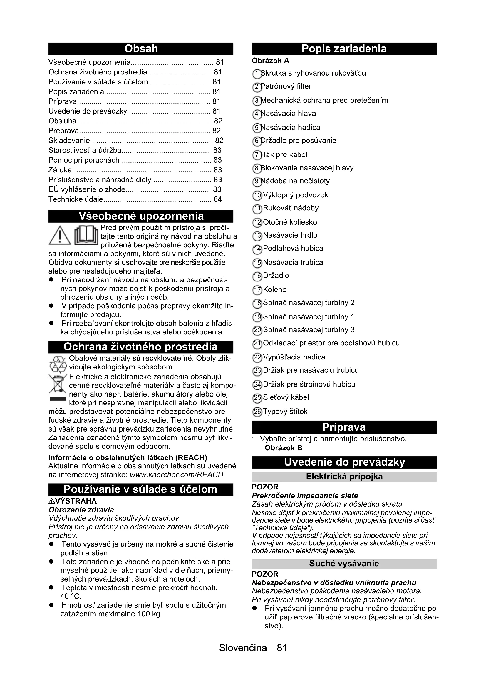H05VV-F 2x1,5 H05VV-F 2x1,5 Număr piesă (EU) 6.647-069.0 6.647-069.0 Lungime cablu m 10 10Slovenčina 81 Obsah Všeobecné upozornenia Pred prvým použitím prístroja si prečí- tajte tento originálny návod na obsluhu a priložené bezpečnostné pokyny. Riaďte sa informáciami a pokynmi, ktoré sú v nich uvedené. Obidva dokumenty si uschovajte pre neskoršie použitie alebo pre nasledujúceho majiteľa. Pri nedodržaní návodu na obsluhu a bezpečnost- ných pokynov môže dôjsť k poškodeniu prístroja a ohrozeniu obsluhy a iných osôb. V prípade poškodenia počas prepravy okamžite in- formujte predajcu. Pri rozbaľovaní skontrolujte obsah balenia z hľadis- ka chýbajúceho príslušenstva alebo poškodenia. Ochrana životného prostredia Obalové materiály sú recyklovateľné. Obaly zlik- vidujte ekologickým spôsobom. Elektrické a elektronické zariadenia obsahujú cenné recyklovateľné materiály a často aj kompo- nenty ako napr. batérie, akumulátory alebo olej, ktoré pri nesprávnej manipulácii alebo likvidácii môžu predstavovať potenciálne nebezpečenstvo pre ľudské zdravie a životné prostredie. Tieto komponenty sú však pre správnu prevádzku zariadenia nevyhnutné. Zariadenia označené týmto symbolom nesmú byť likvi- dované spolu s domovým odpadom. Informácie o obsiahnutých látkach (REACH) Aktuálne informácie o obsiahnutých látkach sú uvedené na internetovej stránke: www.kaercher.com/REACH Používanie v súlade s účelom 몇 VÝSTRAHA Ohrozenie zdravia Vdýchnutie zdraviu škodlivých prachov Prístroj nie je určený na odsávanie zdraviu škodlivých prachov. Tento vysávač je určený na mokré a suché čistenie podláh a stien. Toto zariadenie je vhodné na podnikateľské a prie- myselné použitie, ako napríklad v dielňach, priemy- selných prevádzkach, školách a hoteloch. Teplota v miestnosti nesmie prekročiť hodnotu 40 °C. Hmotnosť zariadenie smie byť spolu s užitočným zaťažením maximálne 100 kg. Popis zariadenia Obrázok A 1 Skrutka s ryhovanou rukoväťou 2 Patrónový filter 3 Mechanická ochrana pred pretečením 4 Nasávacia hlava 5 Nasávacia hadica 6 Držadlo pre posúvanie 7 Hák pre kábel 8 Blokovanie nasávacej hlavy 9 Nádoba na nečistoty 10 Výklopný podvozok 11 Rukoväť nádoby 12 Otočné koliesko 13 Nasávacie hrdlo 14 Podlahová hubica 15 Nasávacia trubica 16 Držadlo 17 Koleno 18 Spínač nasávacej turbíny 2 19 Spínač nasávacej turbíny 1 20 Spínač nasávacej turbíny 3 21 Odkladací priestor pre podlahovú hubicu 22 Vypúšťacia hadica 23 Držiak pre nasávaciu trubicu 24 Držiak pre štrbinovú hubicu 25 Sieťový kábel 26 Typový štítok Príprava