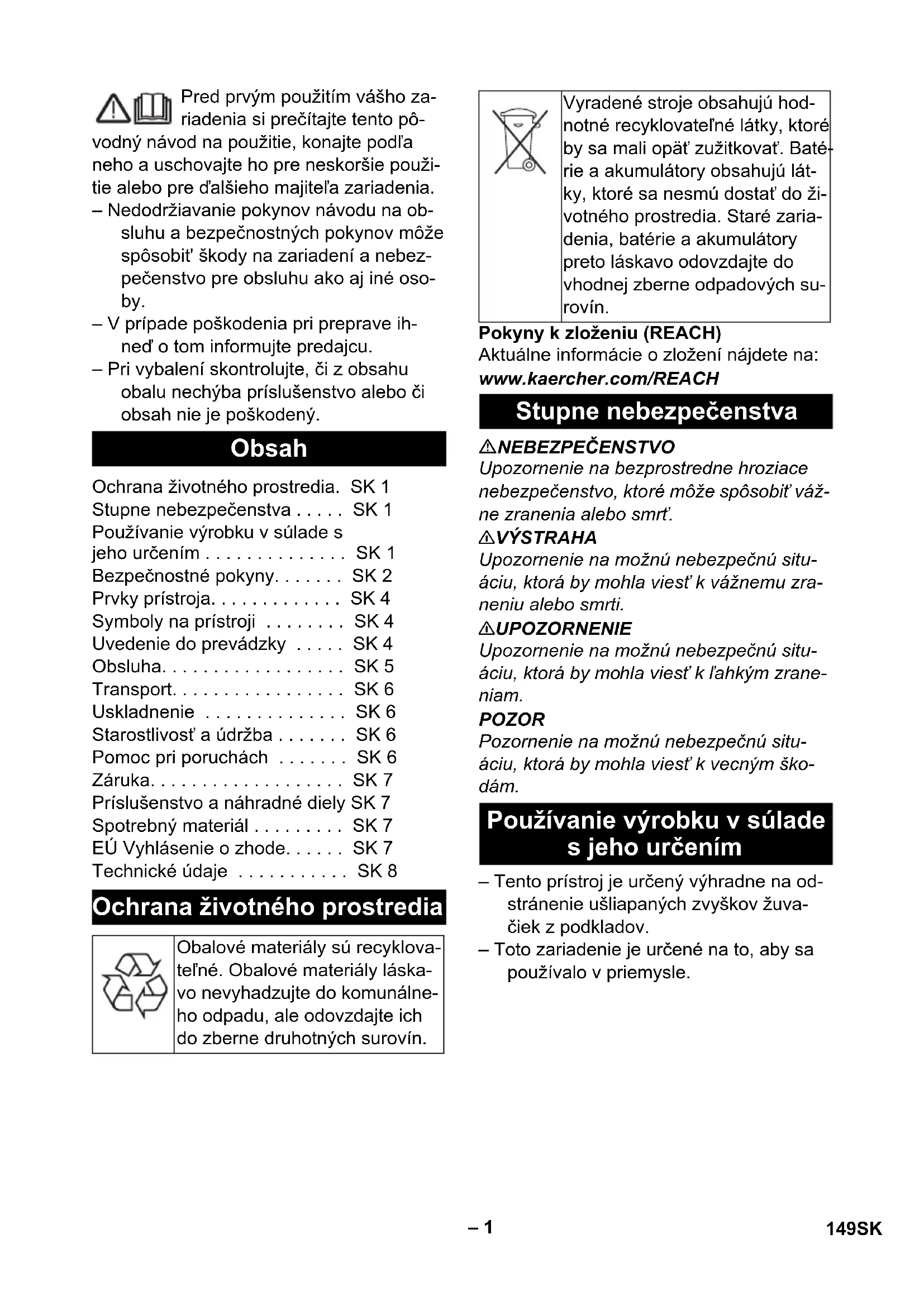 dB(A) ≤70 148 RO– 1 Pred prvým použitím vášho za- riadenia si prečítajte tento pô- vodný návod na použitie, konajte podľa neho a uschovajte ho pre neskoršie použi- tie alebo pre ďalšieho majiteľa zariadenia. – Nedodržiavanie pokynov návodu na ob- sluhu a bezpečnostných pokynov môže spôsobit' škody na zariadení a nebez- pečenstvo pre obsluhu ako aj iné oso- by. – V prípade poškodenia pri preprave ih- neď o tom informujte predajcu. – Pri vybalení skontrolujte, či z obsahu obalu nechýba príslušenstvo alebo či obsah nie je poškodený. Pokyny k zloženiu (REACH) Aktuálne informácie o zložení nájdete na: www.kaercher.com/REACH NEBEZPEČENSTVO Upozornenie na bezprostredne hroziace nebezpečenstvo, ktoré môže spôsobiť váž- ne zranenia alebo smrť. 몇 VÝSTRAHA Upozornenie na možnú nebezpečnú situ- áciu, ktorá by mohla viesť k vážnemu zra- neniu alebo smrti. 몇 UPOZORNENIE Upozornenie na možnú nebezpečnú situ- áciu, ktorá by mohla viesť k ľahkým zrane- niam. POZOR Pozornenie na možnú nebezpečnú situ- áciu, ktorá by mohla viesť k vecným ško- dám. – Tento prístroj je určený výhradne na od- stránenie ušliapaných zvyškov žuva- čiek z podkladov. – Toto zariadenie je určené na to, aby sa používalo v priemysle. Obsah Ochrana životného prostredia. SK 1 Stupne nebezpečenstva . . . . . SK 1 Používanie výrobku v súlade s jeho určením . . . . . . . . . . . . . . SK 1 Bezpečnostné pokyny. . . . . . . SK 2 Prvky prístroja. . . . . . . . . . . . . SK 4 Symboly na prístroji . . . . . . . . SK 4 Uvedenie do prevádzky . . . . . SK 4 Obsluha. . . . . . . . . . . . . . . . . . SK 5 Transport. . . . . . . . . . . . . . . . . SK 6 Uskladnenie . . . . . . . . . . . . . . SK 6 Starostlivosť a údržba . . . . . . . SK 6 Pomoc pri poruchách . . . . . . . SK 6 Záruka. . . . . . . . . . . . . . . . . . . SK 7 Príslušenstvo a náhradné diely SK 7 Spotrebný materiál . . . . . . . . . SK 7 EÚ Vyhlásenie o zhode. . . . . . SK 7 Technické údaje . . . . . . . . . . . SK 8 Ochrana životného prostredia Obalové materiály sú recyklova- teľné. Obalové materiály láska- vo nevyhadzujte do komunálne- ho odpadu, ale odovzdajte ich do zberne druhotných surovín. Vyradené stroje obsahujú hod- notné recyklovateľné látky, ktoré by sa mali opäť zužitkovať. Baté- rie a akumulátory obsahujú lát- ky, ktoré sa nesmú dostať do ži- votného prostredia. Staré zaria- denia, batérie a akumulátory preto láskavo odovzdajte do vhodnej zberne odpadových su- rovín. Stupne nebezpečenstva Používanie výrobku v súlade s jeho určením 149SK– 2 – Popri pokynoch v návode na obsluhu je potrebné zohľadniť aj všeobecné bez- pečnostné predpisy vyplývajúce zo zá- konov. – Štítky s varovaním a upozornením, umiestnené na stroji, podávajú dôležité pokyny pre bezpečnú prevádzku. NEBEZPEČENSTVO Nebezpečenstvo zranenia! – Obsluha musí používať prístroj v súlade s určením. Musí zohľadniť miestne danosti a pri práci s prístrojom dávať pozor na tretie osoby, obzvlášť na deti. – Prístroj sa nesmie nikdy ponechať bez dozoru, kým je v činnosti. – Prístroj smú používať iba osoby, ktoré sú poučené o ovládaní alebo preukázali svoje schopnosti obsluhovať ho a sú výslovne poverené jeho používaním. Prístroj nesmú prevádzkovať deti alebo mladiství. – Toto zariadenie nie je určené na to, aby ho používali osoby s obmedzenými fy- zickými, zmyslovými alebo duševnými schopnosťami. – Deti by mali byť pod dozorom, aby sa zaistilo, že sa so zariadením nehrajú. – Práce na zariadení vždy vykonávajte s vhodnými rukavicami. – Na prístroji/príslušenstve sa nesmú vy- konávať žiadne zmeny. – Aby sa zabránilo vzniku nebezpečných situácií, môže opravy a výmenu náh- radných dielov prístroja vykonávať len autorizované servisné stredisko. – Obalové fólie uchovávajte mimo dosa- hu detí. Vzniká nebezpečenstvo uduse- nia! NEBEZPEČENSTVO