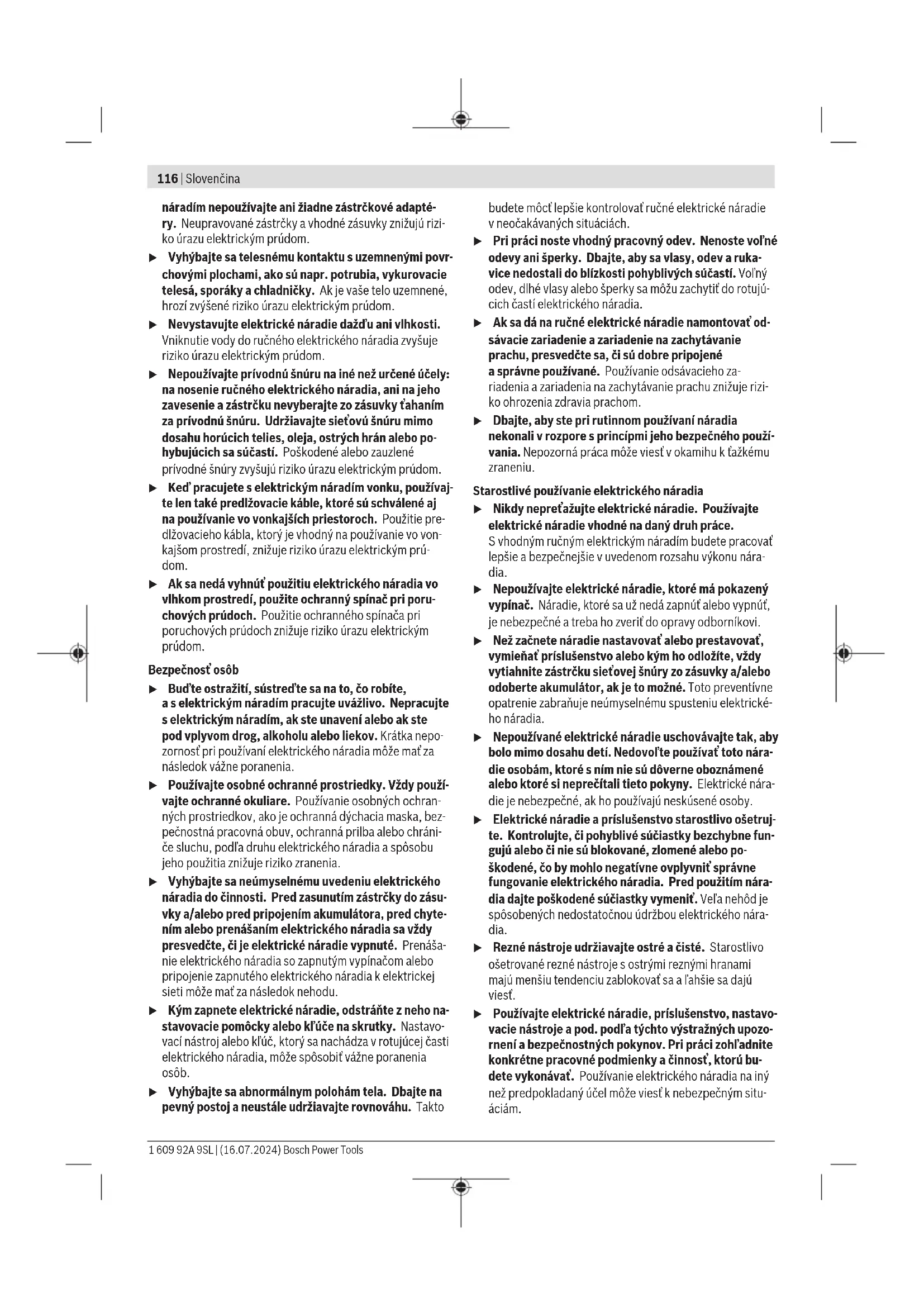 Úroveň vibrácií ahodnota emisií hluku uvedené vtýchto po- kynoch boli namerané podľa normovaného meracieho po- stupu adajú sa použiť na vzájomné porovnávanie elektrické- ho náradia. Hodia sa aj na predbežný odhad emisie vibrácií ahluku. Uvedená úroveň vibrácií ahodnota emisií hluku reprezentuje hlavné spôsoby použitia elektrického náradia. Ak sa však elektrické náradie využíva na iné spôsoby použitia, sodlišný- mi vkladacími nástrojmi alebo pri nedostatočnej údržbe, mô- že sa úroveň vibrácií ahodnota emisií hlukuodlišovať. To môže emisiu vibrácií ahluku počas celého pracovného času výrazne zvýšiť. Na presný odhad emisií vibrácií ahluku by sa mal zohľadniť aj čas, vpriebehu ktorého je náradie vypnuté alebo síce spustené, ale vskutočnosti sa nepoužíva. To môže emisie vibrácií ahluku počas celého pracovného času výrazne zní- žiť. Na ochranu obsluhujúcej osoby pred pôsobením vibrácií ur- čite doplnkové bezpečnostné opatrenia, ako napríklad: údrž- ba elektrického náradia avkladacích nástrojov, udržiavanie správnej teploty rúk, organizácia pracovných procesov. Upozornenia týkajúce sa presnosti Zníženie otáčok (zvlášť pod 50%) môže mať za následok zní- ženie maximálneho krútiaceho momentu. Zvýšené otáčky pri Power Boost môžu mať vplyv na presnosť asprávanie pri vy- pínaní. Môže dôjsť kzopnutiu spojky. Výkonnostné skúšky náradia sa obvykle robia pri 600ot/min podľa VDI2647. Zmeny otáčok a/alebo krútiaceho momentu môžu ovplyvniť presnosť. Výkonnosť náradia sdaným nastavením je nutné odskúšať . Akumulátor Bosch predáva akumulátorové elektrické náradie aj bez aku- mulátora. Informáciu, či je súčasťou dodávky vášho elektric- kého náradia akumulátor, nájdete na obale. Bosch Power Tools 1 609 92A 9SL | (16.07.2024)120 | Slovenčina Nabíjanie akumulátora u Používajte len nabíjačky uvedené vtechnických úda- joch. Len tieto nabíjačky sú prispôsobené na lítium-ió- nový akumulátor používaný pri vašom elektrickom náradí. Upozornenie: Lítiovo-iónové akumulátory sa na základe medzinárodných dopravných predpisov dodávajú čiastočne nabité. Aby ste zaručili plný výkon akumulátora, pred prvým použitím ho úplne nabite. Vkladanie akumulátora Zasuňte nabitý akumulátor do uchytenia akumulátora tak, aby zaskočil. Vyberanie akumulátora Na vybratie akumulátora stlačte odisťovacie tlačidlá akumu- látora aakumulátor vytiahnite von. Nepoužívajte pritom ne- primeranú silu. Ukazovateľ stavu nabitia akumulátora (žltá LED) Indikácia stavu nabitia akumulátora Význam Blikajúce svetlo + zvukový sig- nál Nabiť akumulátor: Možných je už len 6–8 skrutkovaní. Neprerušo- vané svetlo + zvukový sig- nál Kapacita už nestačí na ďalšie skrutkovanie alebo elektrické náradie bolo preťažené: Elektrické náradie sa už nedá zapnúť. – Vyberte akumulátor avložte úplne nabitý akumulátor. Blikajúce svetlo Elektrické náradie je prehriate aje mimo prevádzky: – Počkajte chvíľu, kým sa blikanie po krát- kej chvíli automaticky vypne, až potom začnite selektrickým náradím opäť pracovať. Pri zasunutí akumulátora(9) astlačení vypínača(5) indiká- cia stavu nabitia akumulátora zobrazí na 5sekúnd stav nabi- tia akumulátora. Indikácia stavu nabitia akumulá- tora Kapacita Zelená 60–100% Žltá 30–60% Červená 0–30% Pokyny na optimálne zaobchádzanie sakumulátorom Chráňte akumulátor pred vlhkosťou avodou. Akumulátor skladujte iba pri teplote vrozsahu od –20°C do 50°C. Nenechávajte akumulátor napríklad vlete položený vautomobile. Výrazne skrátená doba prevádzky akumulátora po nabití sig- nalizuje, že akumulátor je opotrebovaný atreba ho vymeniť za nový. Dodržiavajte upozornenia týkajúce sa likvidácie. Montáž u Pred vykonávaním akýchkoľvek prác na elektrickom náradí (napr. údržba, výmena nástroja atď.) vyberte zelektrického náradia akumulátor. Vprípade neúmy- selného stlačenia zapínača/vypínača hrozí nebezpečen- stvo poranenia. Podmienky prevádzky askladovania Toto elektrické náradie je vhodné výlučne na prevádzku vuzavretých priestoroch. Pre bezchybnú prevádzku by mala byť prípustná teplota okolia od 0°C do +45°C pri relatívnej vlhkosti vzduchu 20 až 95% bez kondenzácie. Závesný prípravok (pozri obrázok A) Pomocou závesného strmienka (11) môžete elektrické nára- die upevniť na závesný prípravok. – Nasaďte závesný strmienok (11) na elektrické náradie anechajte ho zapadnúť do otvorov (12). u Pravidelne kontrolujte stav závesného strmienka ahá- čika závesného prípravku. Konfigurovanie ručného elektrického náradia Pomocou softvéru BOSCH EXACT Configurator od verzie 5.2 avyššej môžete na elektrickom náradí nakonfigurovať rôzne nastavenia (napr. otáčky, stupne skrutkovania, ochrana proti opakovaniu). Na tento účel je potrebné spojiť elektrické náradie spočítačom pomocou rozhrania USB. Použite na to USB kábel: USB2.0TypA/Micro-USB2.0TypB – Dvojnásobne tienený – Max. dĺžka 1m Pri konfigurovaní pomocou USB rozhrania môže mimo priemyselného prostredia dochádzať krádiovému rušeniu. u Rešpektujte všetky bezpečnostné upozornenia apokyny vnávode na používanie softvéru. Výmena nástroja (pozri obrázok B) u Pri vkladaní pracovného nástroja dávajte pozor na to, aby spoľahlivo sedel vupínacom mechanizme. Ak by pracovný nástroj nebol pevne spojený supínacím mecha- nizmom, mohol by sa uvoľniť auž by sa stal nekontrolova- teľným. Vkladanie pracovného nástroja Používajte len pracovné nástroje svhodným zasúvacím kon- com (1/4" šesťhran). – Objímku rýchlovýmenného skľučovadla (2) potiahnite do- predu. – Pracovný nástroj (13) vsuňte do upínacieho mechanizmu (1