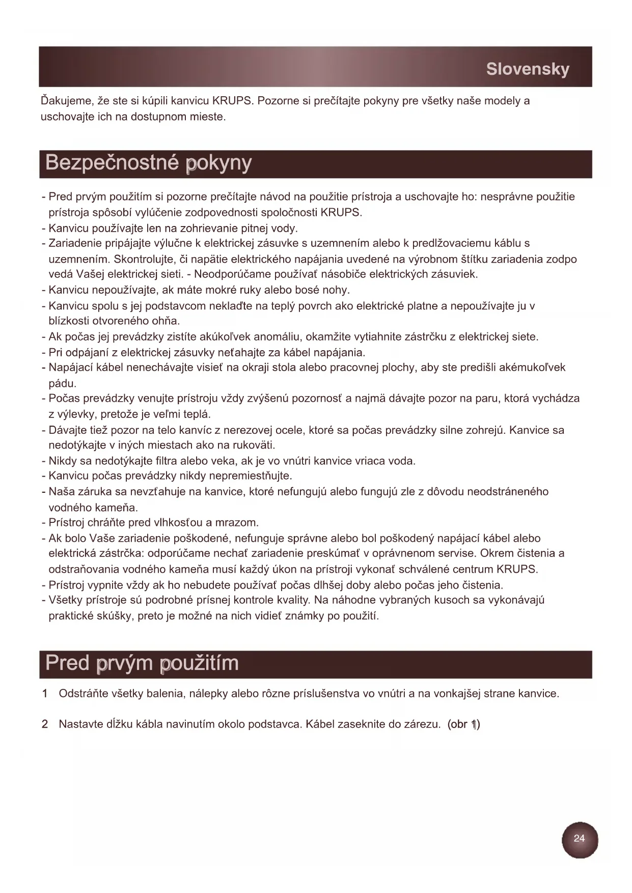 - Pred prvým použitím si pozorne prečítajte návod na použitie prístroja a uschovajte ho: nesprávne použitie prístroja spôsobí vylúčenie zodpovednosti spoločnosti KRUPS. - Kanvicu používajte len na zohrievanie pitnej vody. - Zariadenie pripájajte výlučne k elektrickej zásuvke s uzemnením alebo k predlžovaciemu káblu s uzemnením. Skontrolujte, či napätie elektrického napájania uvedené na výrobnom štítku zariadenia zodpo vedá Vašej elektrickej sieti. - Neodporúčame používať násobiče elektrických zásuviek. - Kanvicu nepoužívajte, ak máte mokré ruky alebo bosé nohy. - Kanvicu spolu s jej podstavcom neklaďte na teplý povrch ako elektrické platne a nepoužívajte ju v blízkosti otvoreného ohňa. - Ak počas jej prevádzky zistíte akúkoľvek anomáliu, okamžite vytiahnite zástrčku z elektrickej siete. - Pri odpájaní z elektrickej zásuvky neťahajte za kábel napájania. - Napájací kábel nenechávajte visieť na okraji stola alebo pracovnej plochy, aby ste predišli akémukoľvek pádu. - Počas prevádzky venujte prístroju vždy zvýšenú pozornosť a najmä dávajte pozor na paru, ktorá vychádza z výlevky, pretože je veľmi teplá. - Dávajte tiež pozor na telo kanvíc z nerezovej ocele, ktoré sa počas prevádzky silne zohrejú. Kanvice sa nedotýkajte v iných miestach ako na rukoväti. - Nikdy sa nedotýkajte filtra alebo veka, ak je vo vnútri kanvice vriaca voda. - Kanvicu počas prevádzky nikdy nepremiestňujte. - Naša záruka sa nevzťahuje na kanvice, ktoré nefungujú alebo fungujú zle z dôvodu neodstráneného vodného kameňa. - Prístroj chráňte pred vlhkosťou a mrazom. - Ak bolo Vaše zariadenie poškodené, nefunguje správne alebo bol poškodený napájací kábel alebo elektrická zástrčka: odporúčame nechať zariadenie preskúmať v oprávnenom servise. Okrem čistenia a odstraňovania vodného kameňa musí každý úkon na prístroji vykonať schválené centrum KRUPS. - Prístroj vypnite vždy ak ho nebudete používať počas dlhšej doby alebo počas jeho čistenia. - Všetky prístroje sú podrobné prísnej kontrole kvality. Na náhodne vybraných kusoch sa vykonávajú praktické skúšky, preto je možné na nich vidieť známky po použití.
