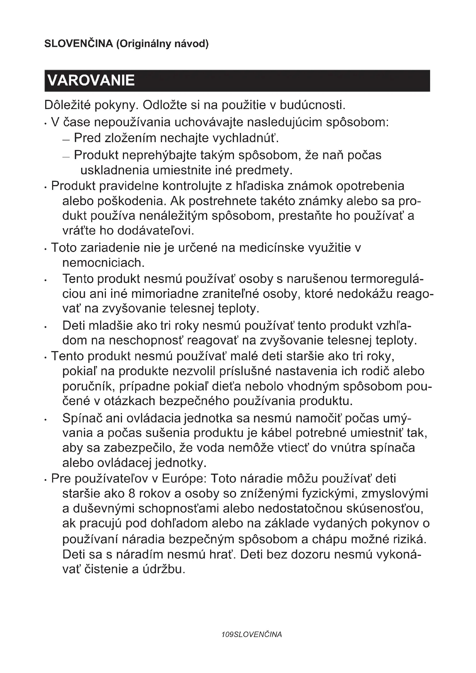 - Tento produkt nesmú používať osoby s narušenou termoregulá- ciou ani iné mimoriadne zraniteľné osoby, ktoré nedokážu reago- vať na zvyšovanie telesnej teploty.
