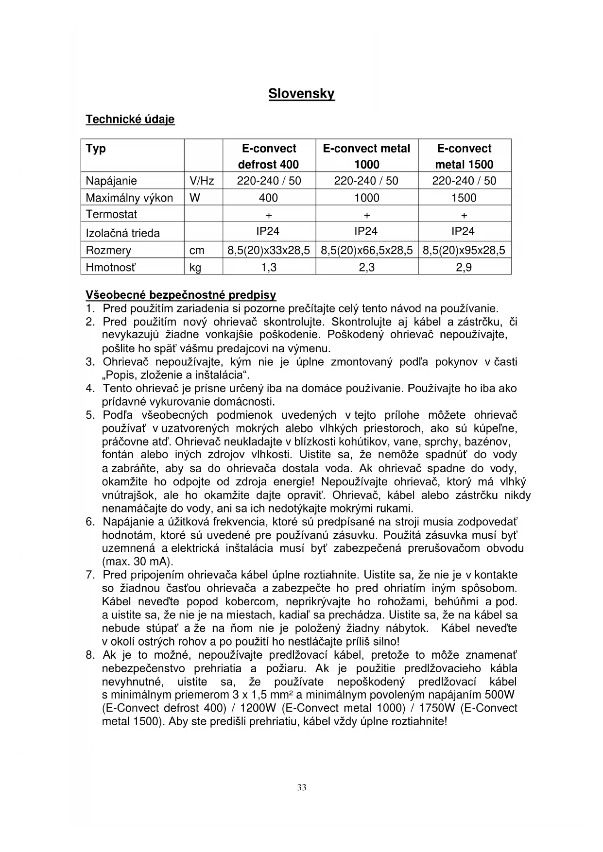 nebezpečenstvo prehriatia a požiaru. Ak je použitie predlžovacieho kábla nevyhnutné, uistite sa, že používate nepoškodený predlžovací kábel s minimálnym priemerom 3 x 1,5 mm² a minimálnym povoleným napájaním 500W (E-Convect defrost 400) / 1200W (E-Convect metal 1000) / 1750W (E-Convect metal 1500). Aby ste predišli prehriatiu, kábel vždy úplne roztiahnite!34