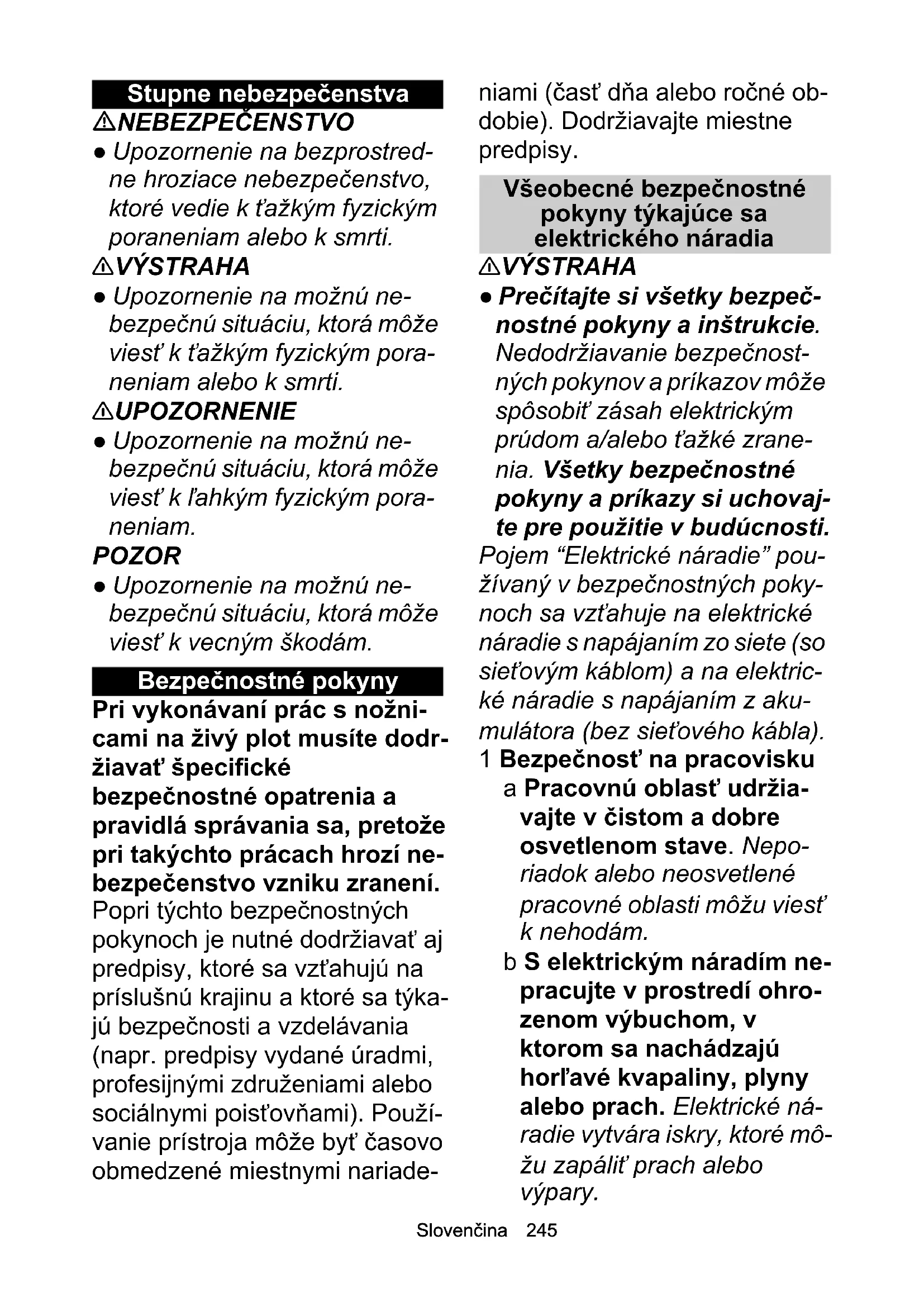 - EÚ vyhlásenie o zhode Slovenčina 245 Stupne nebezpečenstva NEBEZPEČENSTVO ● Upozornenie na bezprostred- ne hroziace nebezpečenstvo, ktoré vedie k ťažkým fyzickým poraneniam alebo k smrti. 몇 VÝSTRAHA ● Upozornenie na možnú ne- bezpečnú situáciu, ktorá môže viesť k ťažkým fyzickým pora- neniam alebo k smrti. 몇 UPOZORNENIE ● Upozornenie na možnú ne- bezpečnú situáciu, ktorá môže viesť k ľahkým fyzickým pora- neniam. POZOR ● Upozornenie na možnú ne- bezpečnú situáciu, ktorá môže viesť k vecným škodám. Bezpečnostné pokyny Pri vykonávaní prác s nožni- cami na živý plot musíte dodr- žiavať špecifické bezpečnostné opatrenia a pravidlá správania sa, pretože pri takýchto prácach hrozí ne- bezpečenstvo vzniku zranení. Popri týchto bezpečnostných pokynoch je nutné dodržiavať aj predpisy, ktoré sa vzťahujú na príslušnú krajinu a ktoré sa týka- jú bezpečnosti a vzdelávania (napr. predpisy vydané úradmi, profesijnými združeniami alebo sociálnymi poisťovňami). Použí- vanie prístroja môže byť časovo obmedzené miestnymi nariade- niami (časť dňa alebo ročné ob- dobie). Dodržiavajte miestne predpisy. Všeobecné bezpečnostné pokyny týkajúce sa elektrického náradia 몇 VÝSTRAHA ● Prečítajte si všetky bezpeč- nostné pokyny a inštrukcie. Nedodržiavanie bezpečnost- ných pokynov a príkazov môže spôsobiť zásah elektrickým prúdom a/alebo ťažké zrane- nia. Všetky bezpečnostné pokyny a príkazy si uchovaj- te pre použitie v budúcnosti. Pojem “Elektrické náradie” pou- žívaný v bezpečnostných poky- noch sa vzťahuje na elektrické náradie s napájaním zo siete (so sieťovým káblom) a na elektric- ké náradie s napájaním z aku- mulátora (bez sieťového kábla). 1 Bezpečnosť na pracovisku a Pracovnú oblasť udržia- vajte v čistom a dobre osvetlenom stave. Nepo- riadok alebo neosvetlené pracovné oblasti môžu viesť k nehodám. b S elektrickým náradím ne- pracujte v prostredí ohro- zenom výbuchom, v ktorom sa nachádzajú horľavé kvapaliny, plyny alebo prach. Elektrické ná- radie vytvára iskry, ktoré mô- žu zapáliť prach alebo výpary.246 Slovenčina c Počas používania elektric- kého náradia sa v blízkosti nesmú zdržiavať deti ale- bo ďalšie osoby. Nesústre- denosť môže viesť k strate kontroly nad prístrojom. 2 Elektrická bezpečnosť a Pripájacia zástrčka elek- trického náradia musí byť vhodná pre príslušnú zá- suvku. Nesmie byť vyko- naná žiadna zmena zástrčky. Spolu s elektric- kým náradím s ochranným uzemnením nepoužívajte adaptérové zástrčky. Ne- zmenené zástrčky a vhodné zásuvky znižujú riziko zása- hu elektrickým prúdom. b Zabráňte telesnému styku s uzemnenými povrchmi, akými sú rúry, vykurova- cieho telesá, sporáky a chladničky. Ak je vaše telo uzemnené, tak hrozí zvýše- né riziko zásahu elektrickým prúdom. c Elektrické náradie chráňte pred dažďom a vlhkosťou. Vniknutie vody do elektrické- ho náradia zvyšuje riziko zá- sahu elektrickým prúdom. d Kábel nepoužívajte v roz- pore s jeho účelom, naprí- klad na nosenie elektrického náradia, jeho zavesenie alebo na vytiah- nutie zástrčky zo zásuvky. Kábel chráňte pred nad- merným teplom, olejom, ostrými hranami alebo po- hybujúcimi sa časťami prí- stroja. Poškodené alebo zapletené pripájacie káble zvyšujú riziko zásahu elek- trickým prúdom. e Ak s elektrickým náradím pracujete vonku, tak pou- žívajte len predlžovacie káble, ktoré sú vhodné aj na používanie v exteriéri. Používanie predlžovacieho kábla vhodného pre exteriér znižuje riziko zásahu elek- trickým prúdom. f Ak nie je možné zabrániť použitiu elektrického ná- radia vo vlhkom prostredí, tak použite prúdový chrá- nič. Používanie prúdového chrániča znižuje riziko zása- hu elektrickým prúdom. 3 Bezpečnosť osôb a Buďte pozorní, dávajte po- zor na to, čo robíte, a pri práci s elektrickým nára- dím postupujte s rozva- hou. Elektrické náradie nepoužívajte, ak ste una- vení alebo pod vplyvom drog, alkoholu alebo lie- kov. Moment nepozornosti pri používaní elektrického náradia môže viesť k vzniku vážnych zranení. p. 256