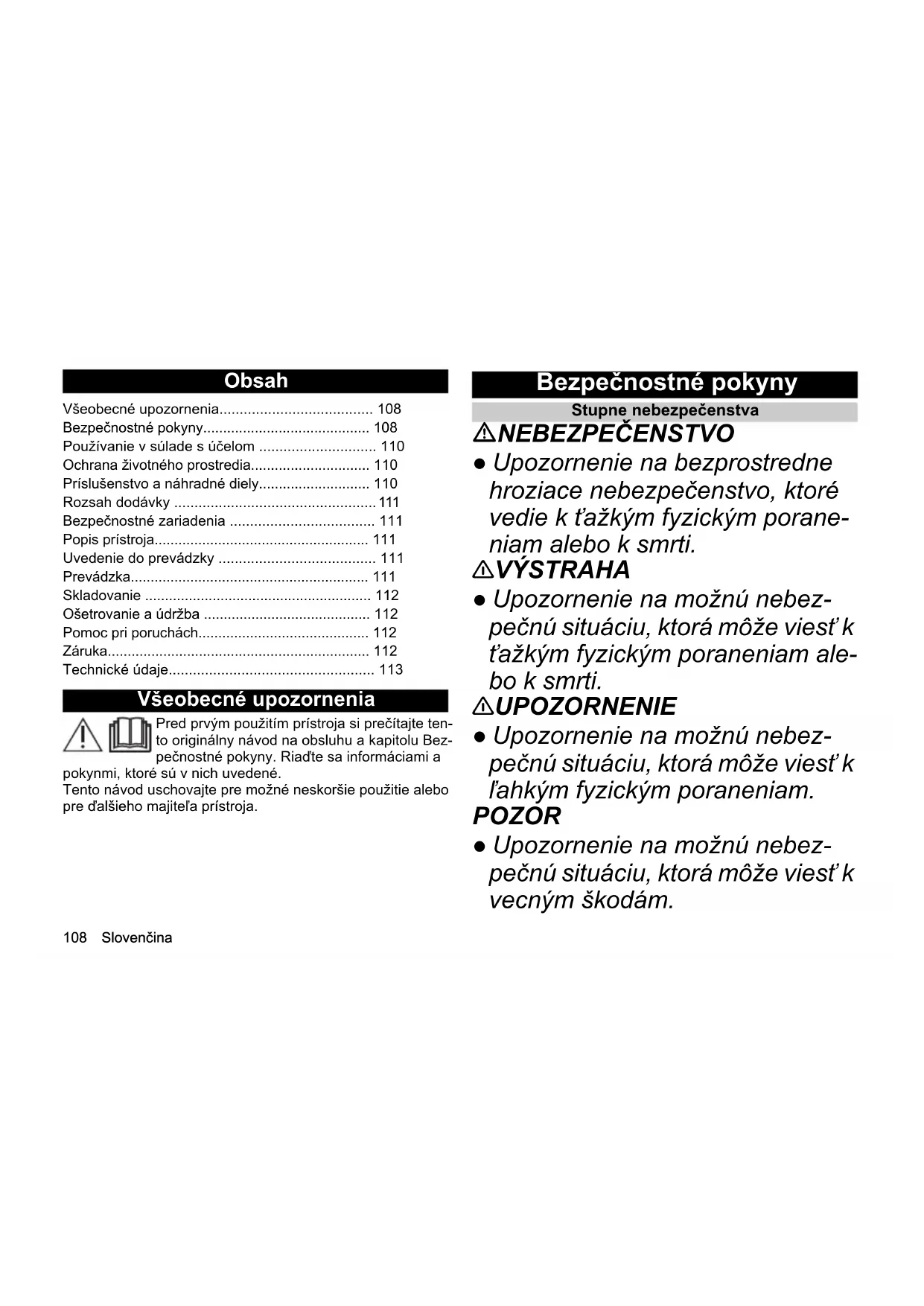 - dB(A) 68108 Slovenčina Obsah Všeobecné upozornenia Pred prvým použitím prístroja si prečítajte ten- to originálny návod na obsluhu a kapitolu Bez- pečnostné pokyny. Riaďte sa informáciami a pokynmi, ktoré sú v nich uvedené. Tento návod uschovajte pre možné neskoršie použitie alebo pre ďalšieho majiteľa prístroja. Bezpečnostné pokyny Stupne nebezpečenstva NEBEZPEČENSTVO ● Upozornenie na bezprostredne hroziace nebezpečenstvo, ktoré vedie k ťažkým fyzickým porane- niam alebo k smrti. 몇 VÝSTRAHA ● Upozornenie na možnú nebez- pečnú situáciu, ktorá môže viesť k ťažkým fyzickým poraneniam ale- bo k smrti. 몇 UPOZORNENIE ● Upozornenie na možnú nebez- pečnú situáciu, ktorá môže viesť k ľahkým fyzickým poraneniam. POZOR ● Upozornenie na možnú nebez- pečnú situáciu, ktorá môže viesť k vecným škodám. Všeobecné upozornenia p. 108