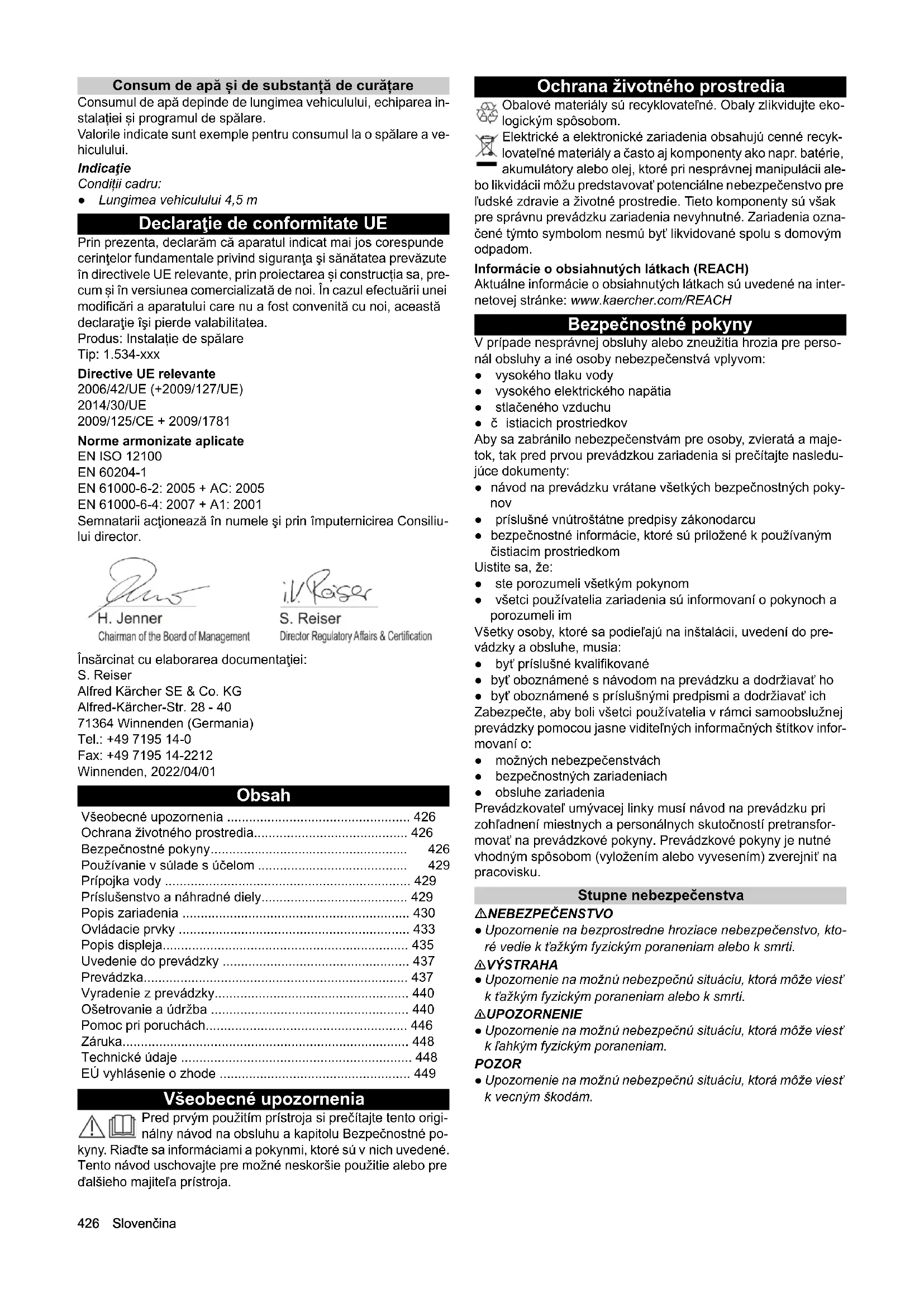 • EÚ vyhlásenie o zhode Slovenčina 427 Predpisy a smernice Na prevádzku tohto zariadenia sa v Spolkovej republike Nemec- ko vzťahujú nasledujúce predpisy a smernice (dostupné pro- stredníctvom spoločnosti Carl Heymanns Verlag KG, Luxemburger Straße 449, 50939 Kolín): ● Predpisy o prevencii úrazov “Všeobecné predpisy” BGV A1 ● Bezpečnosť umývacích liniek pre vozidlá EN 17281 ● Nariadenie o prevádzkovej bezpečnosti (BetrSichV) Umývacie linky pre vozidlá Obsluhou, dohľadom, starostlivosťou, údržbou a kontrolou umý- vacích liniek pre vozidlá smú byť poverené len osoby, ktoré sú oboznámené s týmito prácami a návodom na prevádzku a záro- veň boli poučené o nebezpečenstvách súvisiacich so zariade- ním. Odpadová voda s obsahom minerálnych olejov POZOR Znečistenie životného prostredia vozidlami Unikajúce oleje. Chráňte pôdu a použitý olej likvidujte ekologickým spôsobom. Zabráňte preniknutiu prevodových olejov a odpadovej vody s ob- sahom minerálnych olejov do pôdy alebo vôd. Odpadovú vodu pred jej odvedením do kanalizácie upravte. Dodržiavajte miestne platné zákonné ustanovenia a predpisy tý- kajúce sa odpadovej vody. Samoobsluha V prípade samoobslužných umývacích liniek musí byť počas pre- vádzkovej pohotovosti k dispozícii osoba, ktorá je oboznámená s umývacou linkou a v prípade poruchy dokáže pre odvrátenie prí- padných nebezpečenstiev vykonať alebo iniciovať potrebné opatrenia. Pre používateľa umývacej linky musia byť na mieste umývania umiestnené dobre viditeľné informácie o obsluhe a používaní umývacej linky v súlade s jej účelom. Údržba a opravy Údržbové práce a opravy sa smú zásadne vykonávať len pri vyp- nutej umývacej linke. 몇 VÝSTRAHA Nebezpečenstvo poranenia vplyvom pohybov stroja Pred vykonávaním údržbových prác a opráv vypnite umývaciu linku. Pomocou napríklad visiaceho zámku zaistite hlavný spínač proti opätovnému zapnutiu. Prevádzka s čistiacim prostriedkom 몇 VÝSTRAHA Nebezpečenstvo v dôsledku zdraviu škodlivých látok v čis- tiacich prostriedkoch Dbajte na informácie uvedené v kartách bezpečnostných údajov čistiacich prostriedkov. Dodržiavajte predpísané ochranné opatrenia. Používajte predpísaný ochranný odev, ku ktorému patria naprí- klad ochranné okuliare a ochranné rukavice. POZOR Zvýšené nebezpečenstvo vzniku korózie v dôsledku použí- vania nevhodných čistiacich prostriedkov V zariadení nesmiete spracovávať nasledujúce čistiace pro- striedky: Čistiace prostriedky, ktoré sú určené na čistenie umývacej haly. Čistiace prostriedky, ktoré sú určené na vonkajšie čistenie umý- vacej linky. Kyslé čistiace prostriedky. Čistiace prostriedky, ktoré sa na vozidlo nanášajú pomocou sa- mostatného zariadenia (napr. čistiace prostriedky na ráfiky). Prostriedky na úpravy odpadovej vody. Vstup do portálovej umývacej linky NEBEZPEČENSTVO Nebezpečenstvo v dôsledku vstupu do portálovej umývacej linky Neoprávneným osobám zakážte vstup do portálovej umývacej linky. Jasným a trvalým spôsobom poukážte na zákaz vstupu. Nebezpečenstvo pošmyknutia sa POZOR Nebezpečenstvo pošmyknutia sa vplyvom mokra Pri vstupovaní do zariadenia používajte vhodnú obuv a pohybujte sa opatrne. Pomocou vhodných a trvalých značiek upozornite zákazníkov na nebezpečenstvo pošmyknutia sa. Obsluha zariadenia 몇 VÝSTRAHA Nebezpečenstvá v dôsledku nesprávnej obsluhy Osoby, ktoré ovládajú zariadenie, musia: byť poučené o zaobchádzaní so zariadením, disponovať dokladom o svojich schopnostiach týkajúcich sa ob- sluhy, byť výslovne poverené používaním. Návod na prevádzku musí byť prístupný všetkým členom perso- nálu obsluhy. Osoby mladšie ako 18 rokov nesmú obsluhovať zariadenie. Vý- nimkou sú učni starší ako 16 rokov, ktoré pracujú pod dozorom. 몇 VÝSTRAHA Nebezpečenstvo zakopnutia vplyvom predmetov alebo prí- vodných vedení nachádzajúcich sa na zemi Pred uvedením zariadenia do prevádzky odstráňte predmety na- chádzajúce sa na mieste umývania. Nebezpečenstvo mrazu 몇 VÝSTRAHA Nebezpečenstvo vzniku zranení a poškodení vplyvom tvor- by ľadu v zariadení Pri nebezpečenstve mrazu vypustite zo zariadenia vodu. Komunikácie pre všetky osoby udržiavajte v takom stave, aby sa na nich nešmýkalo (napr. podlahové vykurovanie, štrk). Pracovisko Zariadenie sa uvádza do prevádzky na ovládacom paneli alebo na čítačke kariet pre umývacie linky/čítačke kódov. ● Pred umývaním vozidla ho pasažieri musia opustiť. ● Počas procesu umývania je zakázané vstupovať do zariade- nia. Zdroje nebezpečenstva Všeobecné nebezpečenstvá NEBEZPEČENSTVO Nebezpečenstvo vzniku poranení vplyvom unikajúceho stla- čeného vzduchu, vody pod vysokým tlakom na výstupe z dý- zy a odlietavajúcich čiastočiek nečistôt alebo podobných predmetov v oblasti rotujúcich kief! Uvoľňujúce sa čiastočky nečistôt alebo predmety môžu poraniť osoby alebo zvieratá. Stlačený vzduch alebo voda pod vysokým tlakom môžu byť aj pri vypnutom zariadení ešte stále pod tlakom. Na podlahe haly sa nesmú nachádzať voľne ležiace predmety. Zariadenie so stlačeným vzduchom resp. vysokotlakový systém obsluhujte opatrne. Pri údržbových prácach používajte ochranné okuliare.428 Slovenčina Nebezpečenstvo výbuchu NEBEZPEČENSTVO Nebezpečenstvo výbuchu Zariadenie neprevádzkujte v blízkosti priestorov ohrozených vý- buchom. Výnimkou sú zariadenia, ktoré sú na takéto účely vý- slovne určené a ktoré disponujú príslušným označením Ako čistiace prostriedky nepoužívajte žiadne výbušné alebo je- dovaté látky, medzi ktoré patria napr.: ● benzín ● vykurovací olej alebo nafta ● rozpúšťadlo ● kvapaliny obsahujúce rozpúšťadlá ● kyseliny ● acetón Upozornenie 