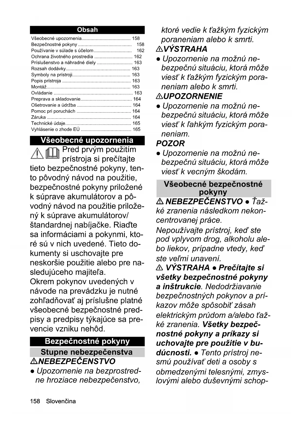 - 1,5 Chairman of the Board of ManagementDirector Regulatory Affairs & CertificationH. JennerS. Reiser158 Slovenčina Obsah Všeobecné upozornenia Pred prvým použitím prístroja si prečítajte tieto bezpečnostné pokyny, ten- to pôvodný návod na použitie, bezpečnostné pokyny priložené k súprave akumulátorov a pô- vodný návod na použitie prilože- ný k súprave akumulátorov/ štandardnej nabíjačke. Riaďte sa informáciami a pokynmi, kto- ré sú v nich uvedené. Tieto do- kumenty si uschovajte pre neskoršie použitie alebo pre na- sledujúceho majiteľa. Okrem pokynov uvedených v návode na prevádzku je nutné zohľadňovať aj príslušne platné všeobecné bezpečnostné pred- pisy a predpisy týkajúce sa pre- vencie vzniku nehôd. Bezpečnostné pokyny Stupne nebezpečenstva NEBEZPEČENSTVO ● Upozornenie na bezprostred- ne hroziace nebezpečenstvo, ktoré vedie k ťažkým fyzickým poraneniam alebo k smrti. 몇 VÝSTRAHA ● Upozornenie na možnú ne- bezpečnú situáciu, ktorá môže viesť k ťažkým fyzickým pora- neniam alebo k smrti. 몇 UPOZORNENIE ● Upozornenie na možnú ne- bezpečnú situáciu, ktorá môže viesť k ľahkým fyzickým pora- neniam. POZOR ● Upozornenie na možnú ne- bezpečnú situáciu, ktorá môže viesť k vecným škodám. Všeobecné bezpečnostné pokyny NEBEZPEČENSTVO ● Ťaž- ké zranenia následkom nekon- centrovanej práce. Nepoužívajte prístroj, keď ste pod vplyvom drog, alkoholu ale- bo liekov, prípadne vtedy, keď ste veľmi unavení. 몇 VÝSTRAHA ● Prečítajte si všetky bezpečnostné pokyny a inštrukcie. Nedodržiavanie bezpečnostných pokynov a prí- kazov môže spôsobiť zásah elektrickým prúdom a/alebo ťaž- ké zranenia. Všetky bezpeč- nostné pokyny a príkazy si uchovajte pre použitie v bu- dúcnosti. ● Tento prístroj ne- smú používať deti a osoby s obmedzenými telesnými, zmys- lovými alebo duševnými schop- Všeobecné upozornenia p. 158
