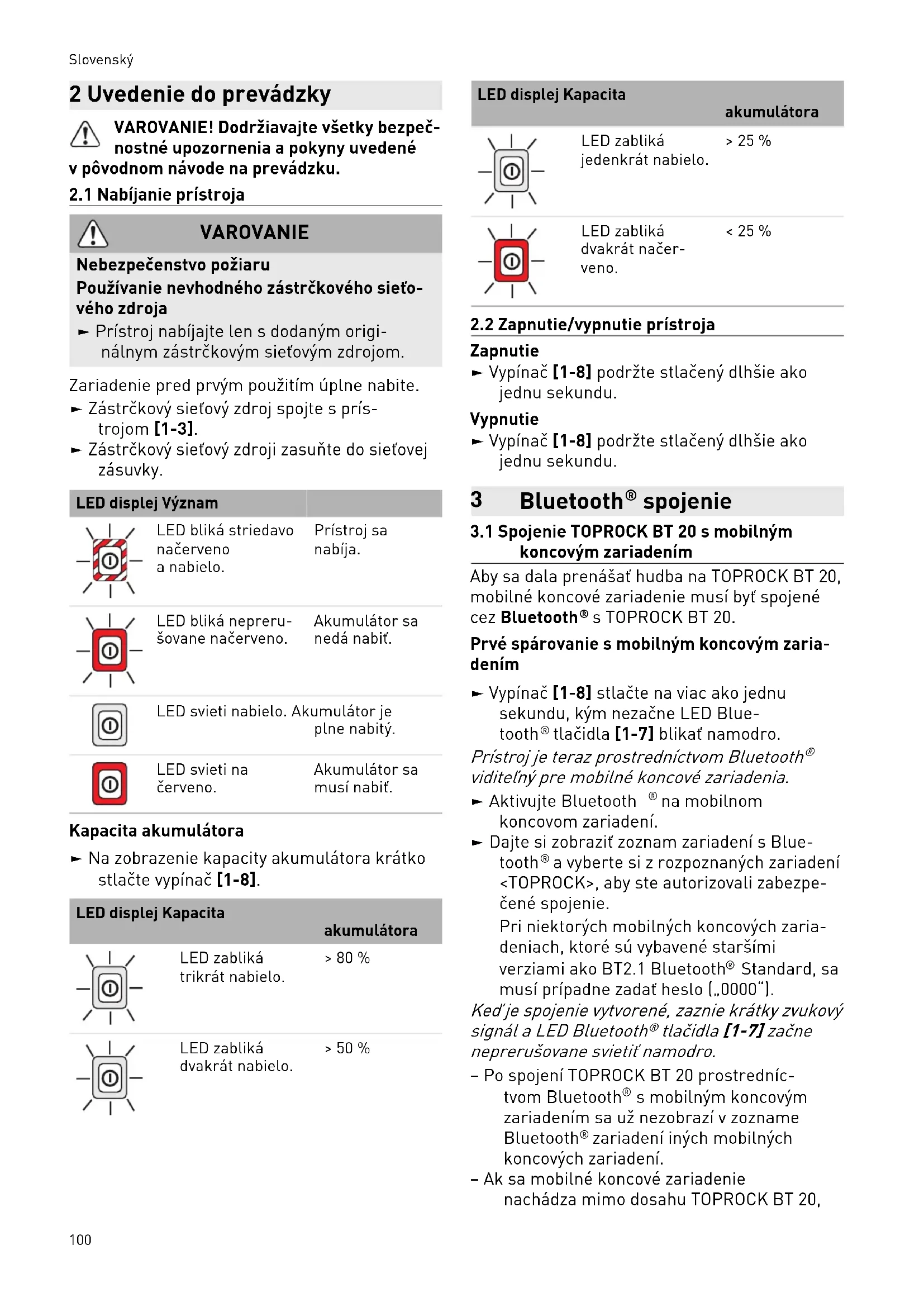- Vykon Bluetooth® spojenia moze byt'v závislosti od pripojeného mobilného koncového zariadenia odliśny. Pred spojenim s TOPROCK BT 20 vždy skontrolujte funkć-nostBluetooth® mobilného koncového zariadenia.